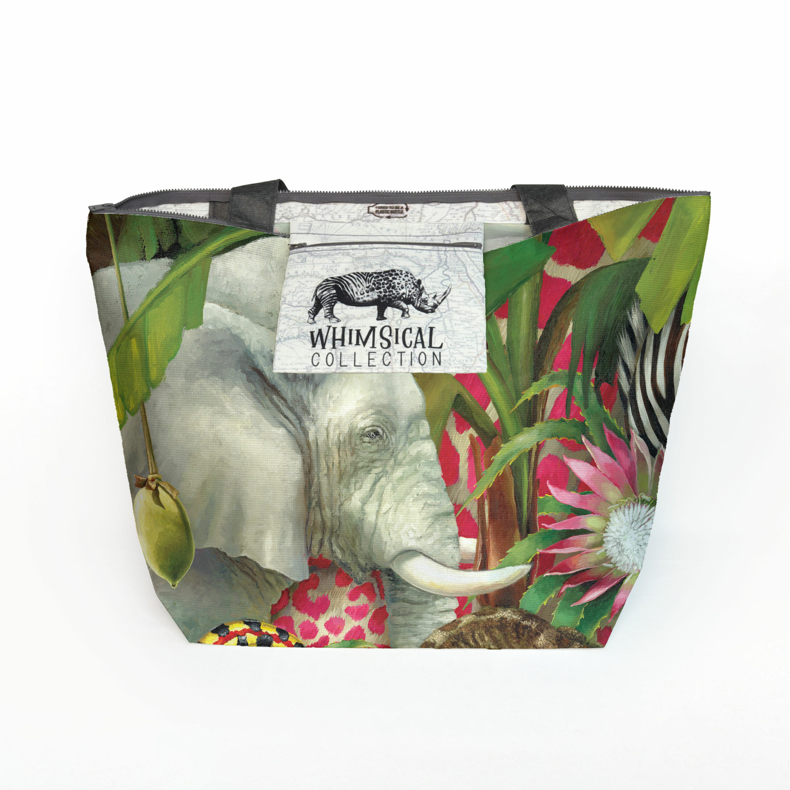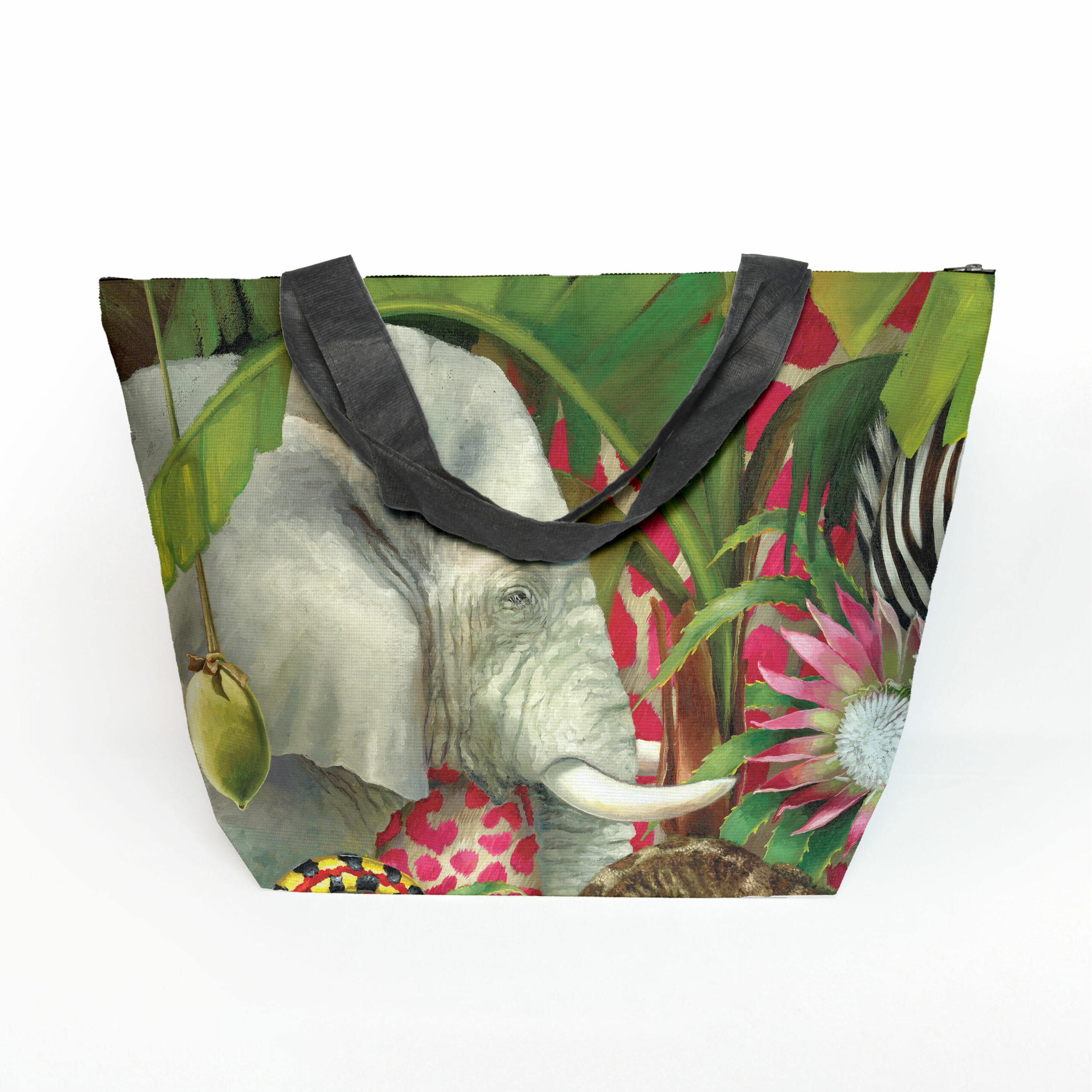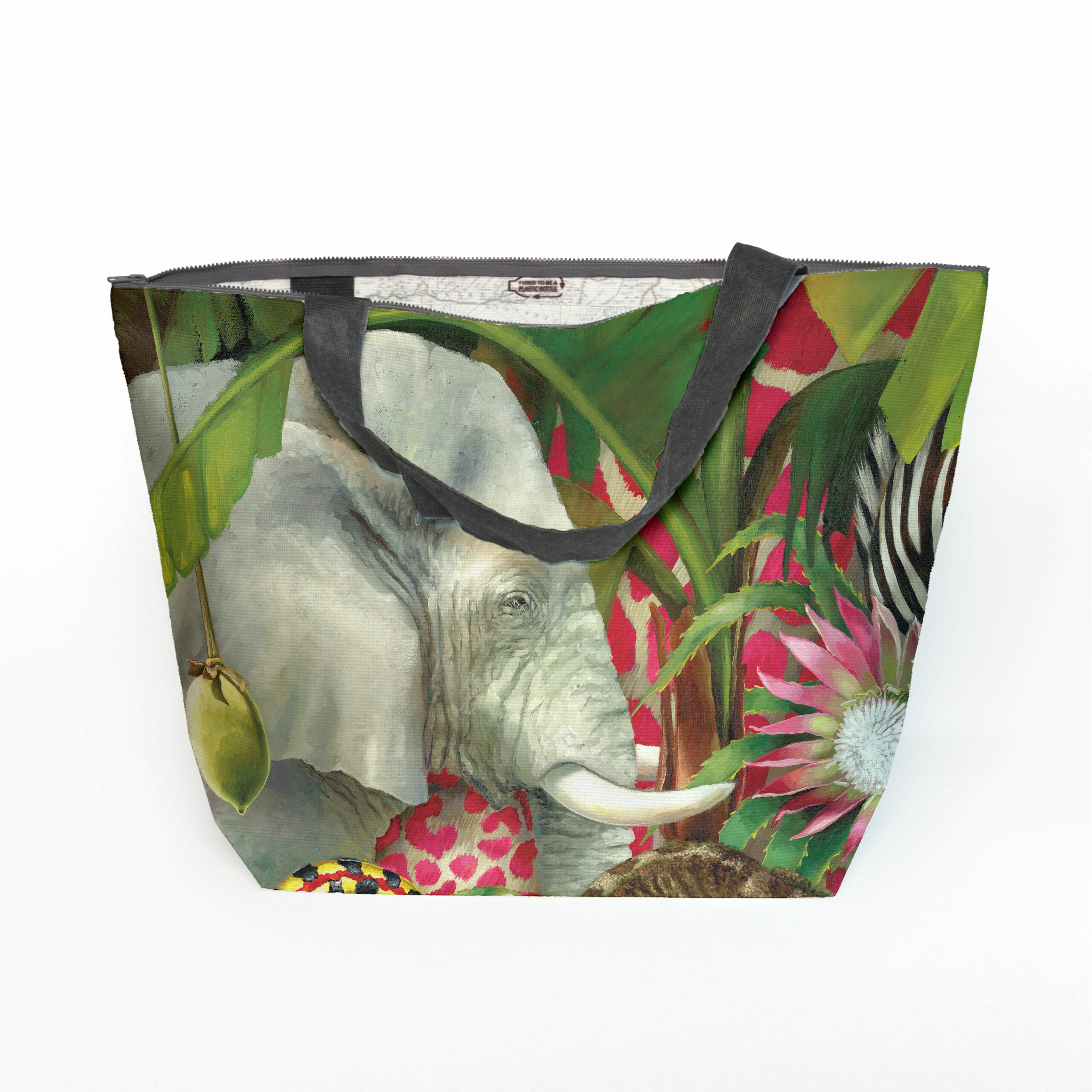 Maxi beach bag made from recycled fabric featuring 'African Jungle Elephant' from Whimsical Collection's 'African Jungle' range.  The original painting was done in oils on canvas by South African artist Dezireë Smith.