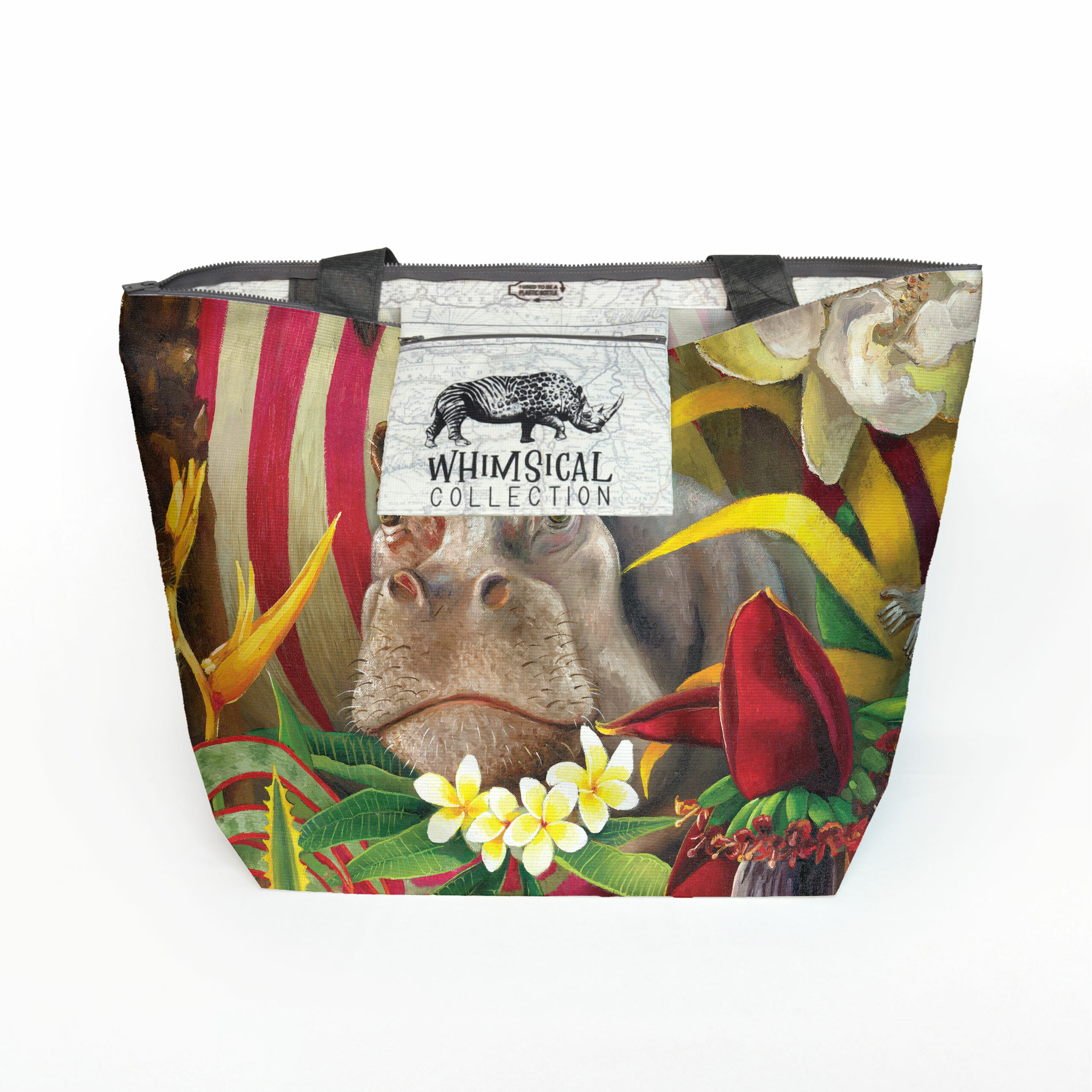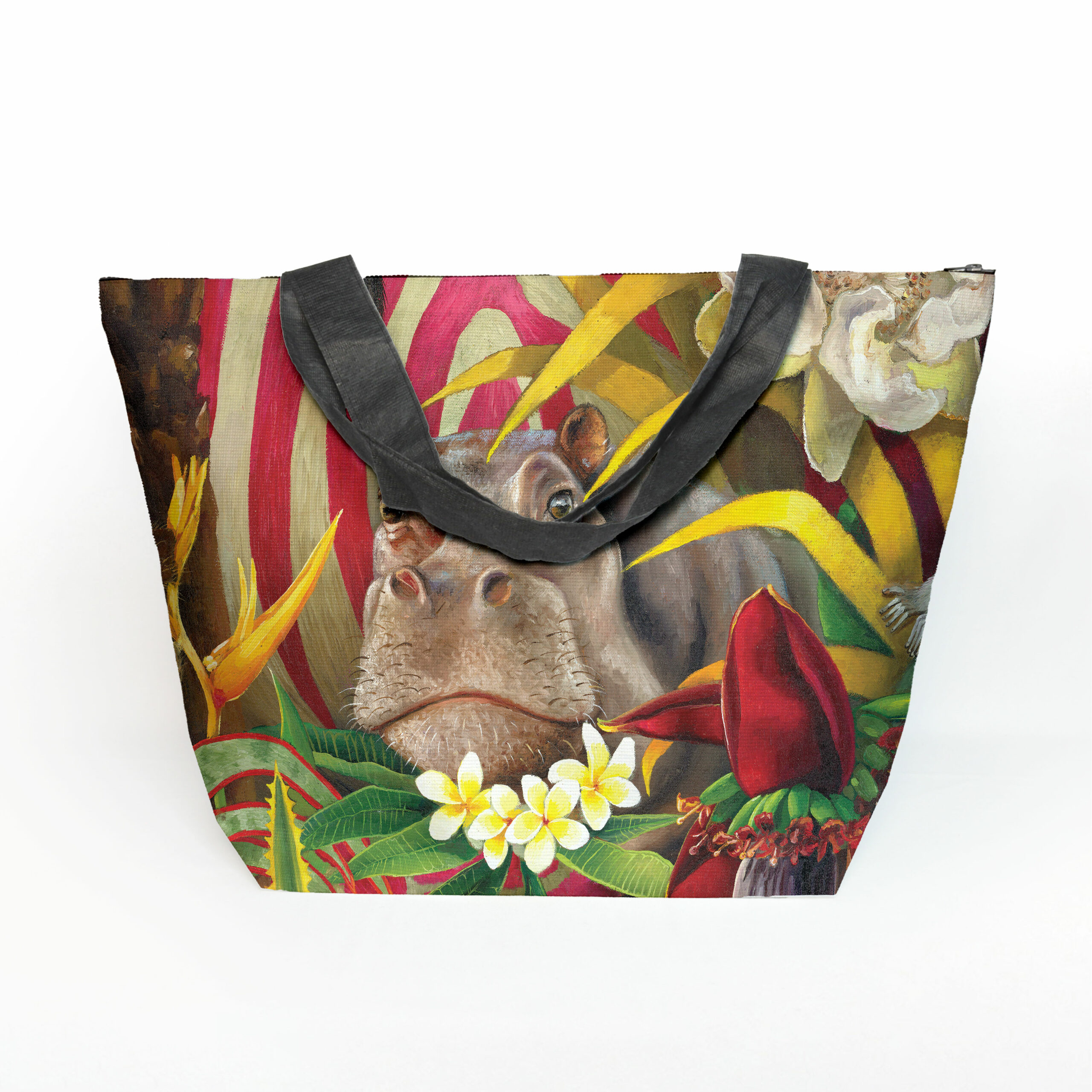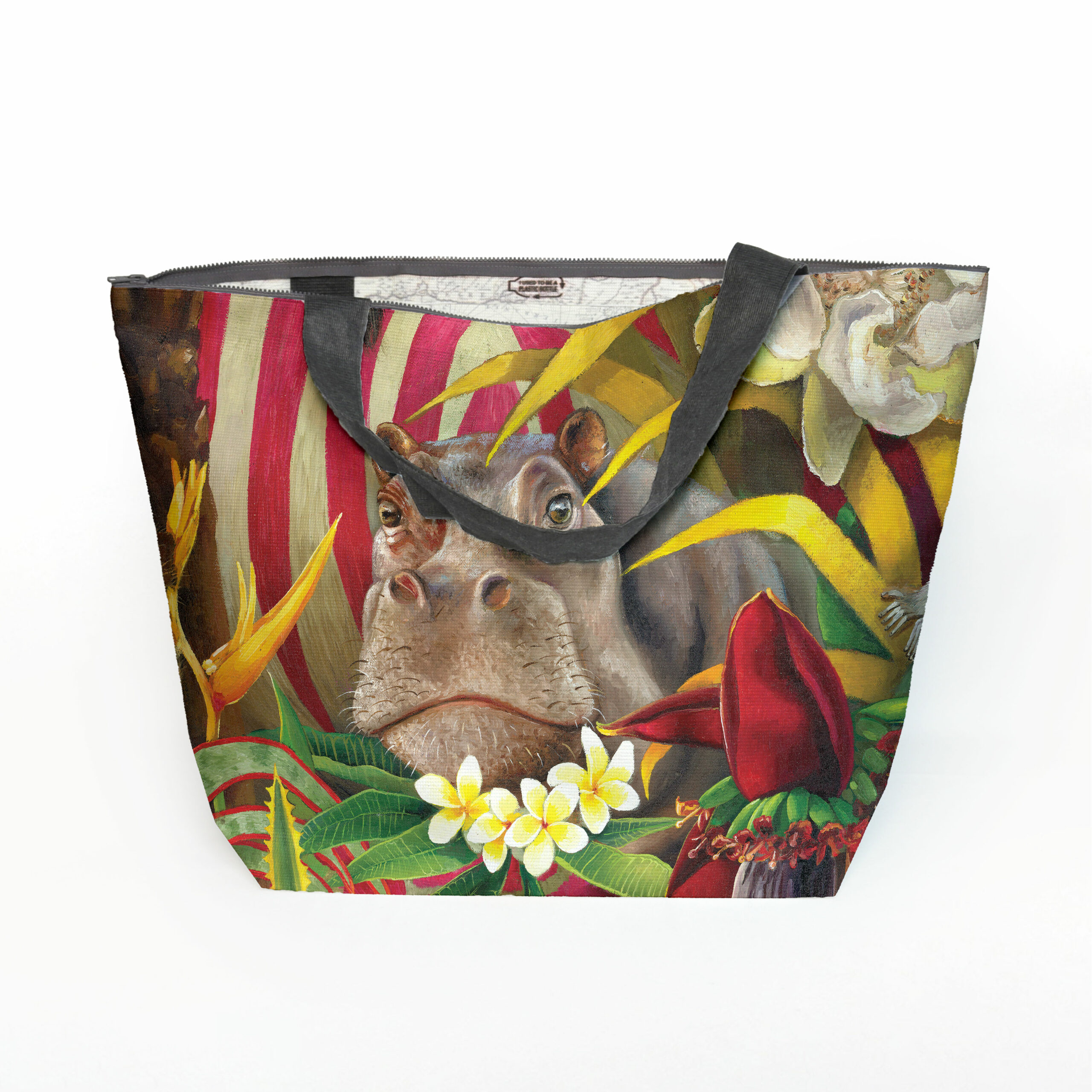 Maxi beach bag made from recycled fabric featuring 'African Jungle Hippo' from Whimsical Collection's 'African Jungle' range. The original painting was done in oils on canvas by South African artist Dezireë Smith.