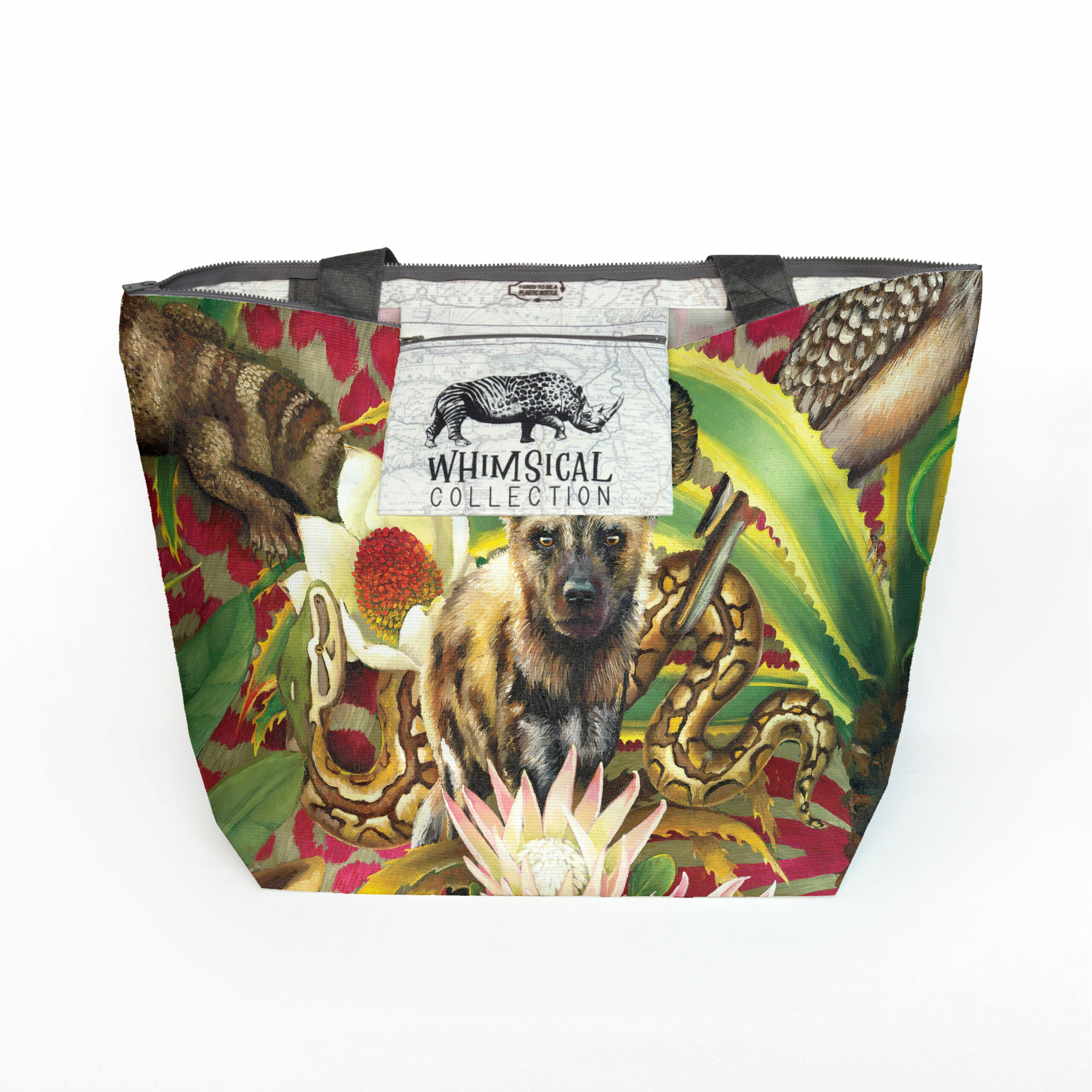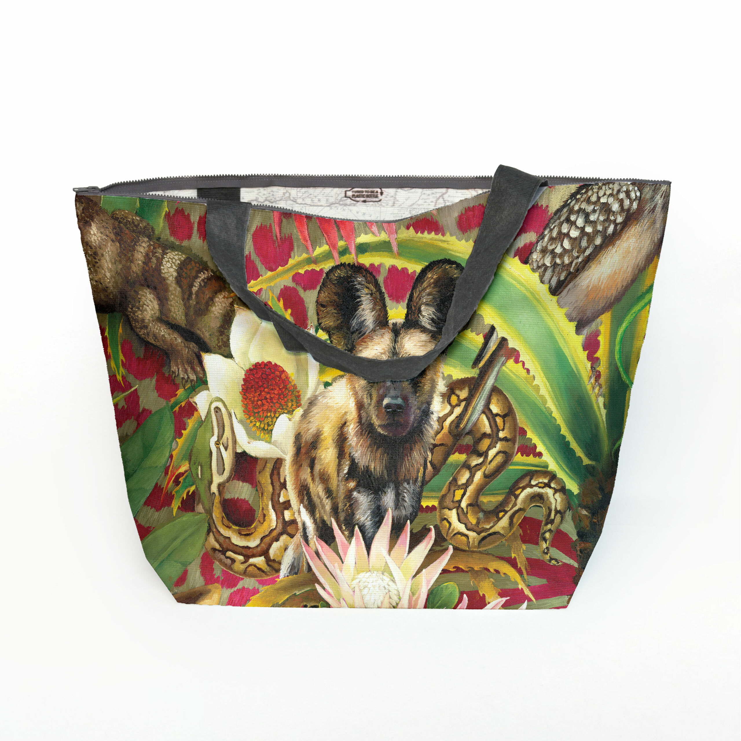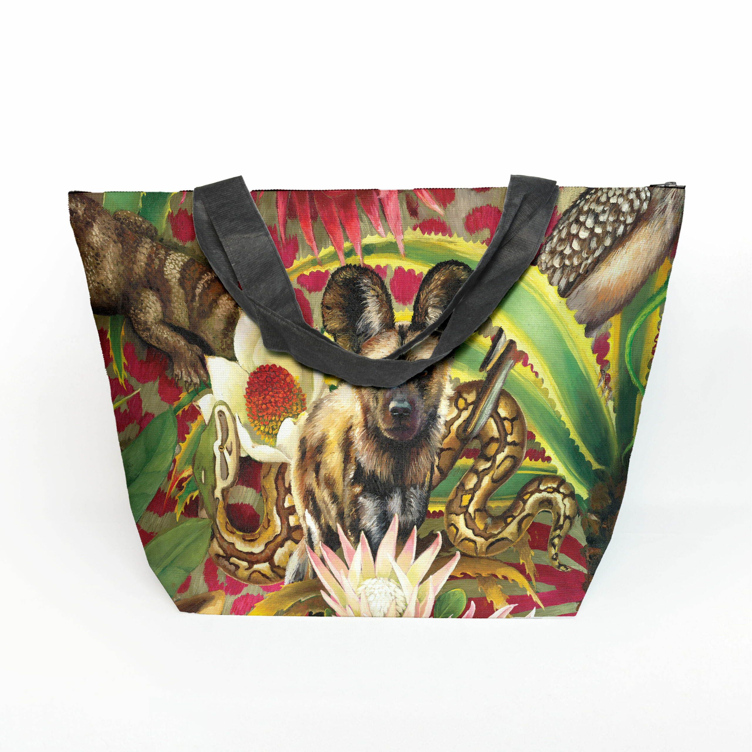 Maxi beach bag made from recycled fabric featuring 'African Jungle Wild Dog' from Whimsical Collection's 'African Jungle' range. The original painting was done in oils on canvas by South African artist Dezireë Smith.