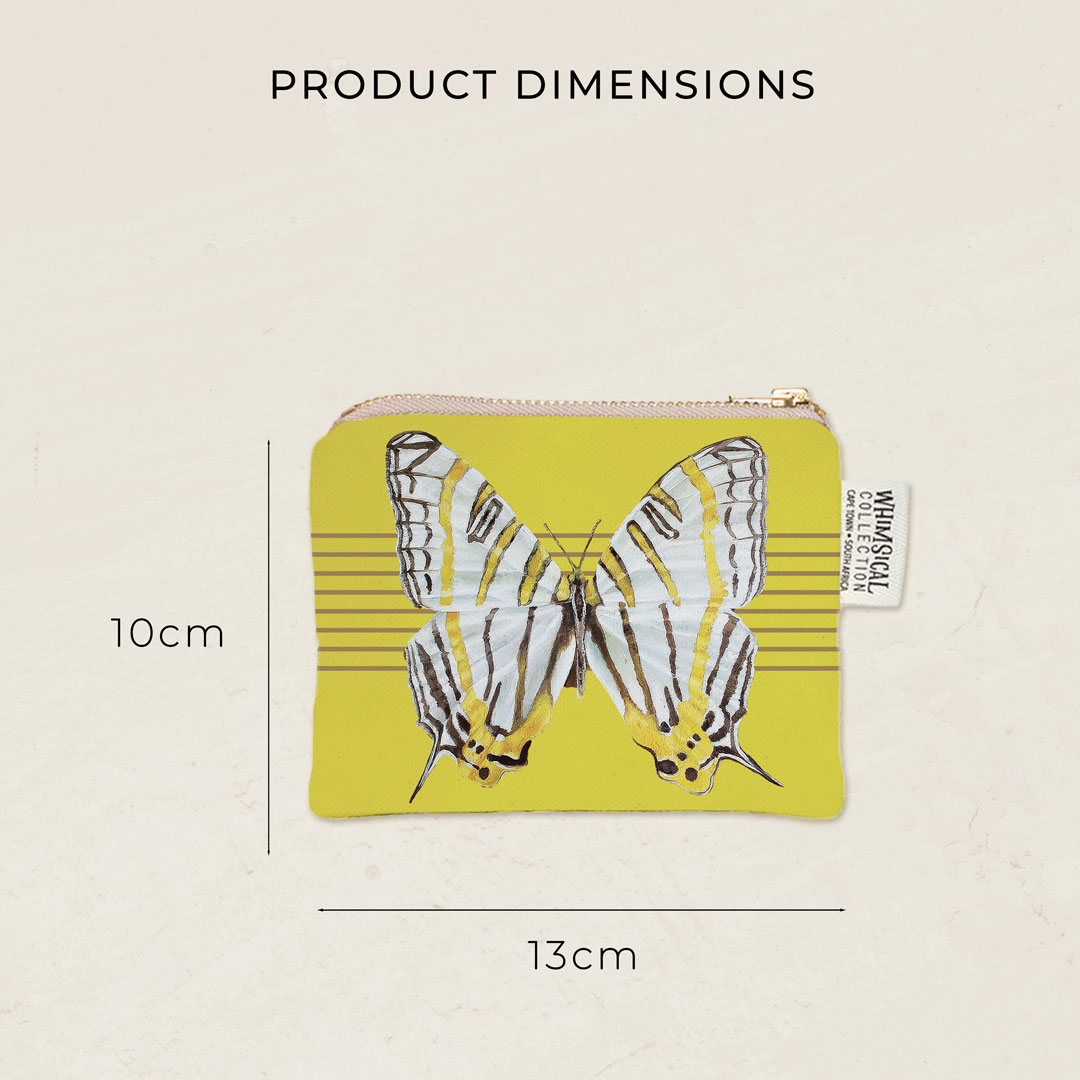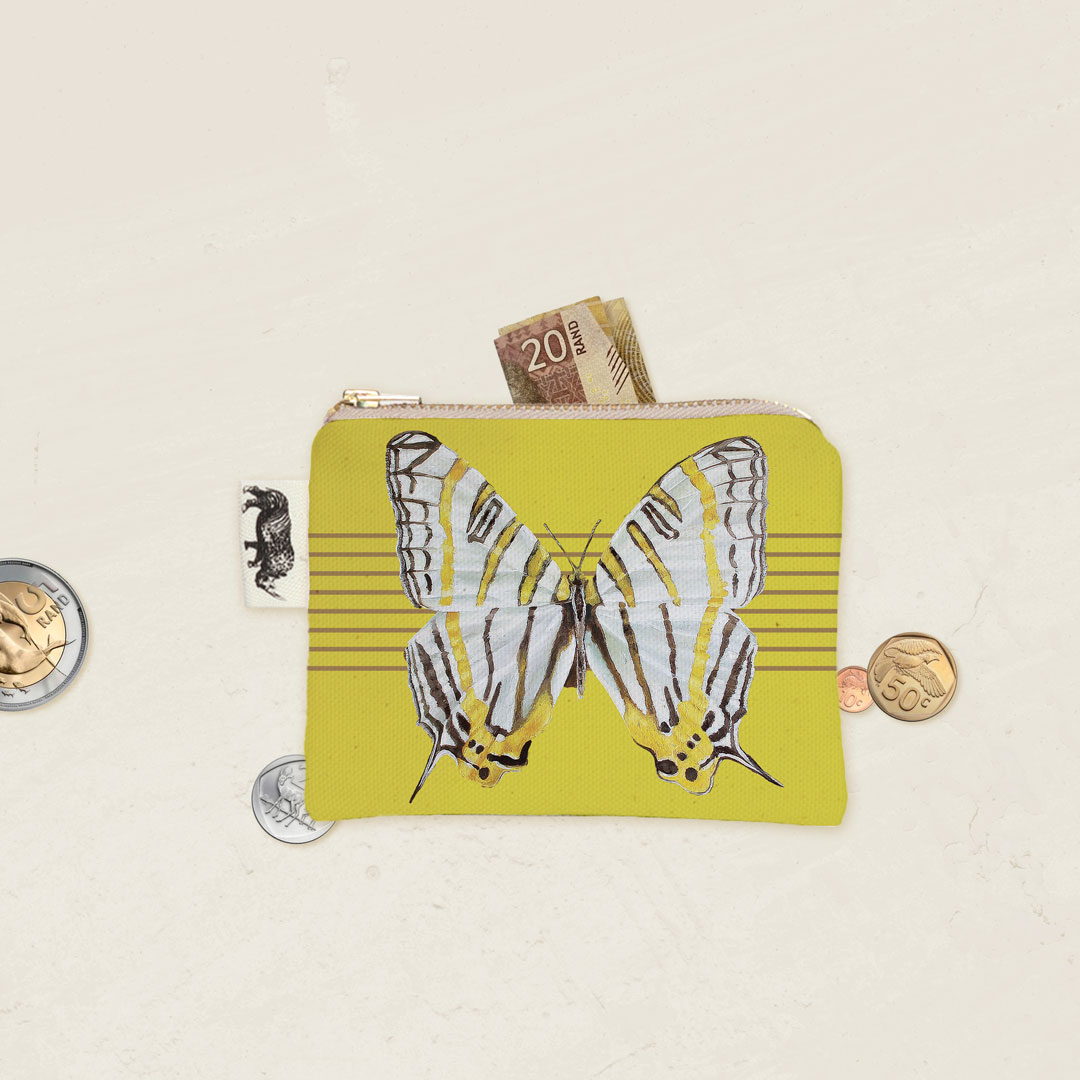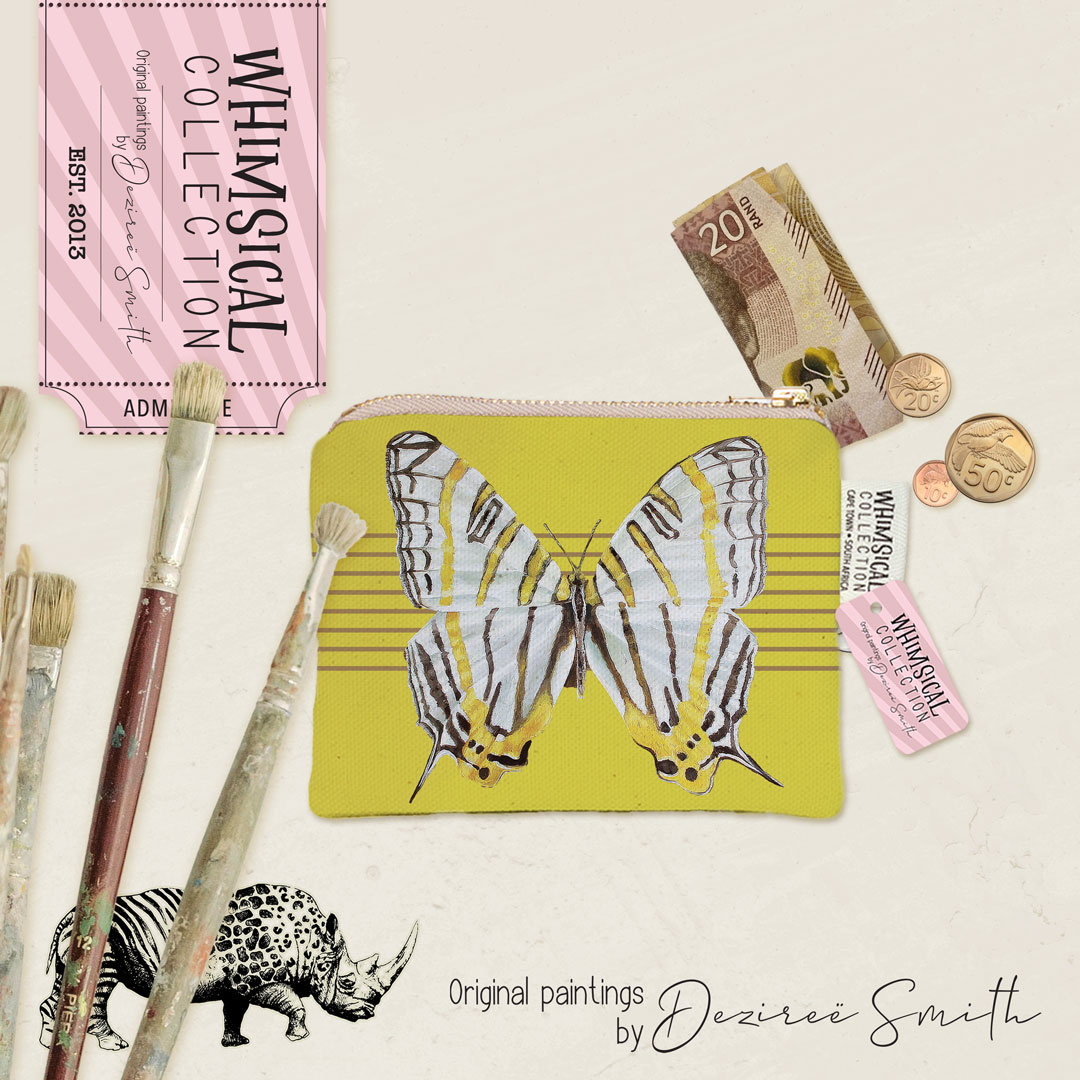 100% Cotton coin purse featuring a 'African Map Butterfly' from Whimsical Collection's 'Moths & Butterflies' collection in the 'African Insects' range. The original painting was done in oils by South African artist Dezireë Smith.