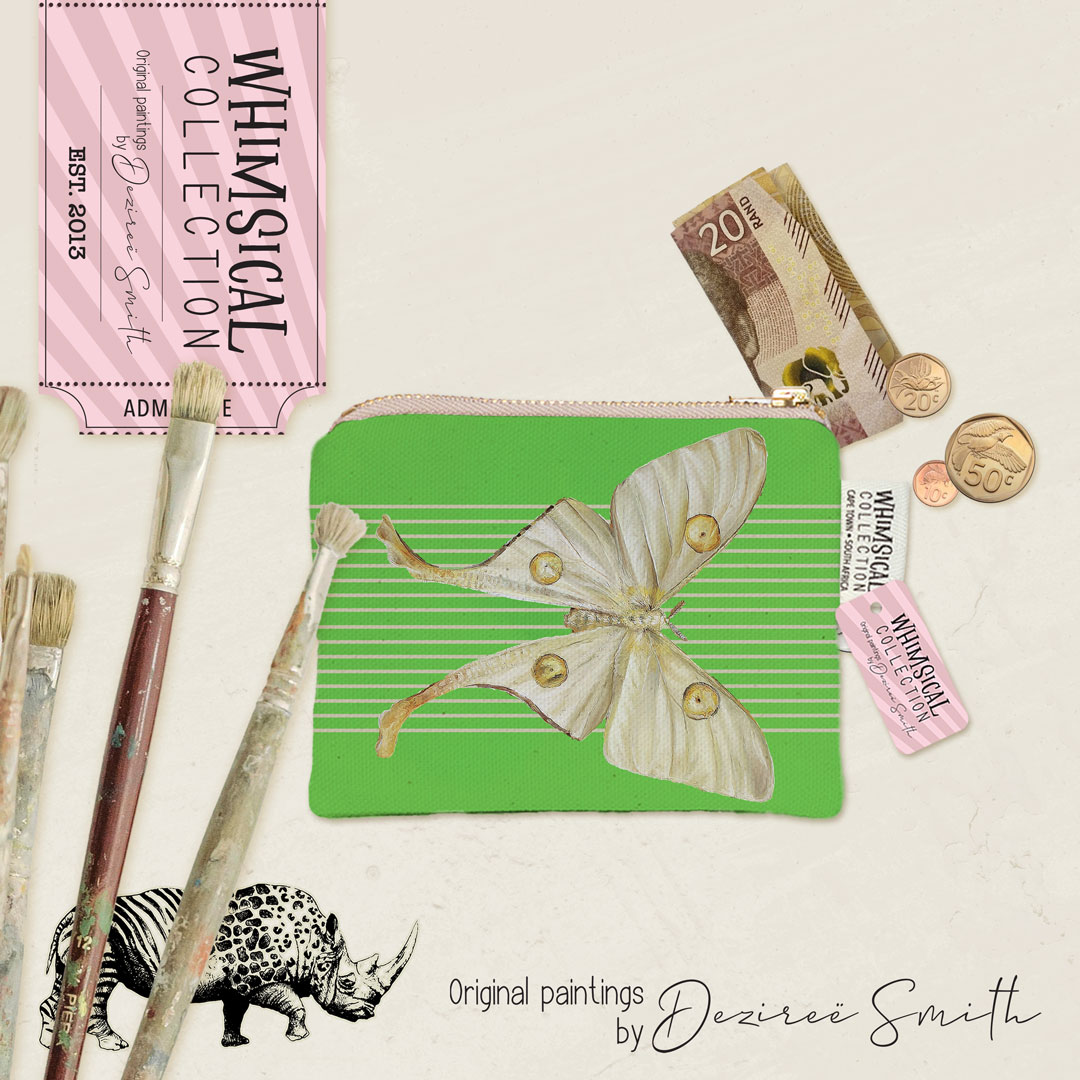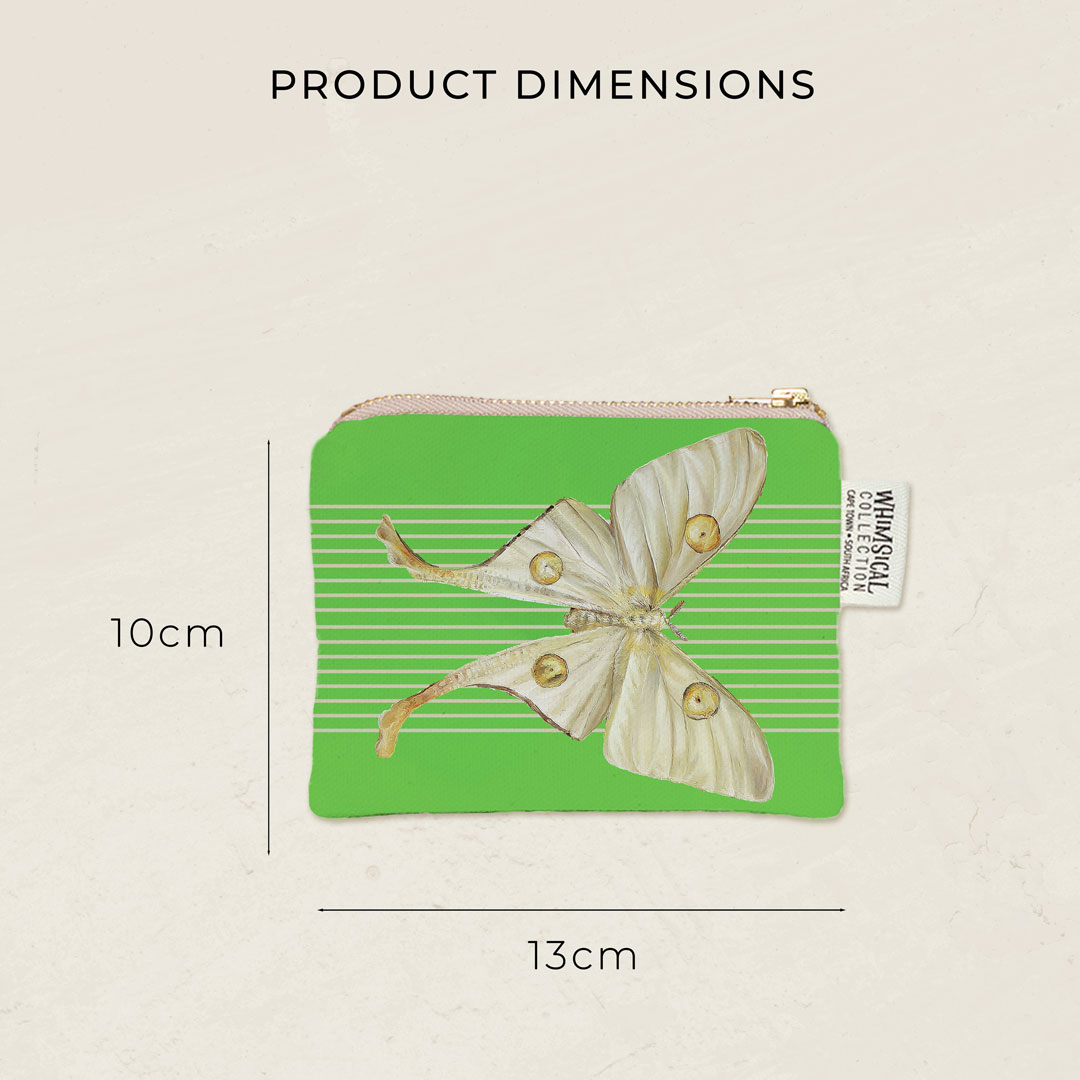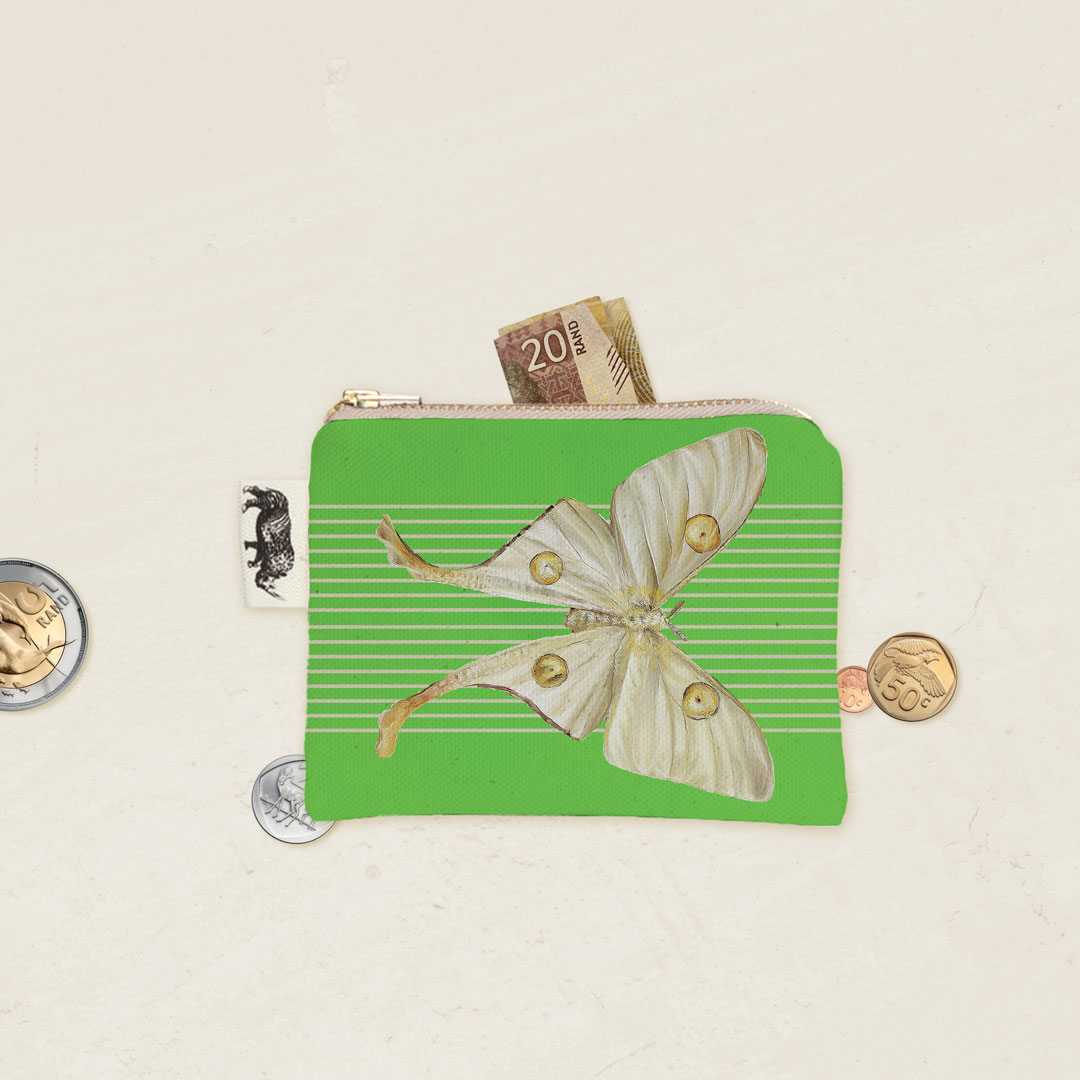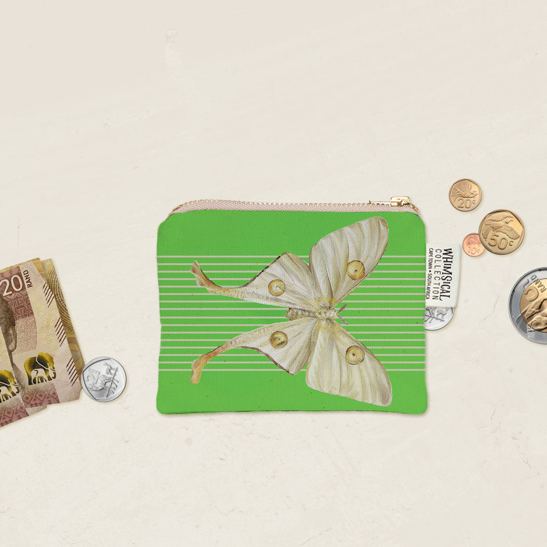 100% Cotton coin purse featuring a 'African Moon Moth' from Whimsical Collection's 'Moths & Butterflies' collection in the 'African Insects' range. The original painting was done in oils by South African artist Dezireë Smith.