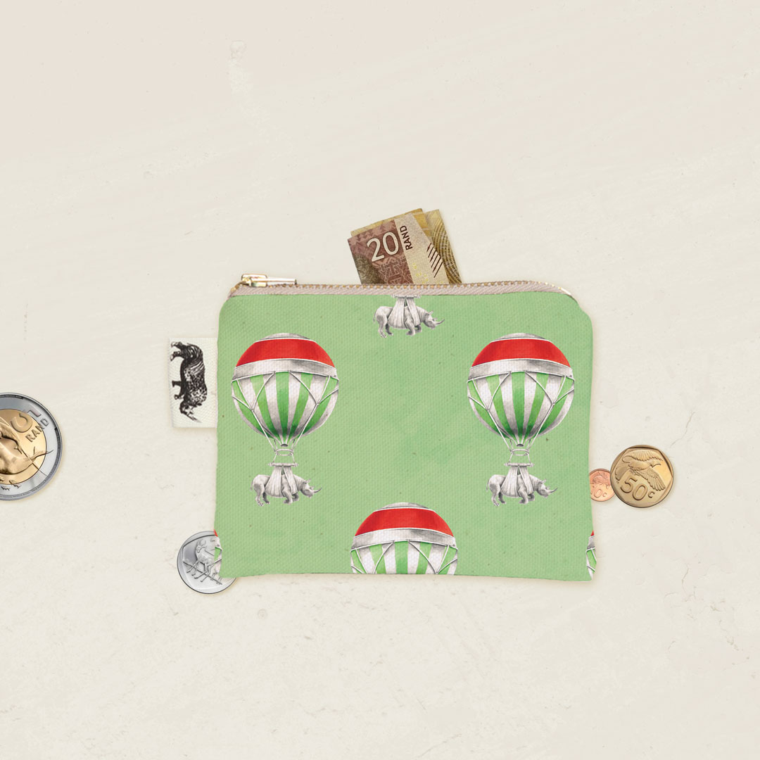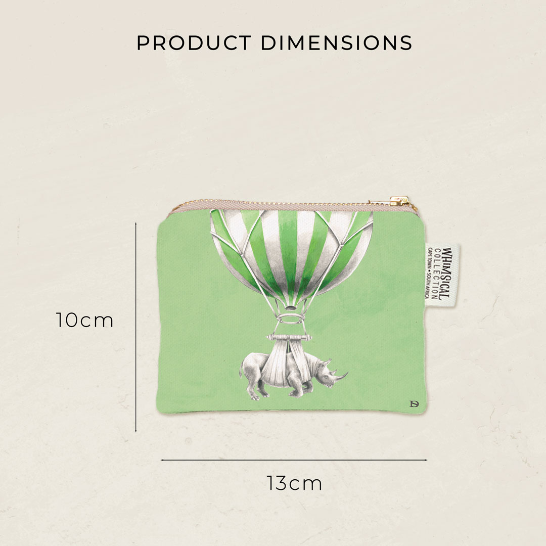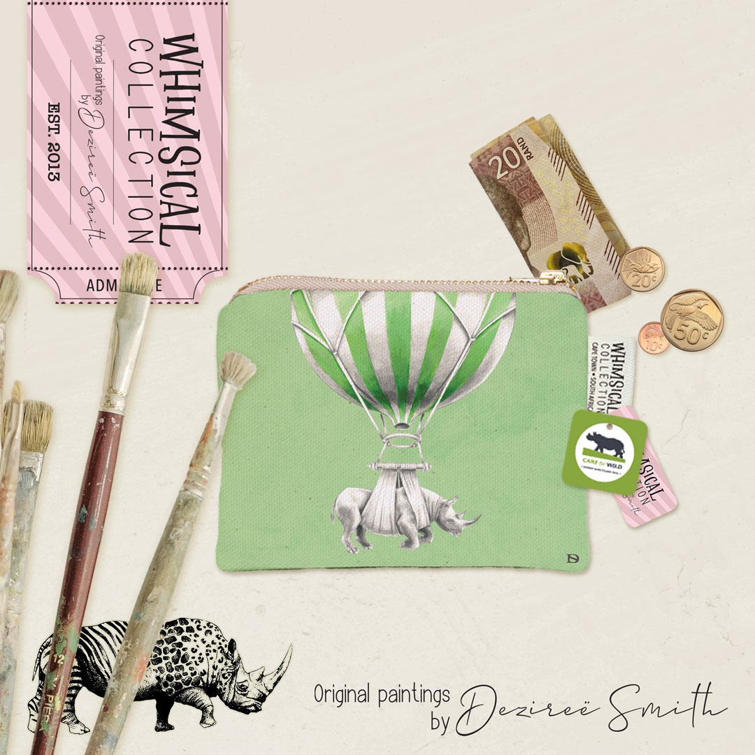 100% Cotton coin purse featuring 'Black Rhino in Flight' from Whimsical Collection's 'Wildlife in Flight' range. The original artwork was done in paint and pencil on paper by South African artist Dezireë Smith.