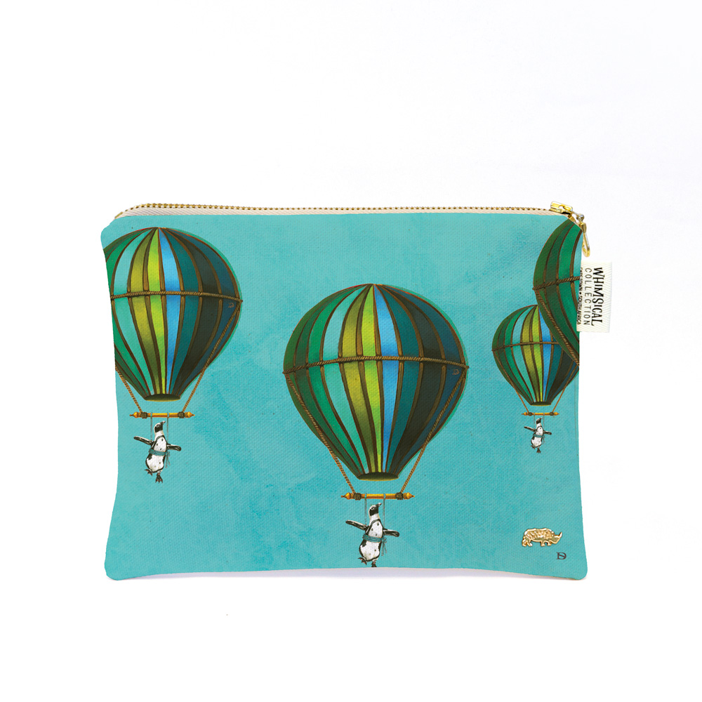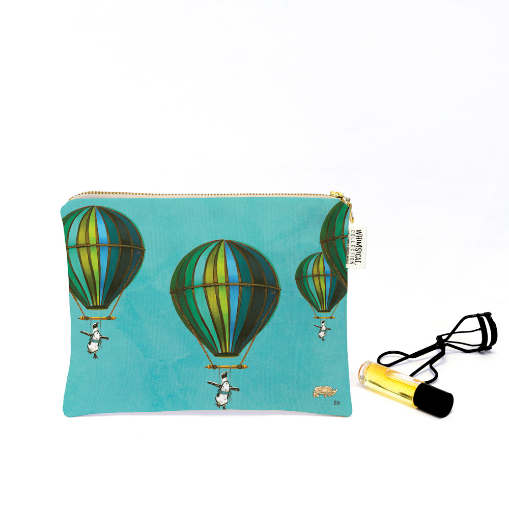 100% Cotton cosmetics purse featuring 'Blue Penguin in Flight' from Whimsical Collection's 'Wildlife in Flight' range. The original artwork was done in paint on paper by South African artist Dezireë Smith.