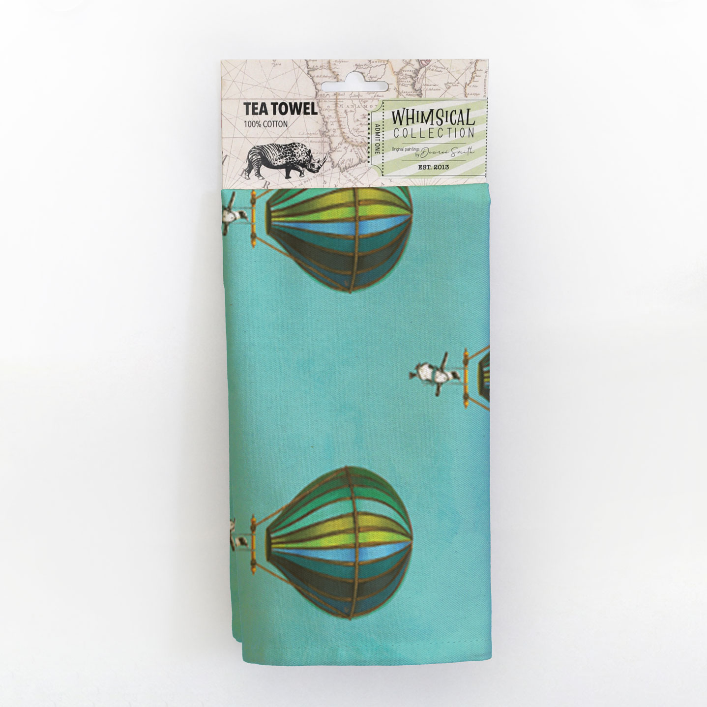100% Cotton tea towel featuring 'Blue Penguin in Flight' from the 'Wildlife in Flight' range by Whimsical Collection. The original painting was done in paint on paper by South African artist Dezireë Smith.