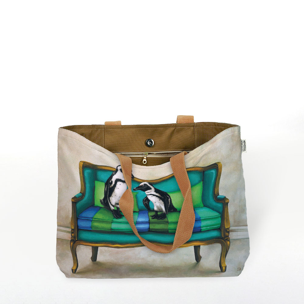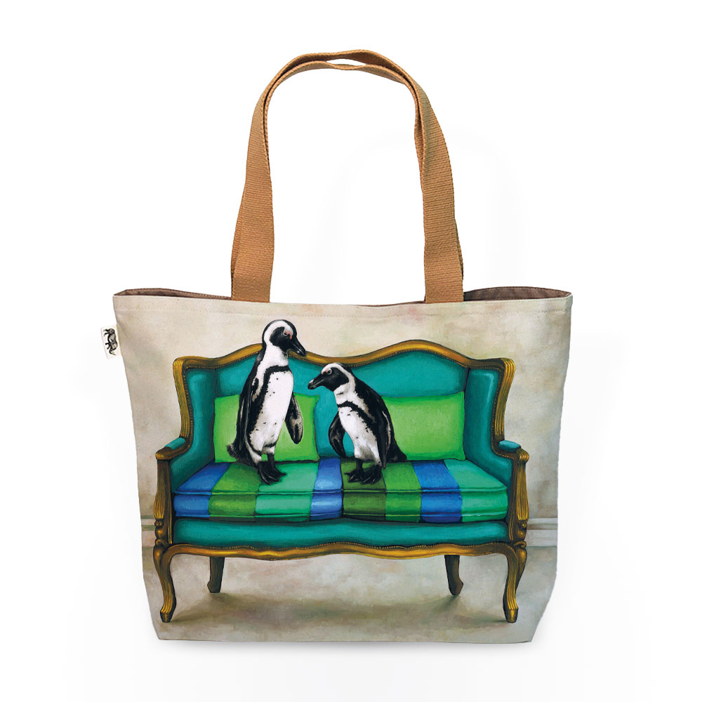100% Cotton canvas tote bag featuring 'Blue Penguins at Leisure' from the 'Wildlife at Leisure' range. The original painting was done in oils on canvas by South African artist Dezireë Smith.