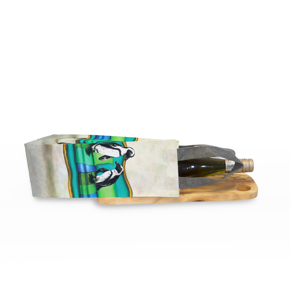 Wine carrier made from recycled fabric featuring 'Blue Penguins at Leisure' from Whimsical Collection's 'Wildlife at Leisure' range.  The original painting was done in oils on canvas by South African artist Dezireë Smith.