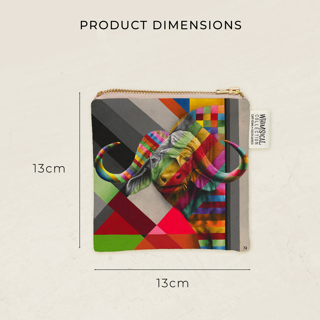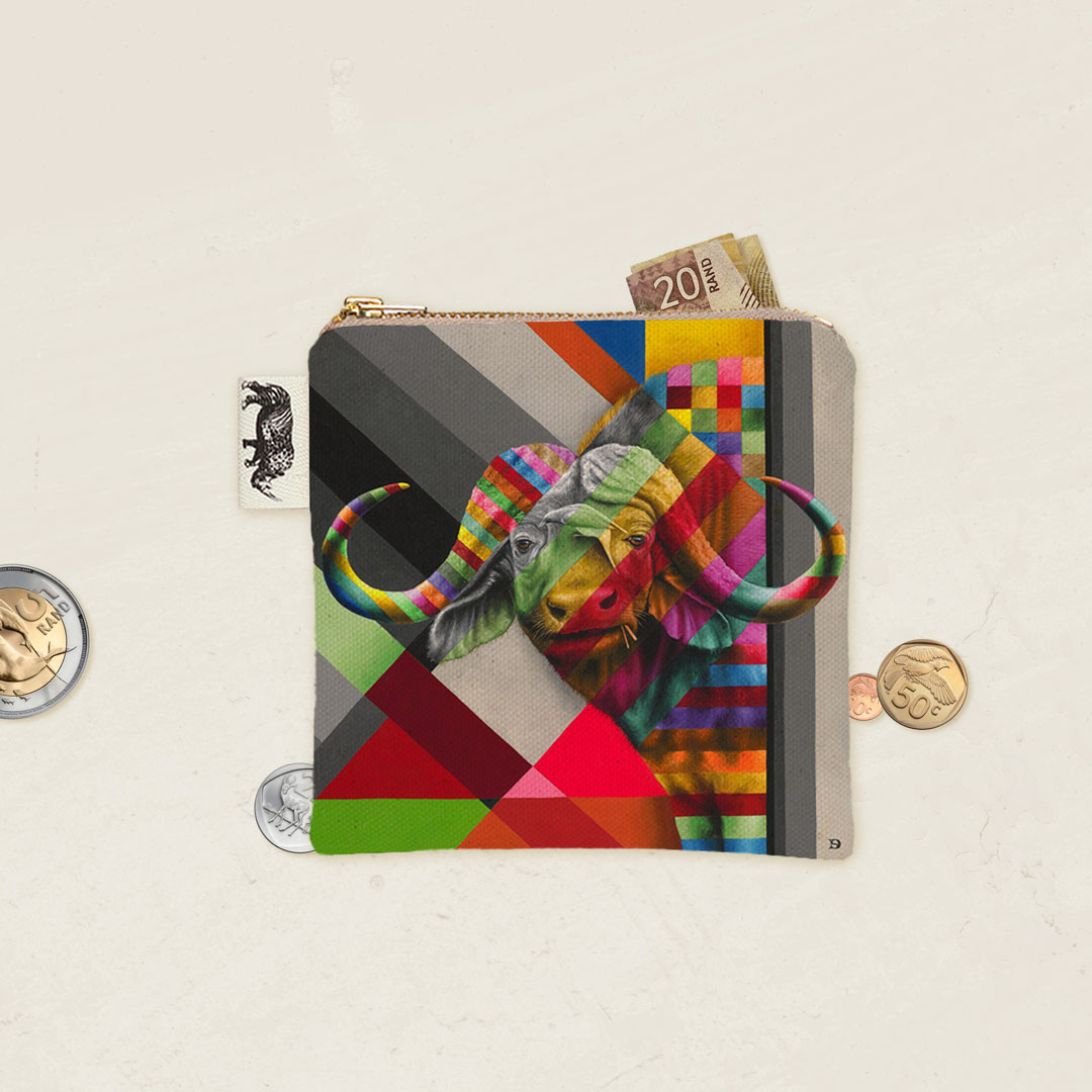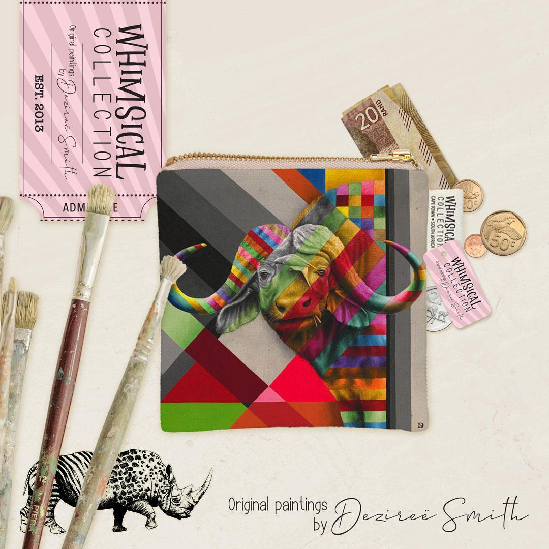 100% Cotton coin purse featuring 'Buffalo in Colour' from Whimsical Collection's 'Wildlife in Colour' range. The original painting was done in oils on canvas by South African artist Dezireë Smith.