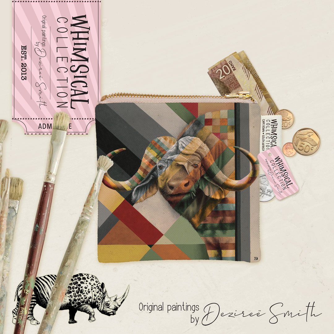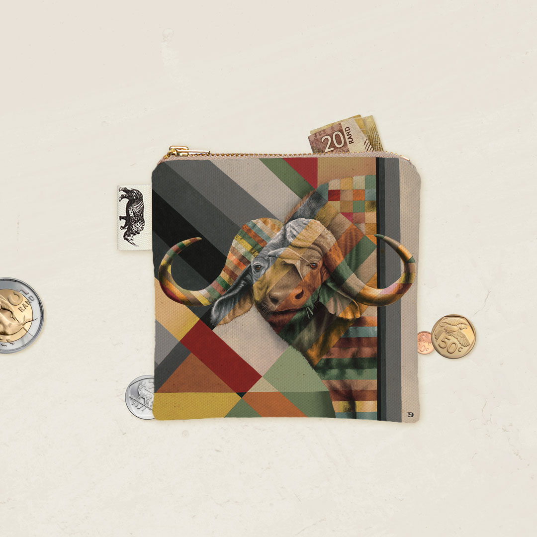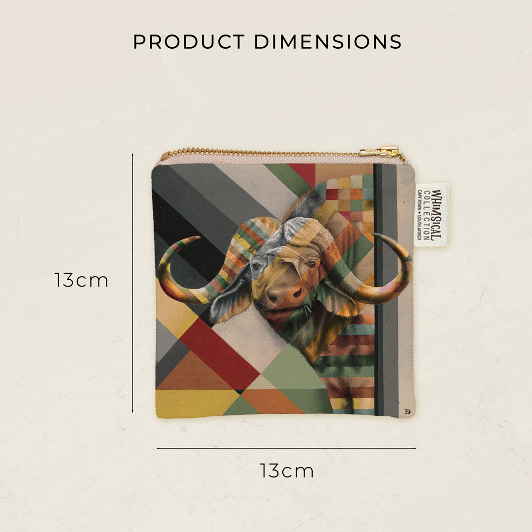 100% Cotton coin purse featuring 'Buffalo in Shades of Africa' from Whimsical Collection's 'Shades of Africa' range. The Shades of Africa range is a colour adaptation of the original 'Wildlife in Colour' paintings done in oils on canvas by South African artist Dezireë Smith.