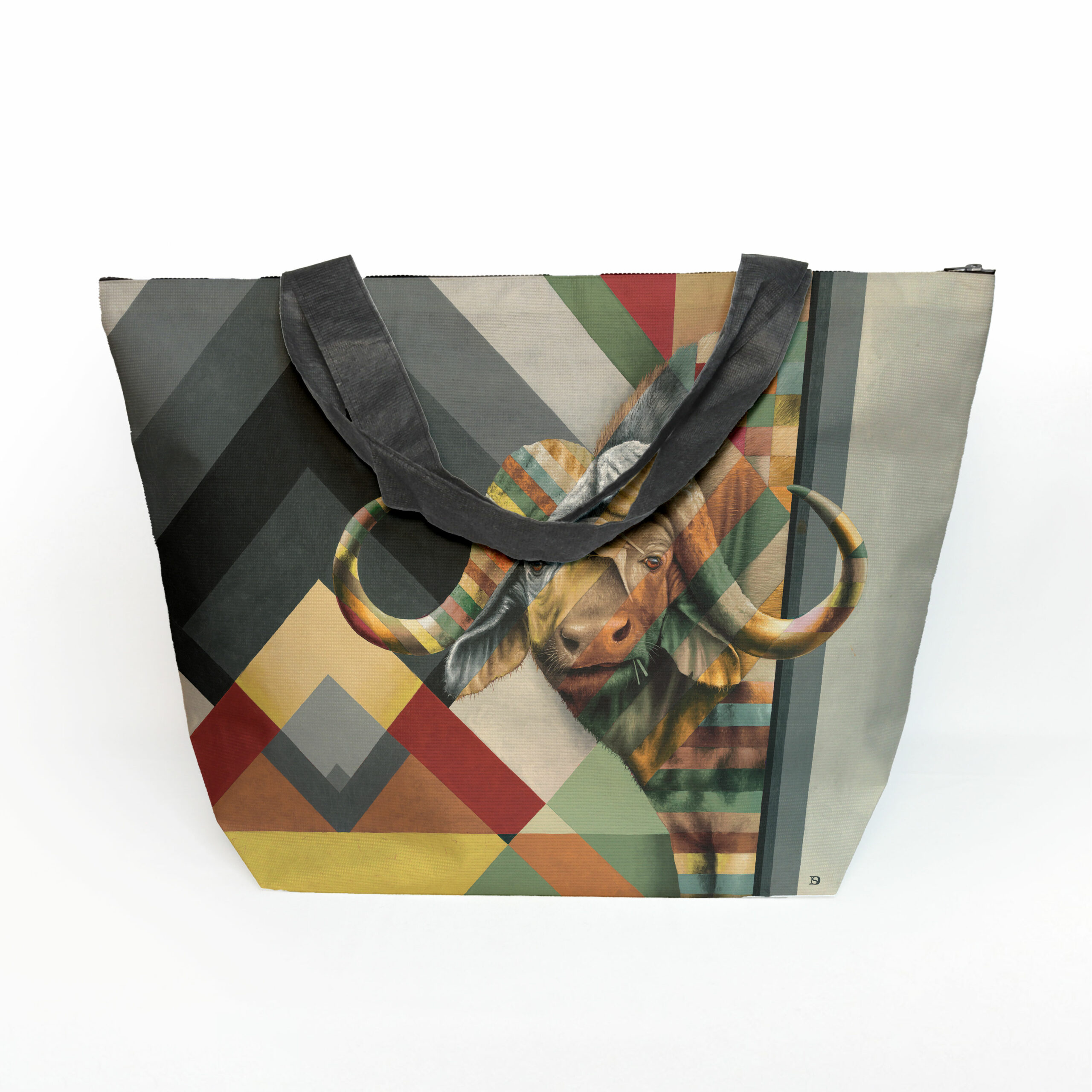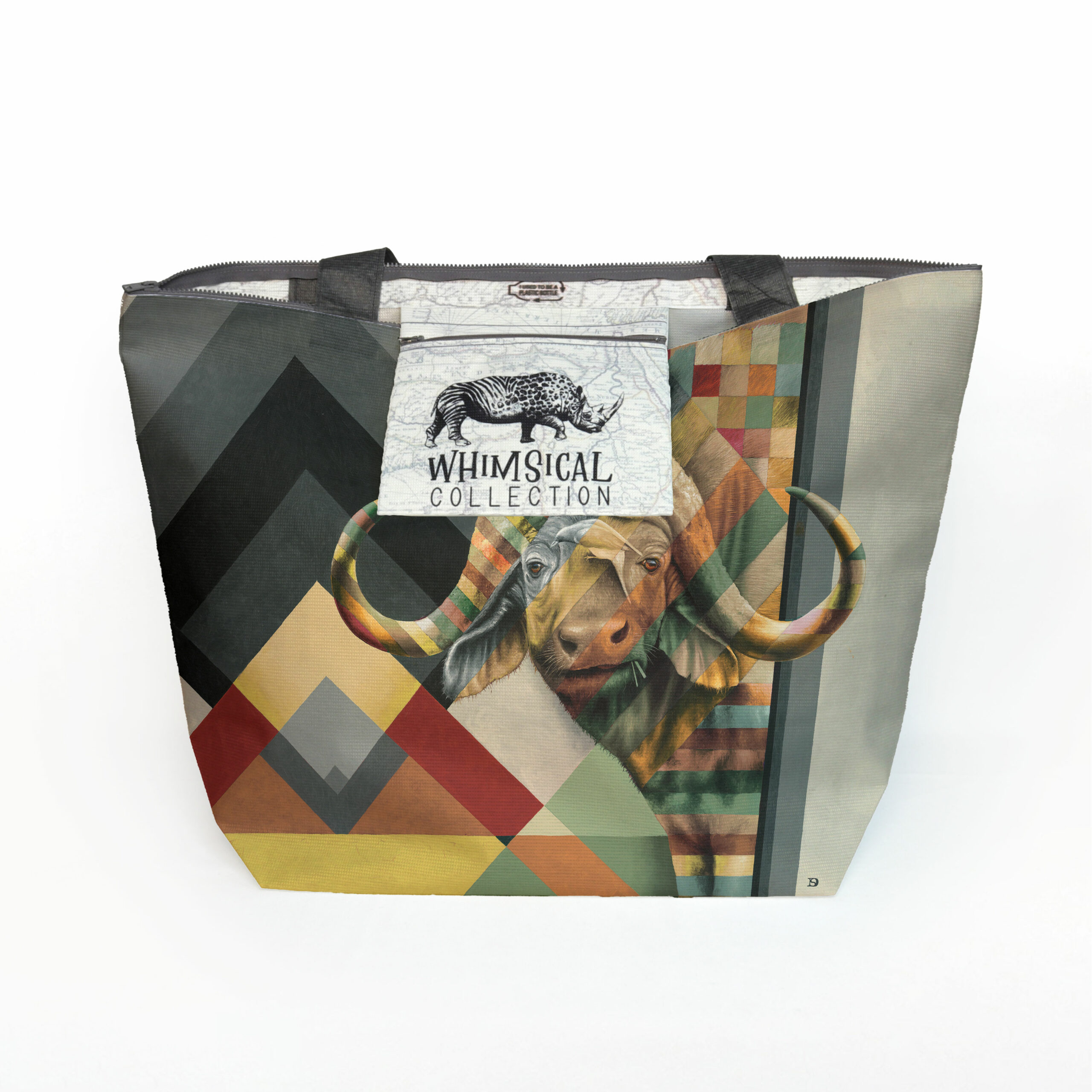 Maxi beach bag made from recycled fabric featuring 'Buffalo in Shades of Africa' from Whimsical Collection's 'Wildlife in Colour' range. The Shades of Africa range is a colour adaptation of the original 'Wildlife in Colour' paintings done in oils on canvas by South African artist Dezireë Smith.