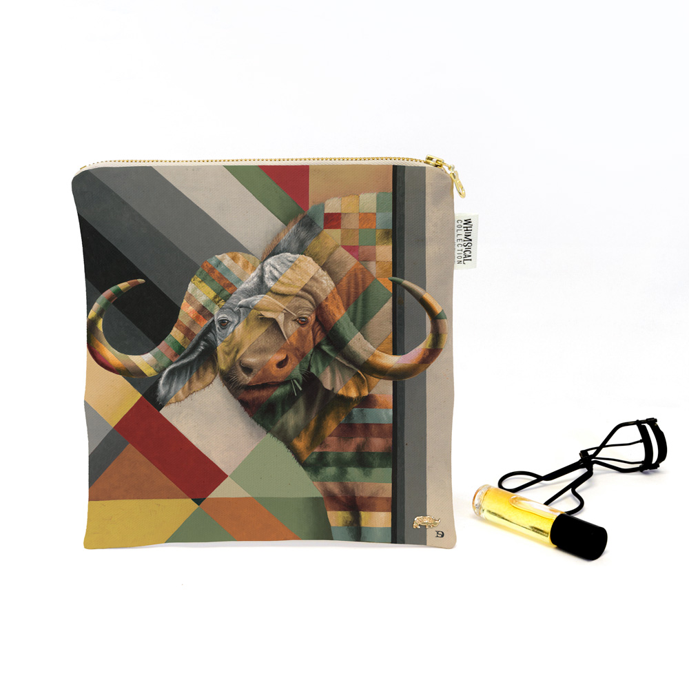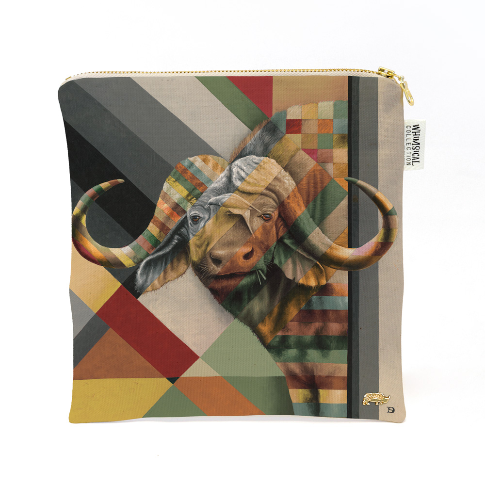 100% Cotton cosmetics purse featuring 'Buffalo in Shades of Africa' from Whimsical Collection's 'Shades of Africa' range. The Shades of Africa range is a colour adaptation of the original 'Wildlife in Colour' paintings done in oils on canvas by South African artist Dezireë Smith.