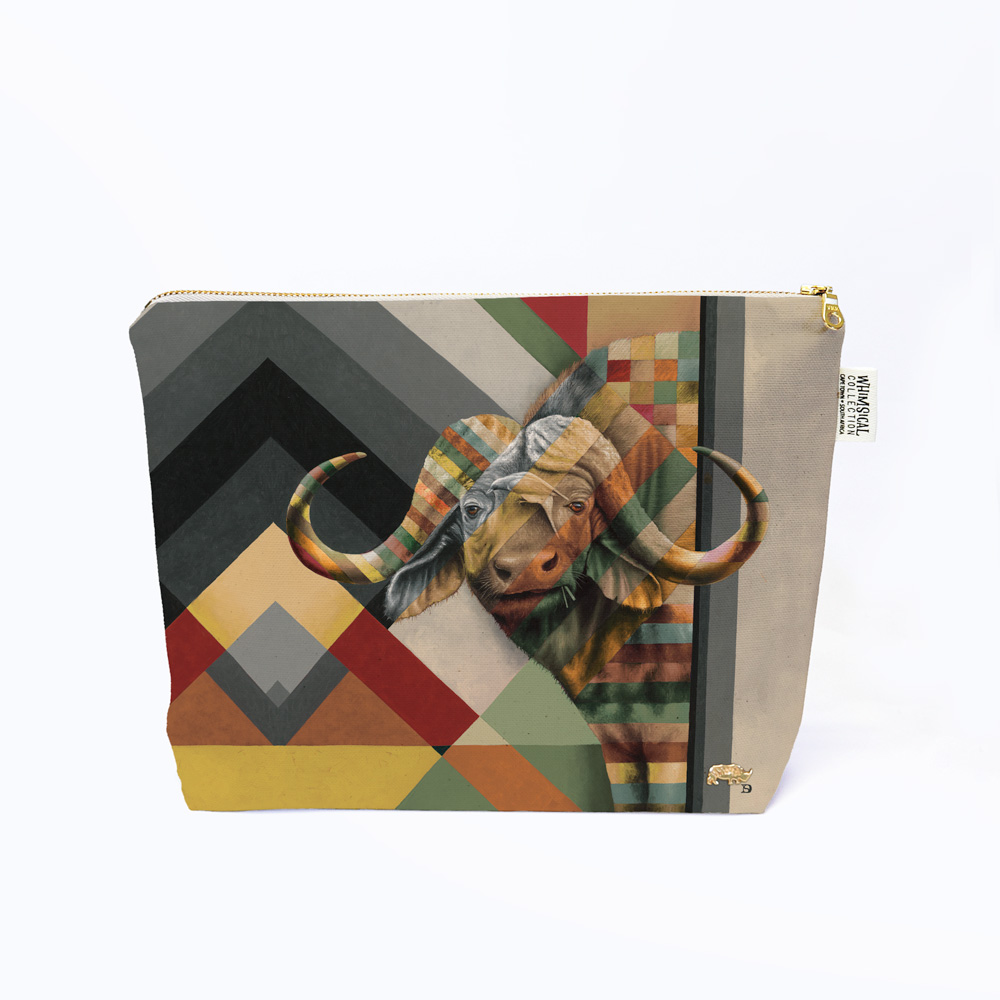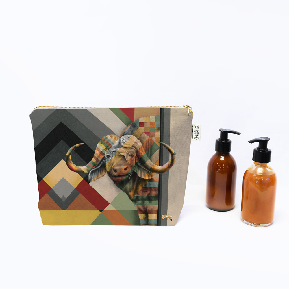 100% Cotton toiletry bag featuring 'Buffalo in Shades of Africa' from Whimsical Collection's 'Wildlife in Shades of Africa' range. The Shades of Africa range is a colour adaptation of the original 'Wildlife in Colour' paintings done in oils on canvas by South African artist Dezireë Smith.