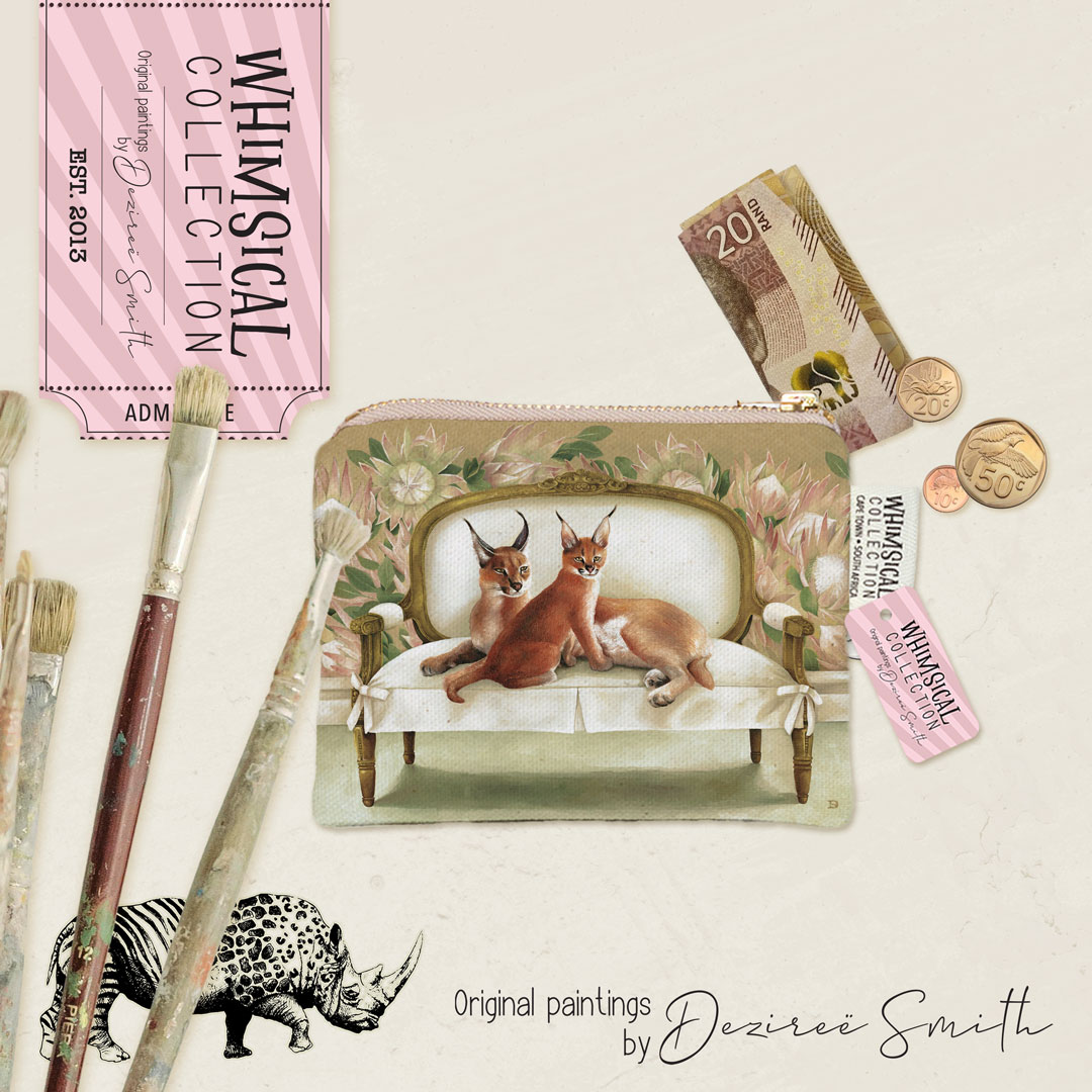 Design: Caracal at Leisure – a caracal mother and kitten on a white sofa in a room with protea wallpaper
