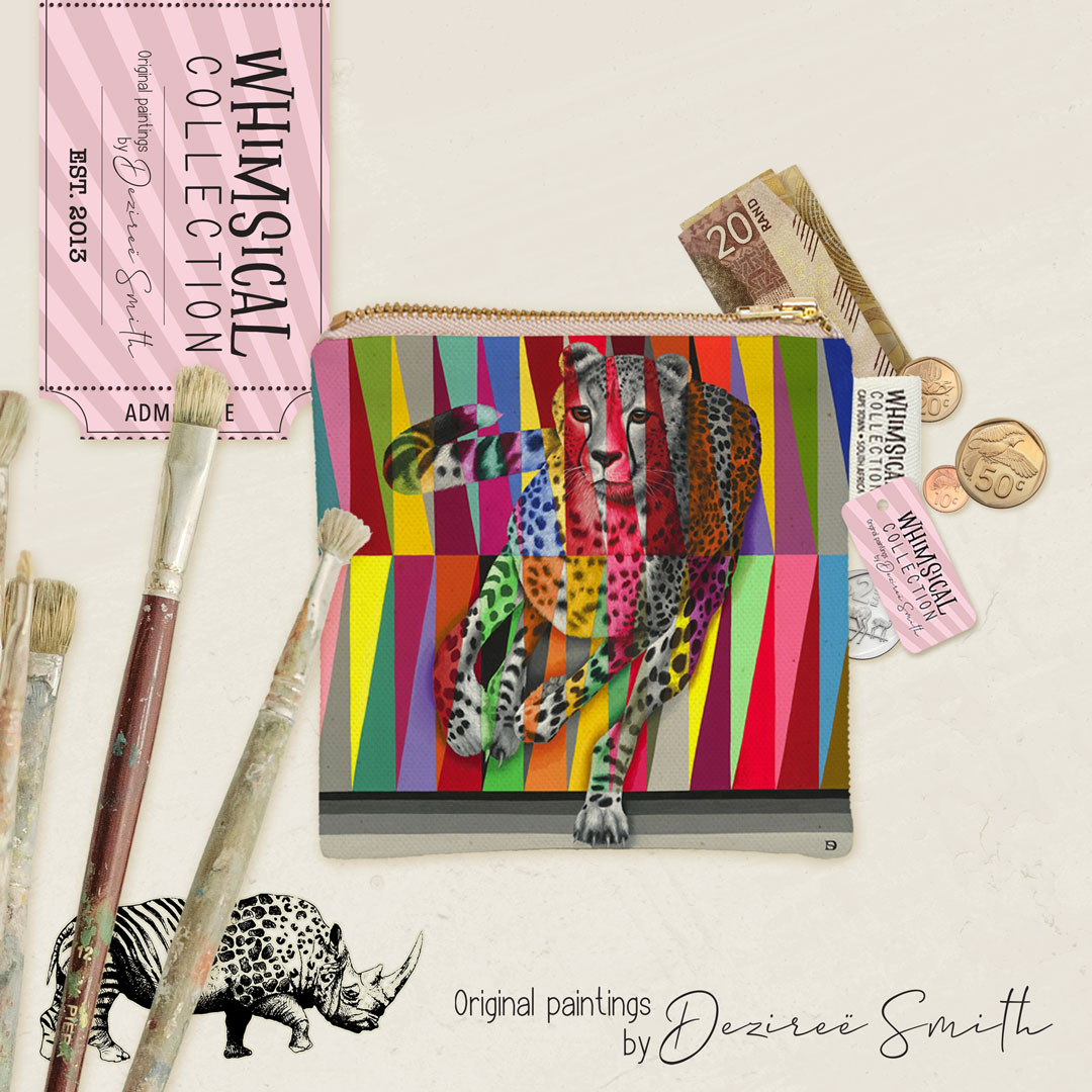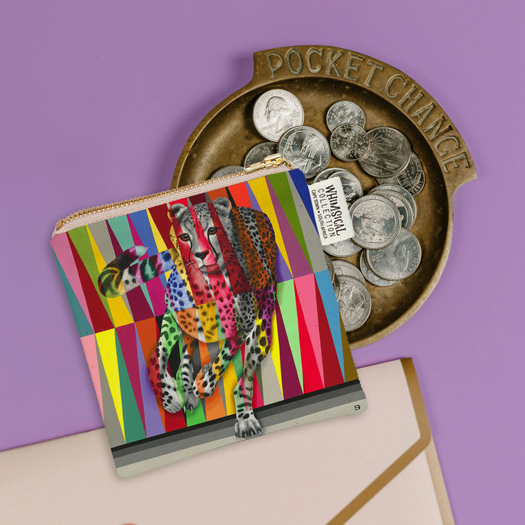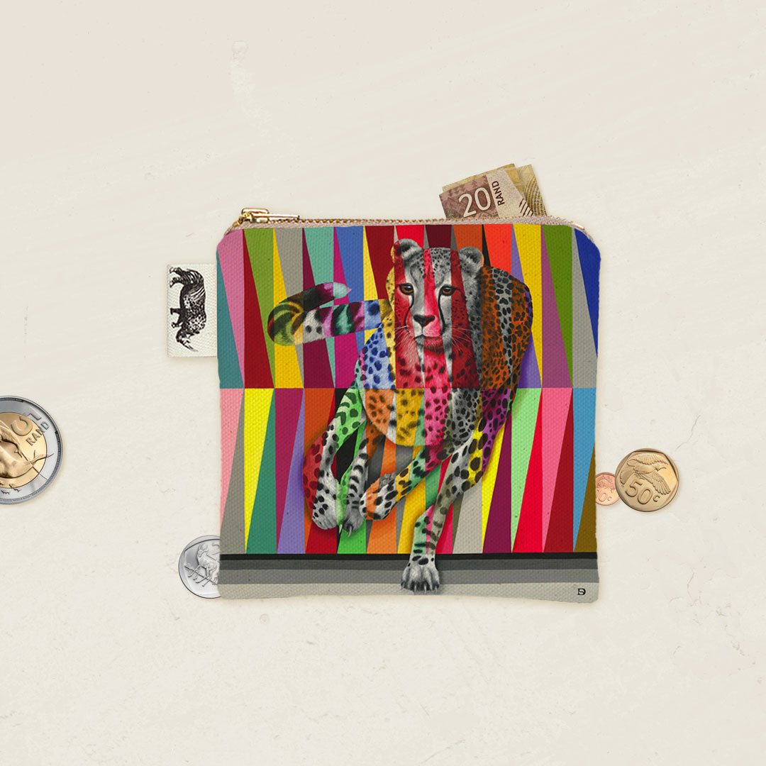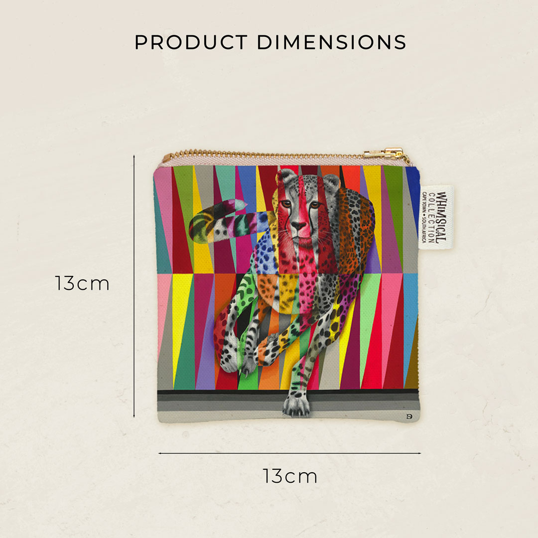 100% Cotton coin purse featuring 'Cheetah in Colour' from Whimsical Collection's 'Wildlife in Colour' range. The original painting was done in oils on canvas by South African artist Dezireë Smith.