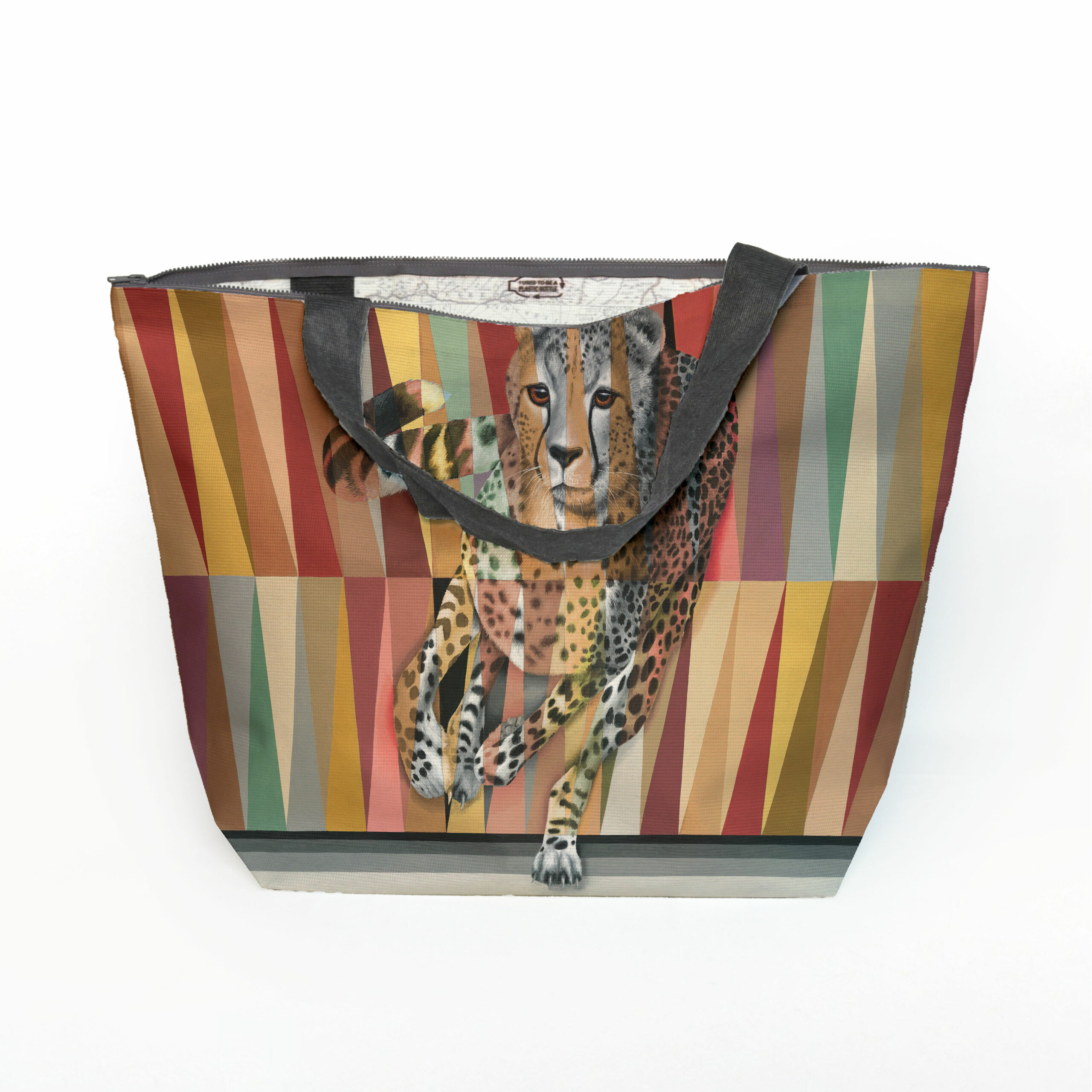 Maxi beach bag made from recycled fabric featuring 'Cheetah in Shades of Africa' from Whimsical Collection's 'Wildlife in Colour' range. The Shades of Africa range is a colour adaptation of the original 'Wildlife in Colour' paintings done in oils on canvas by South African artist Dezireë Smith.