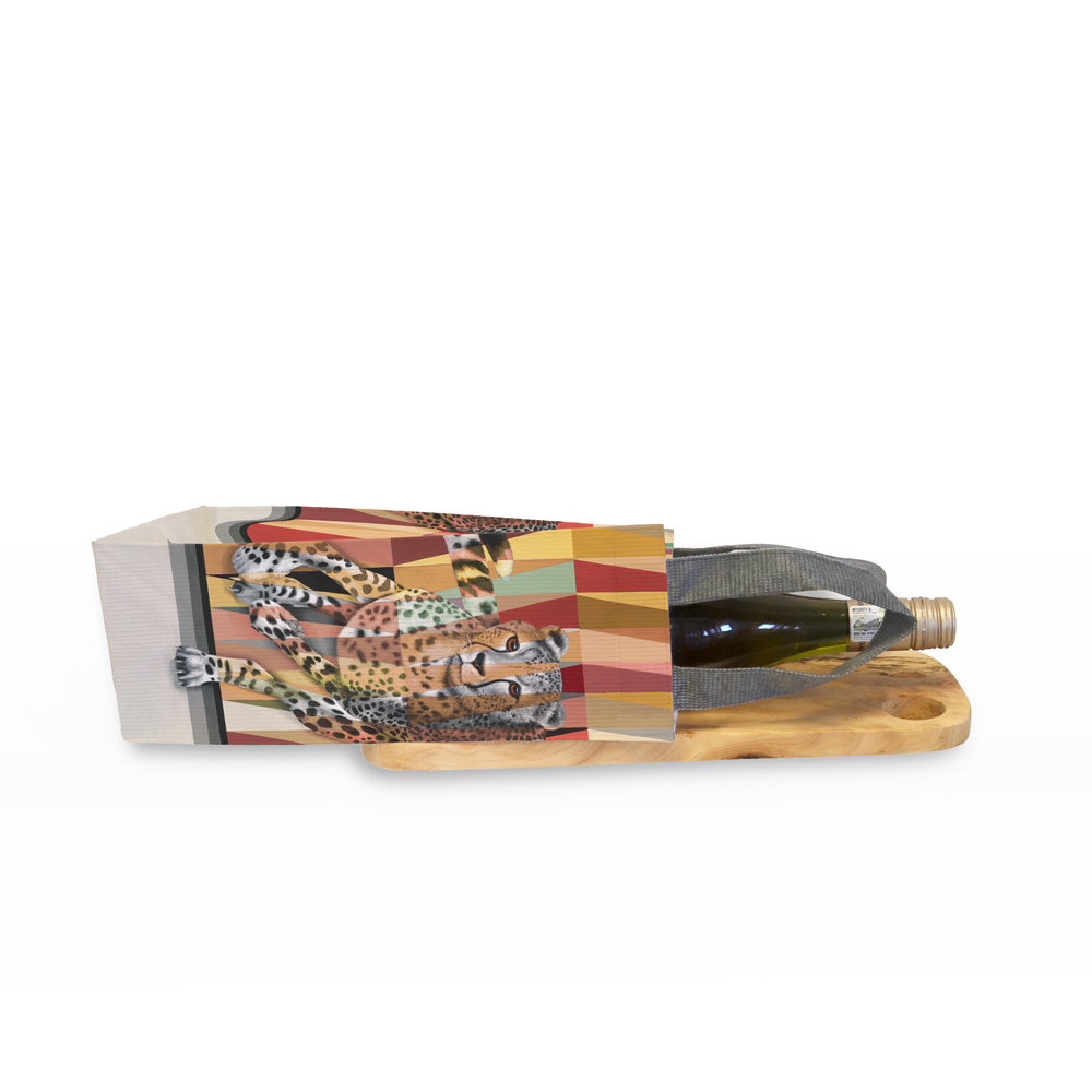 Wine carrier made from recycled fabric featuring 'Cheetah in Shades of Africa' from Whimsical Collection's 'Shades of Africa' range. The Shades of Africa range is a colour adaptation of the original 'Wildlife in Colour' paintings done in oils on canvas by South African artist Dezireë Smith.