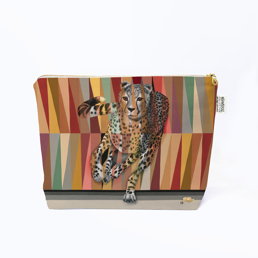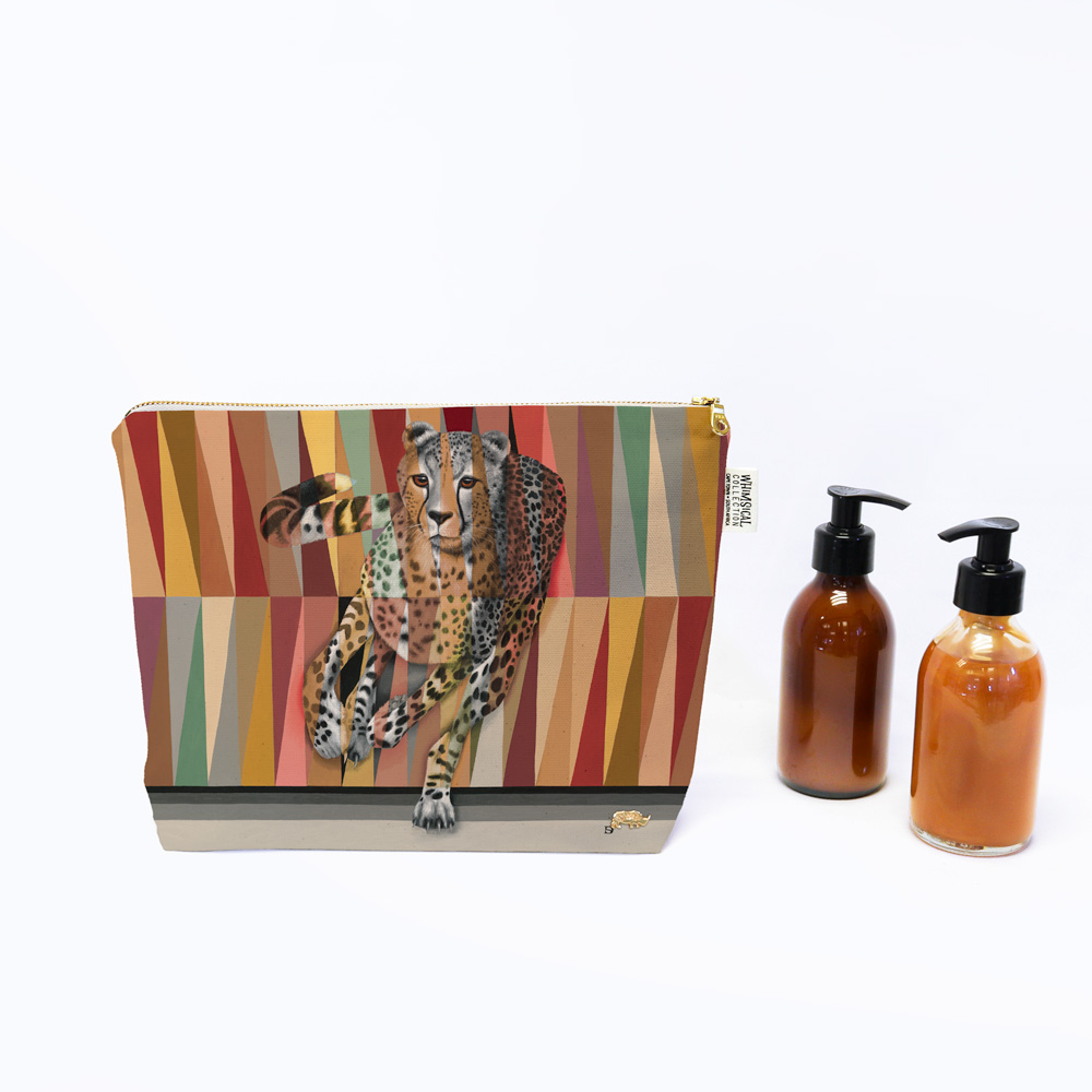 100% Cotton toiletry bag featuring 'Cheetah in Shades of Africa' from Whimsical Collection's 'Wildlife in Shades of Africa' range. The Shades of Africa range is a colour adaptation of the original 'Wildlife in Colour' paintings done in oils on canvas by South African artist Dezireë Smith.