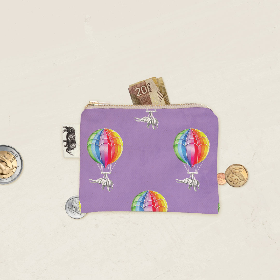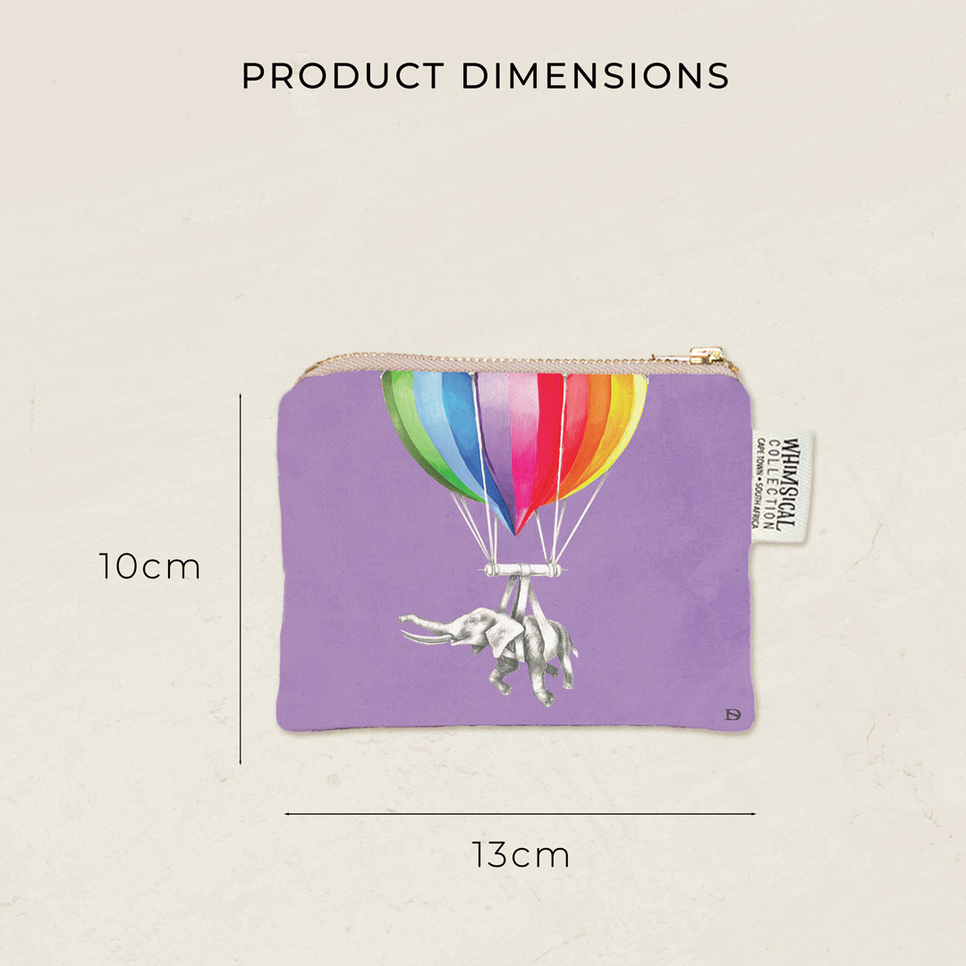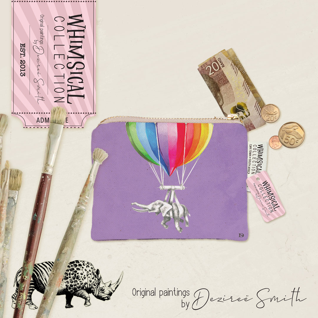 100% Cotton coin purse featuring 'Elephant in Flight' from Whimsical Collection's 'Wildlife in Flight' range. The original artwork was done in paint and pencil on paper by South African artist Dezireë Smith.