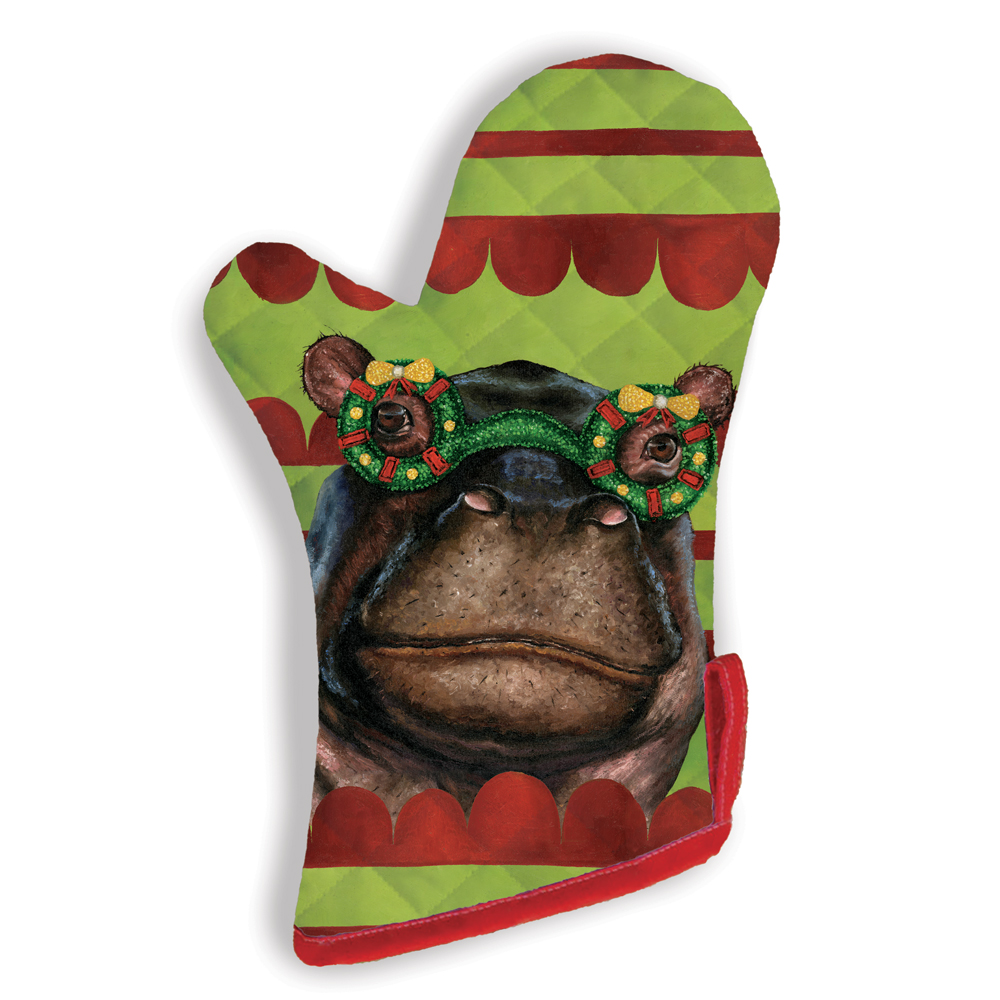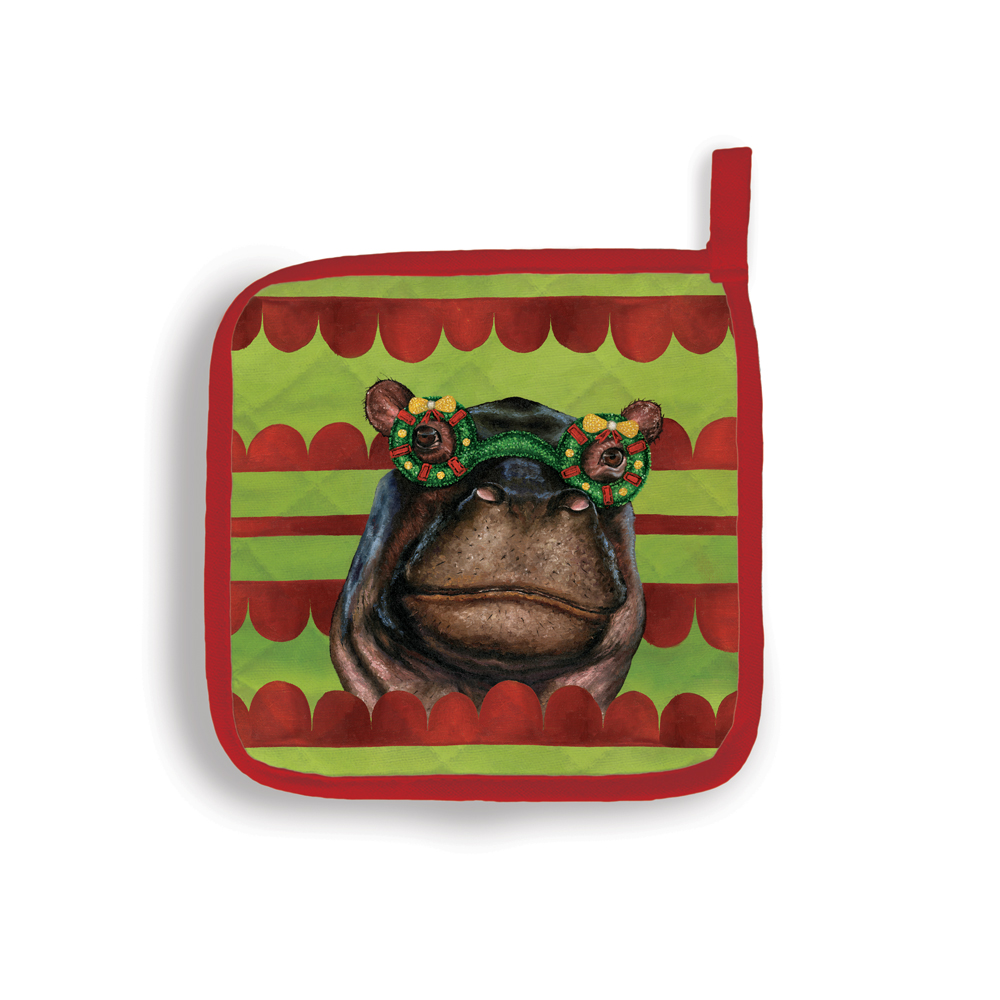 Cotton kitchen set, consisting of 1 x pot holder, 1 x oven glove and 1 x tea towel, featuring Whimsical Collection's 'Festive Hippo' from the 'Festive Party' range. The original paintings in the 'Festive Party' range were done in oils on canvas by South African artist Dezireë Smith.