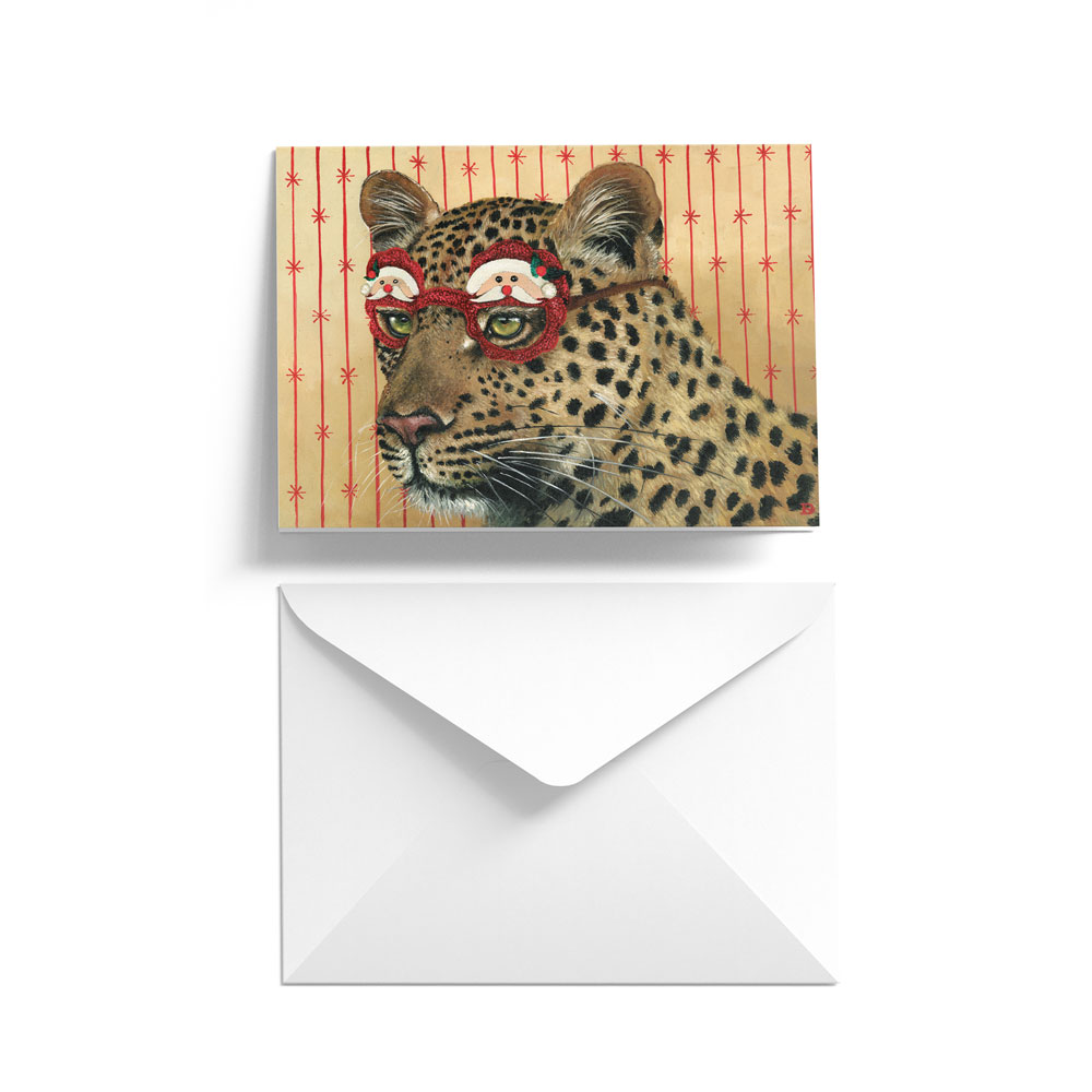 This blank A6 greeting card features the 'Festive Leopard' painting by artist Dezireë Smith. 'Festive Leopard' is part of the 'Festive Party' range by Whimsical Collection.