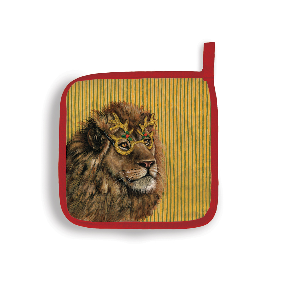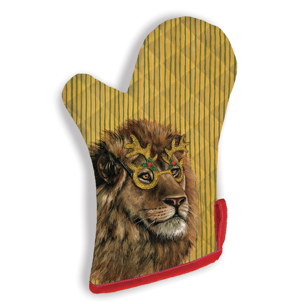 Cotton kitchen set, consisting of 1 x pot holder, 1 x oven glove and 1 x tea towel, featuring Whimsical Collection's 'Festive Lion' from the 'Festive Party' range. The original paintings in the 'Festive Party' range were done in oils on canvas by South African artist Dezireë Smith.