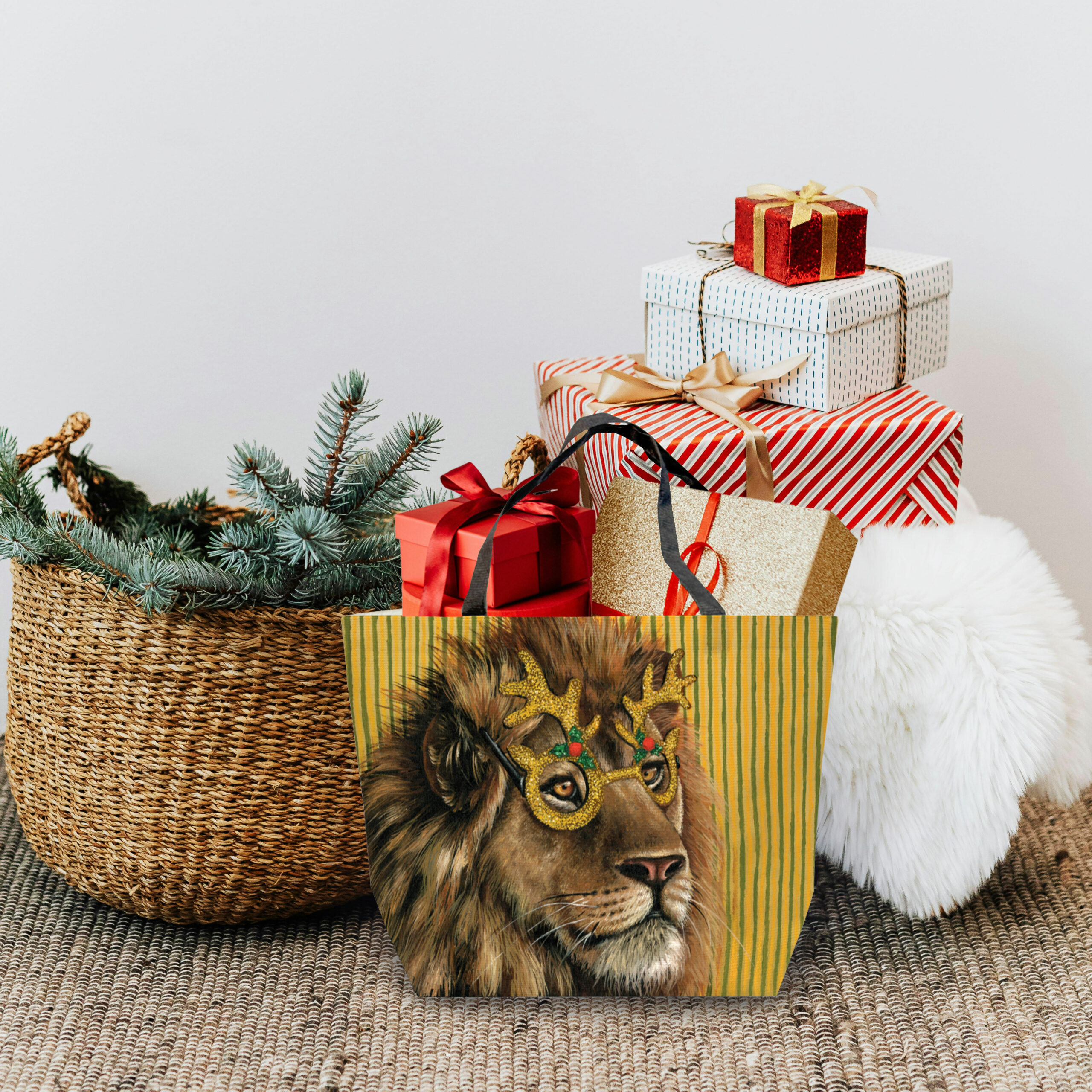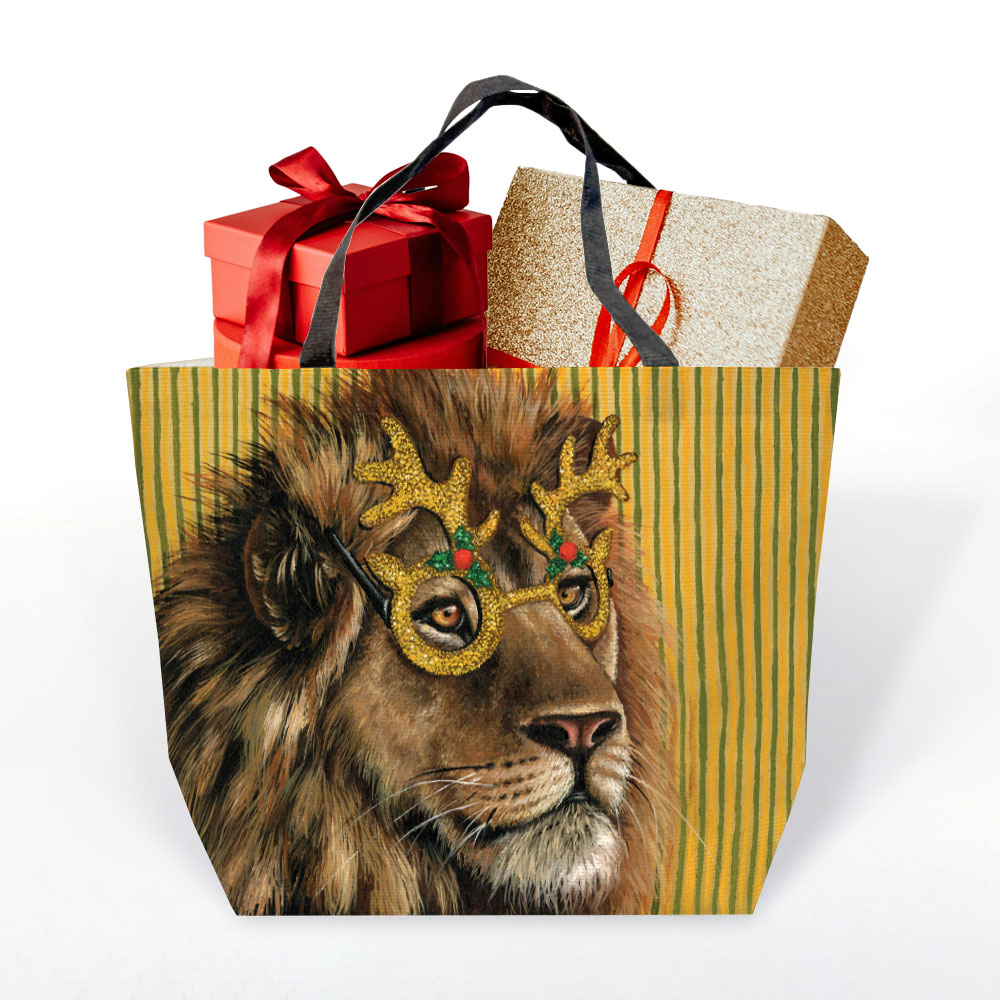 20L Shopping bag made from recycled fabric featuring 'Festive Lion' from Whimsical Collection's 'Festive Party' range. The original painting was done in oils on canvas by South African artist Dezireë Smith.