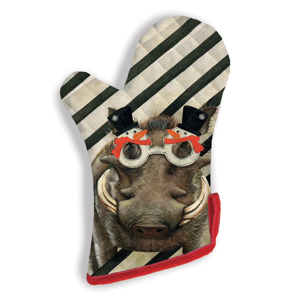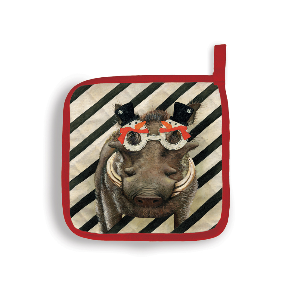 Cotton kitchen set, consisting of 1 x pot holder, 1 x oven glove and 1 x tea towel, featuring Whimsical Collection's 'Festive Warthog' from the 'Festive Party' range. The original paintings in the 'Festive Party' range were done in oils on canvas by South African artist Dezireë Smith.