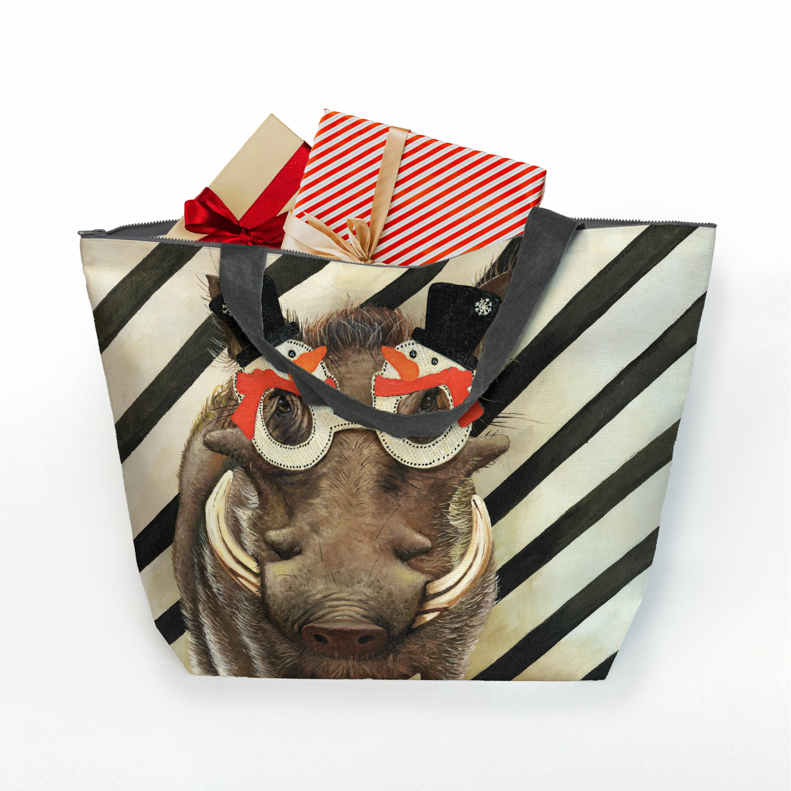 Maxi beach bag made from recycled fabric featuring 'Festive Warthog' from Whimsical Collection's 'Festive Party' range. The original painting was done in oils on canvas by South African artist Dezireë Smith.