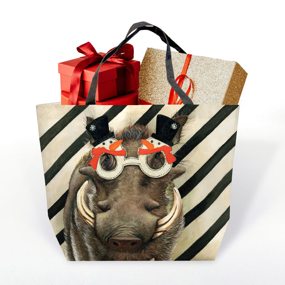 20L Shopping bag made from recycled fabric featuring 'Festive Warthog' from Whimsical Collection's 'Festive Party' range.  The original painting was done in oils on canvas by South African artist Dezireë Smith.