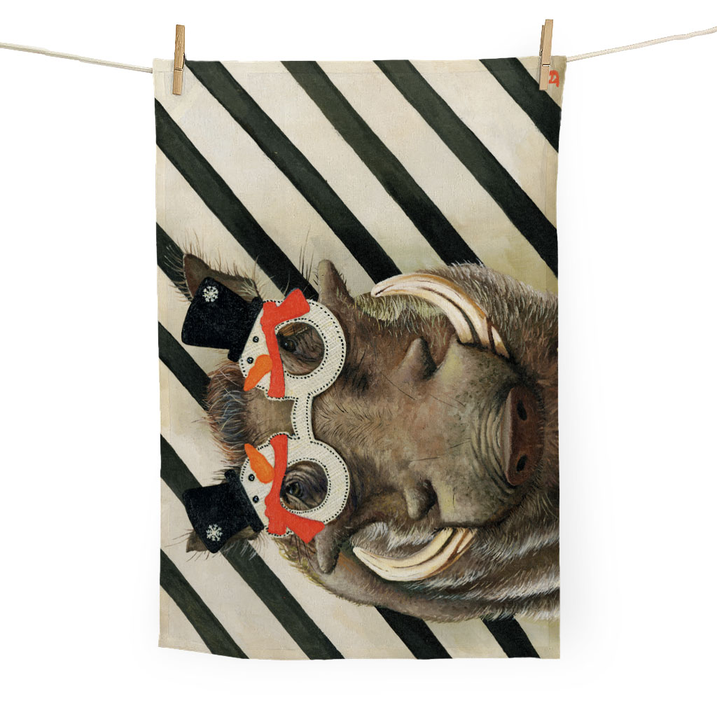 100% Cotton tea towel featuring 'Festive Warthog' from the 'Festive Party' range by Whimsical Collection. The original painting was done in oils on canvas by South African artist Dezireë Smith.