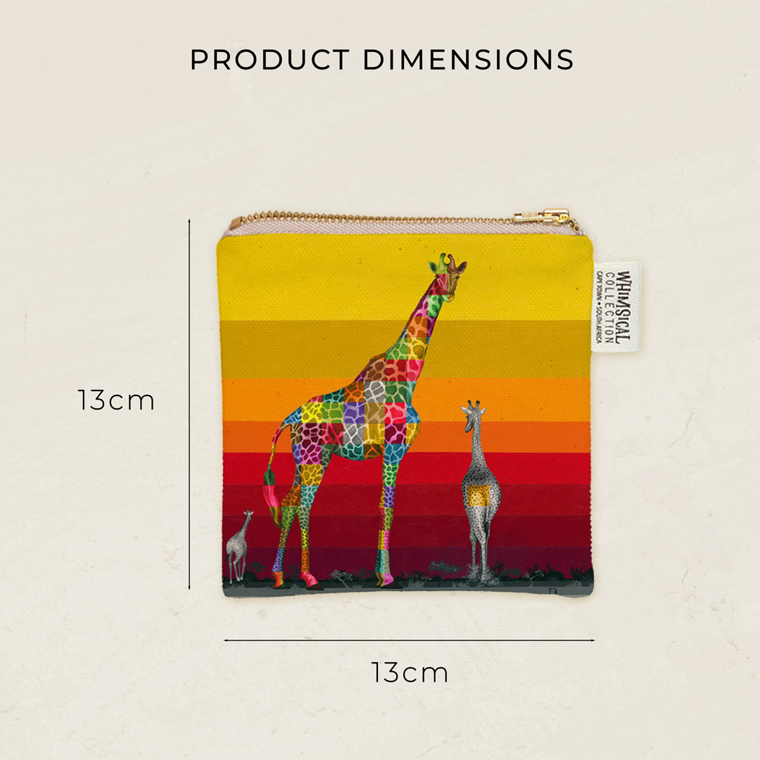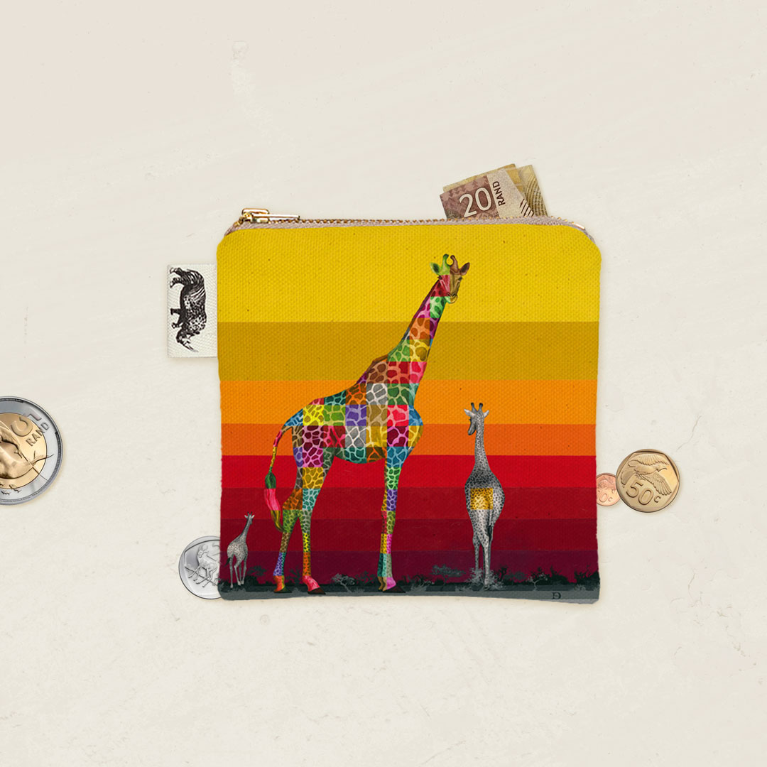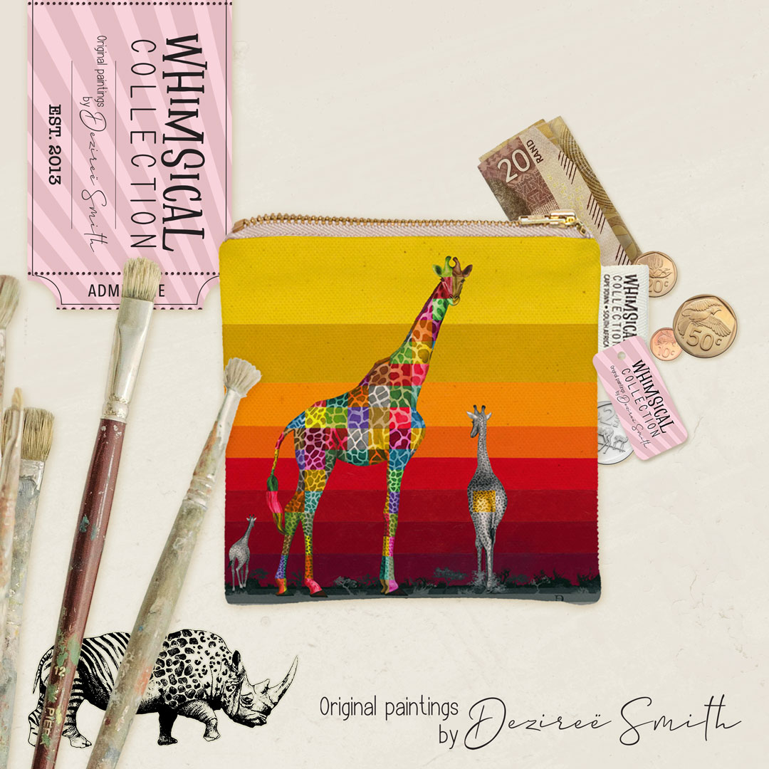 100% Cotton coin purse featuring 'Giraffe in Colour' from Whimsical Collection's 'Wildlife in Colour' range. The original painting was done in oils on canvas by South African artist Dezireë Smith.