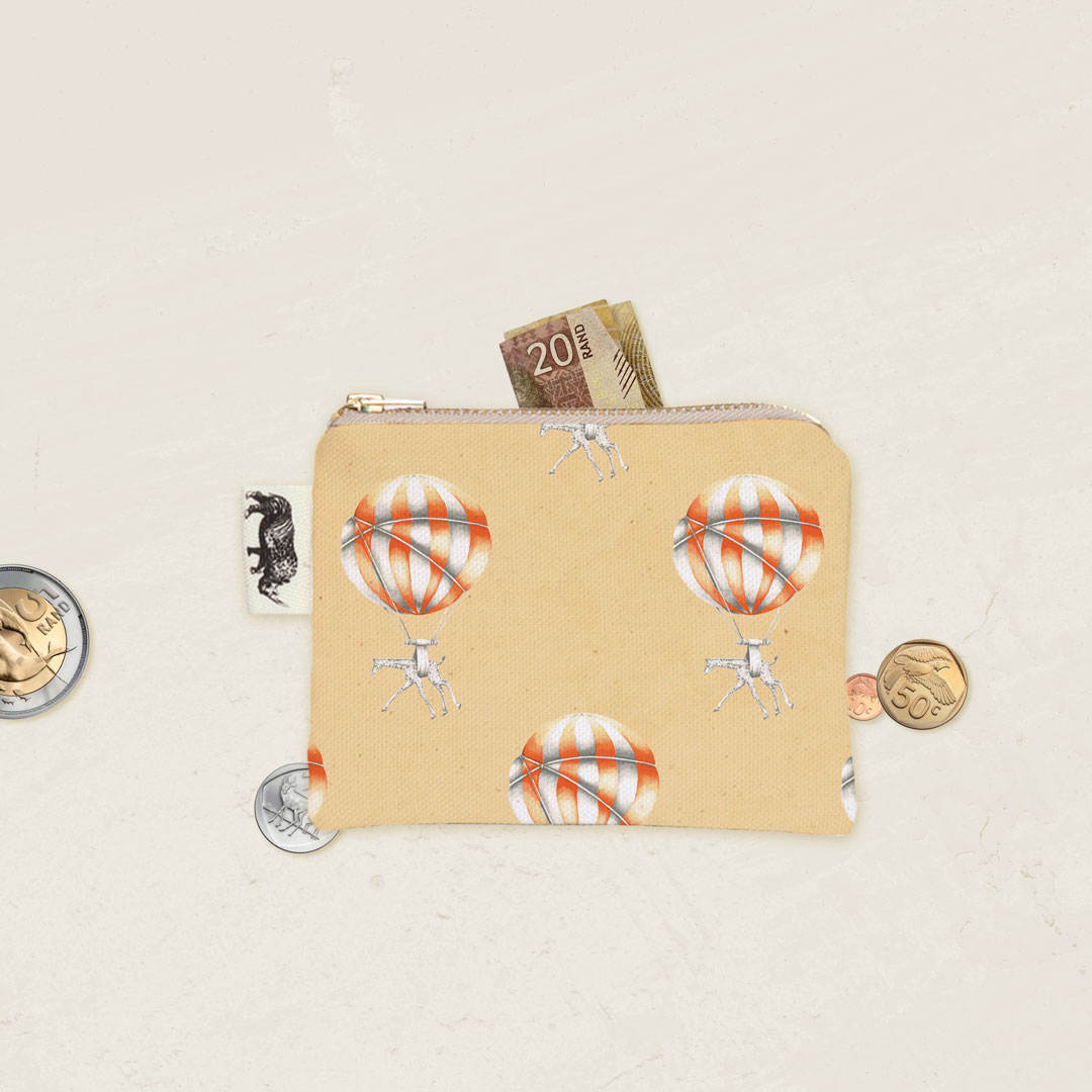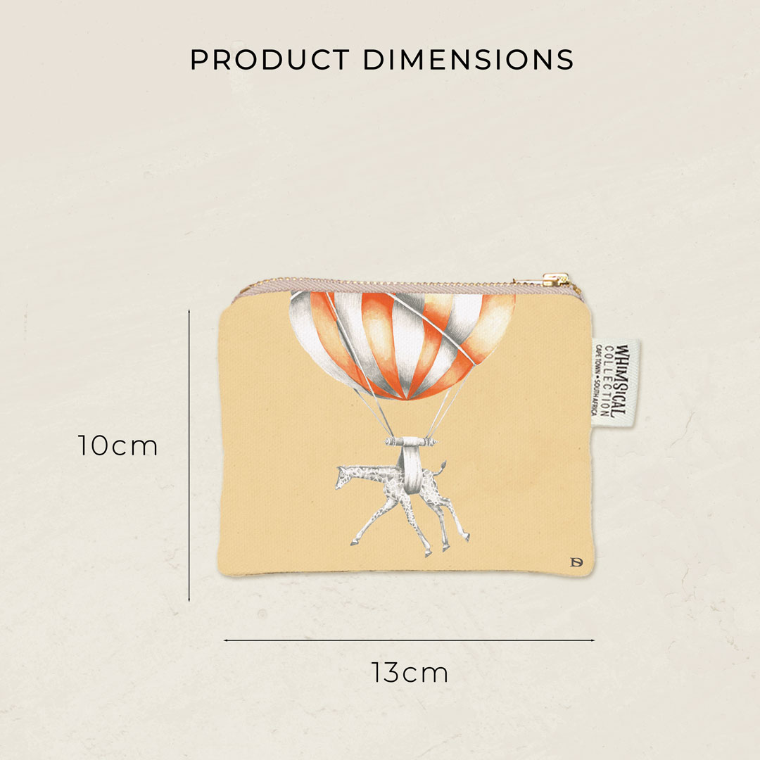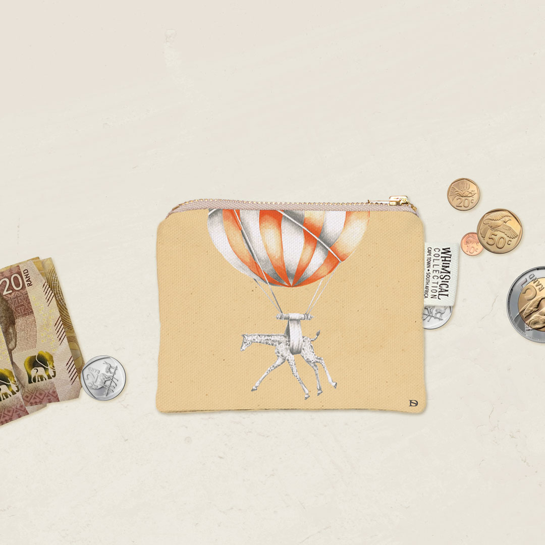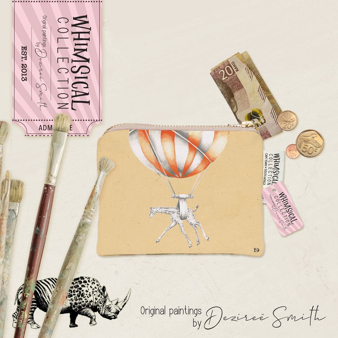 100% Cotton coin purse featuring 'Giraffe in Flight' from Whimsical Collection's 'Wildlife in Flight' range. The original artwork was done in paint and pencil on paper by South African artist Dezireë Smith.