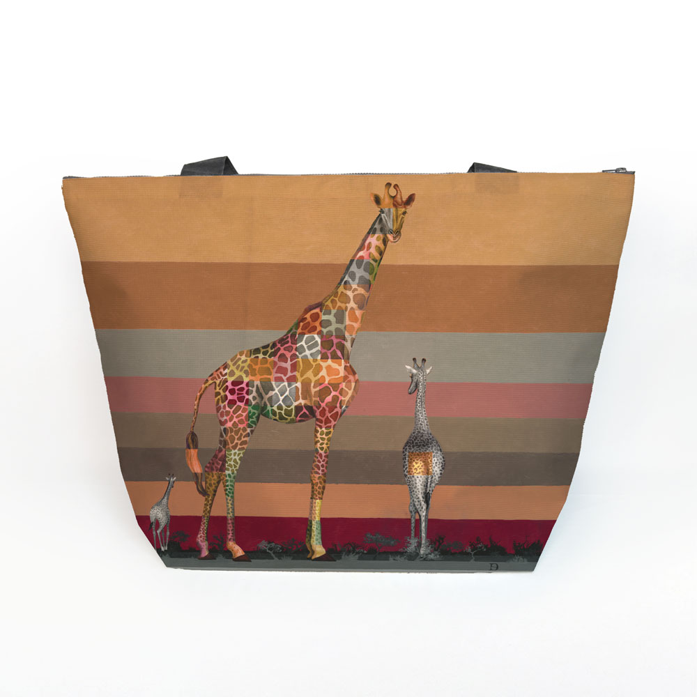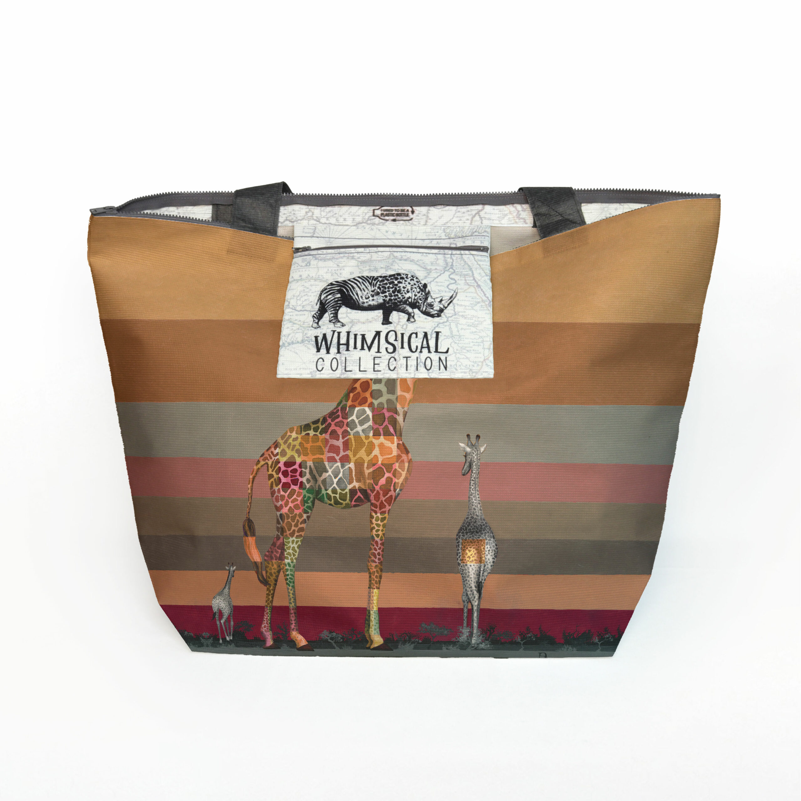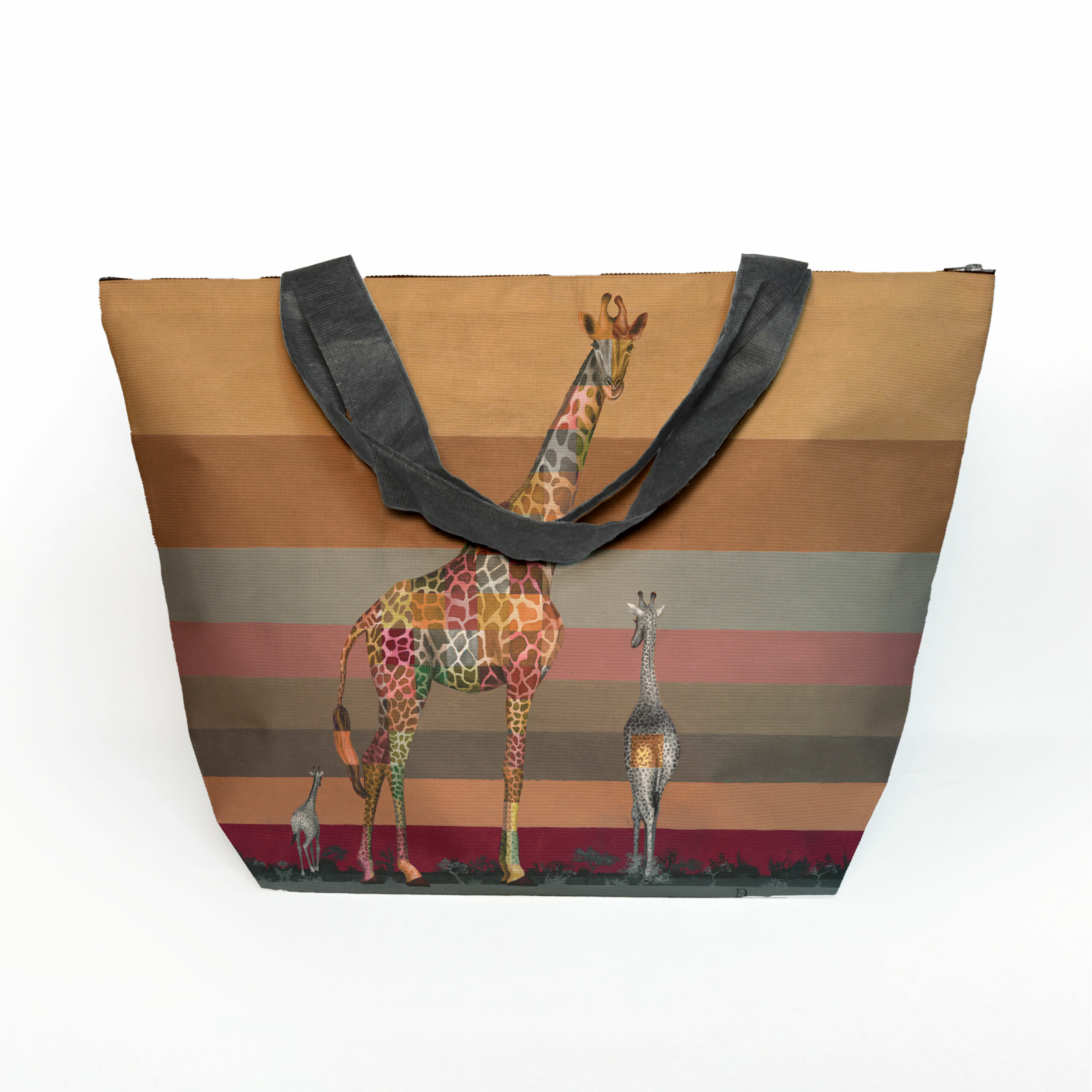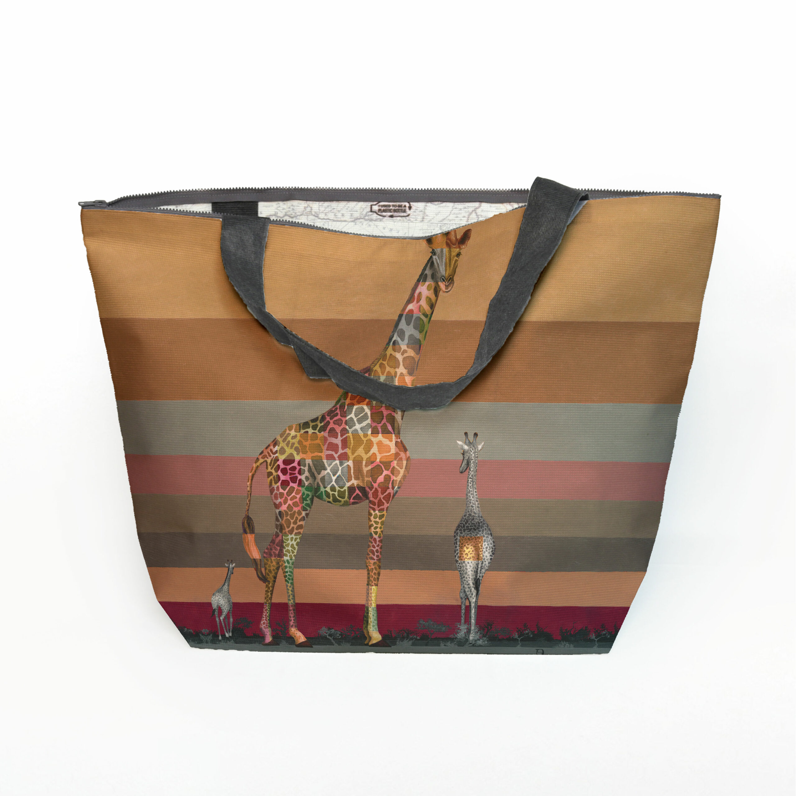 Maxi beach bag made from recycled fabric featuring 'Giraffe in Shades of Africa' from Whimsical Collection's 'Wildlife in Colour' range. The Shades of Africa range is a colour adaptation of the original 'Wildlife in Colour' paintings done in oils on canvas by South African artist Dezireë Smith.