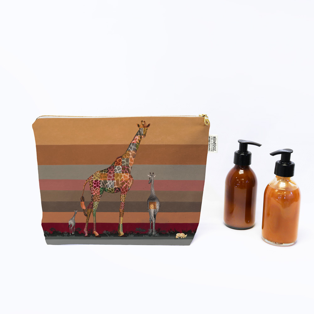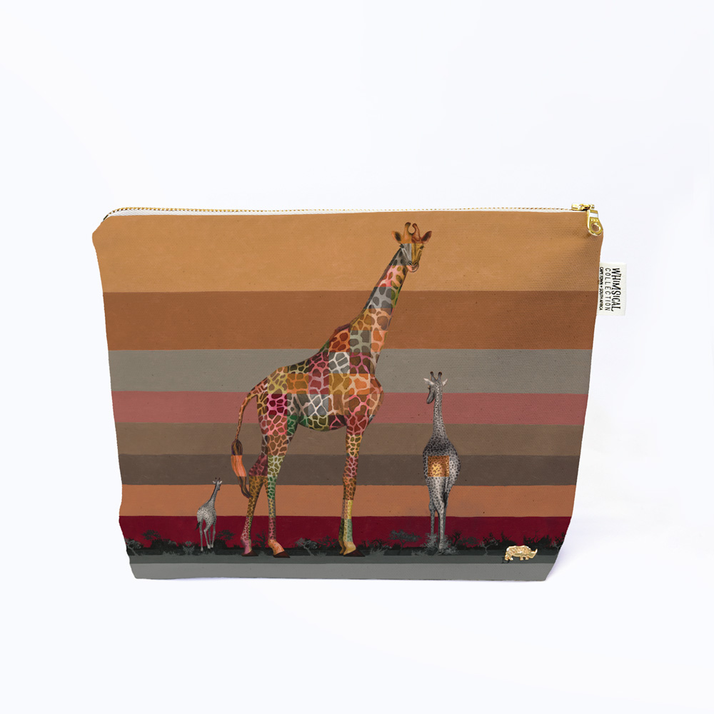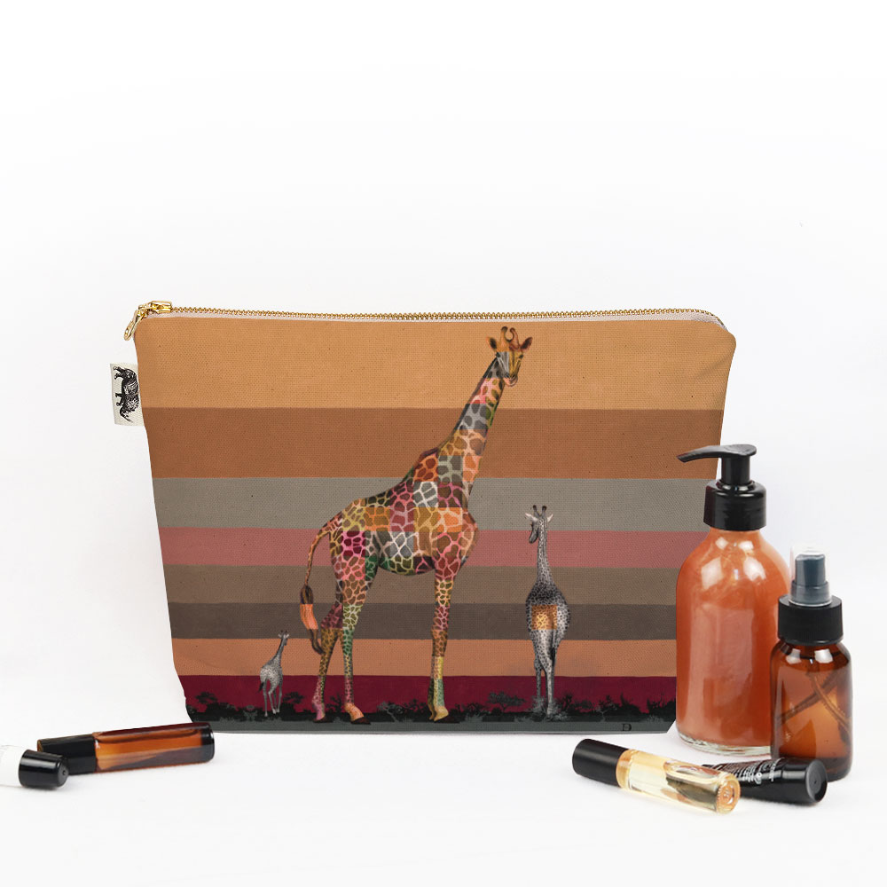 100% Cotton toiletry bag featuring 'Giraffe in Shades of Africa' from Whimsical Collection's 'Wildlife in Shades of Africa' range. The Shades of Africa range is a colour adaptation of the original 'Wildlife in Colour' paintings done in oils on canvas by South African artist Dezireë Smith.
