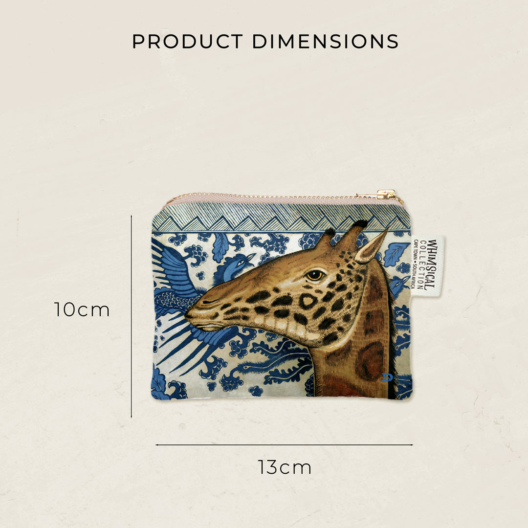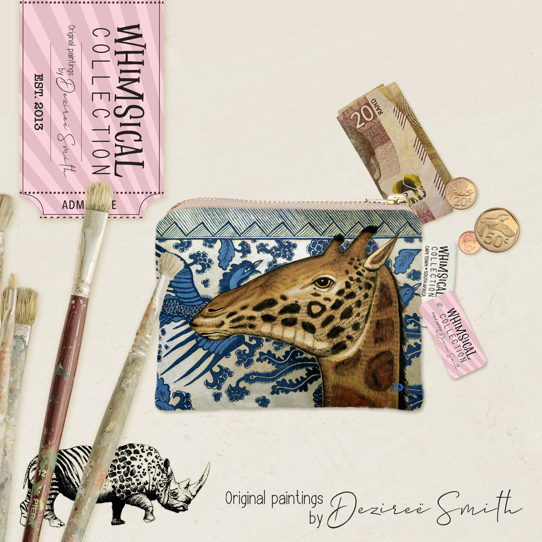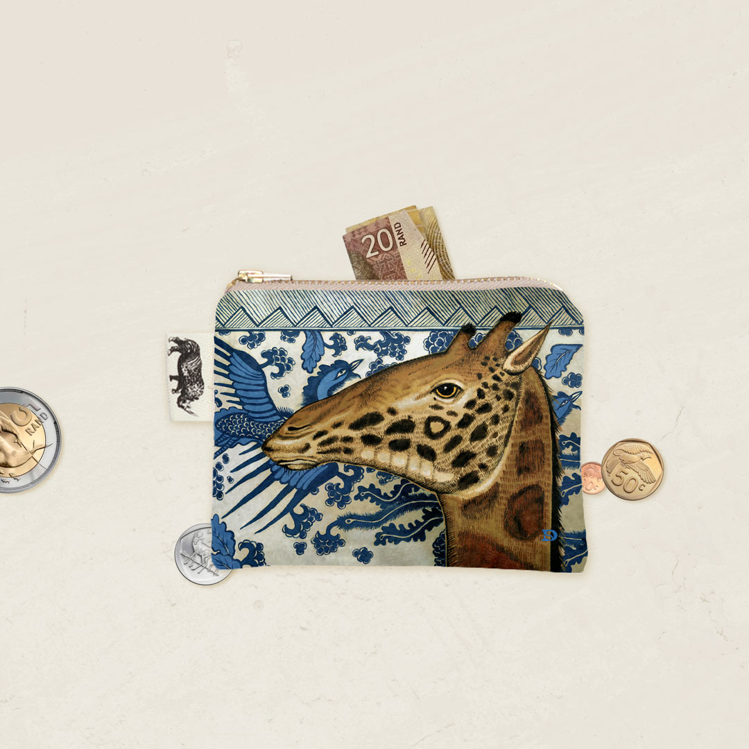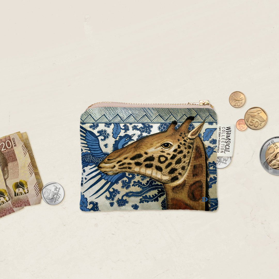 Velvet coin purse featuring 'Giraffe Ornament' from Whimsical Collection's 'African Ornaments' range. The original painting was done in oils on canvas by South African artist Dezireë Smith.