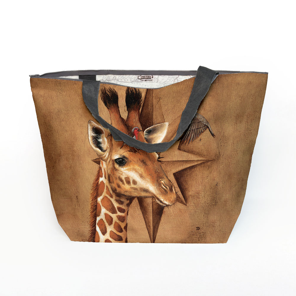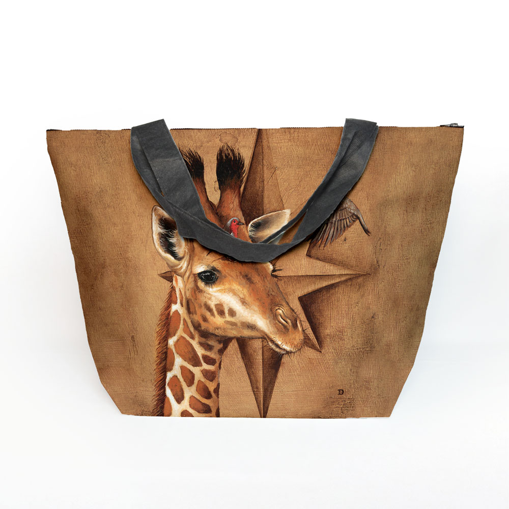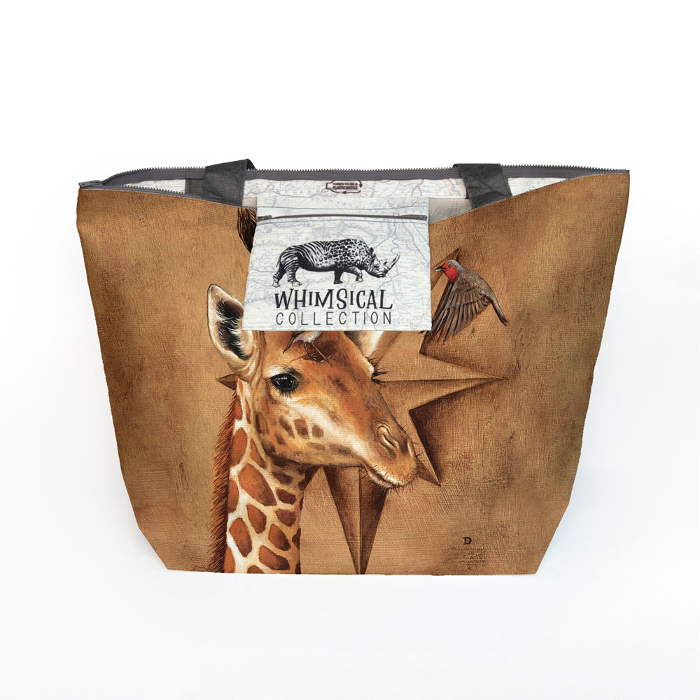 Maxi beach bag made from recycled fabric featuring 'Golden Giraffe' from Whimsical Collection's 'Golden Christmas' range. The original painting was done in oils on canvas by South African artist Dezireë Smith.