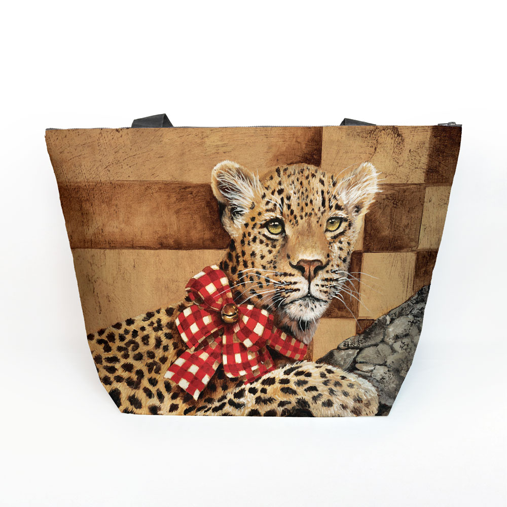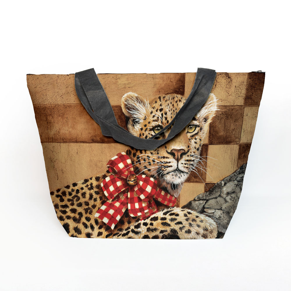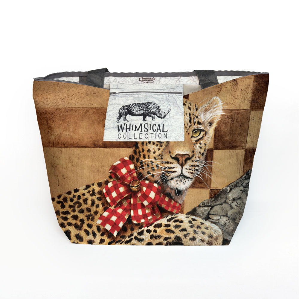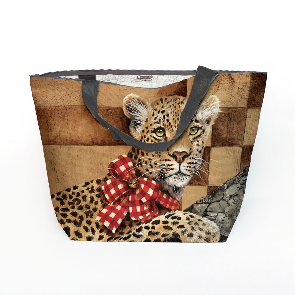 Maxi beach bag made from recycled fabric featuring 'Golden Leopard' from Whimsical Collection's 'Golden Christmas' range. The original painting was done in oils on canvas by South African artist Dezireë Smith.