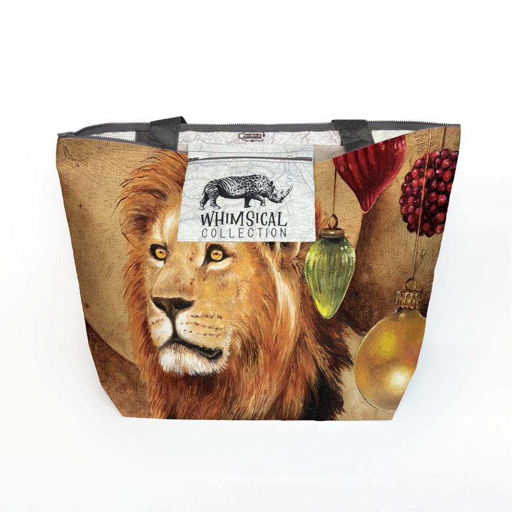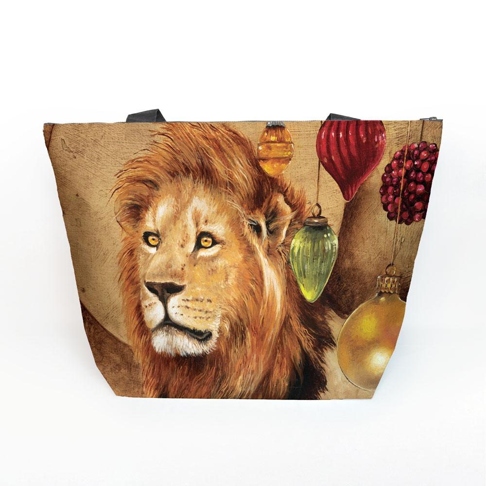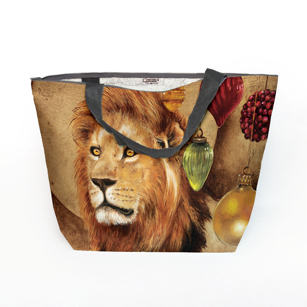 Maxi beach bag made from recycled fabric featuring 'Golden Lion' from Whimsical Collection's 'Golden Christmas' range. The original painting was done in oils on canvas by South African artist Dezireë Smith.