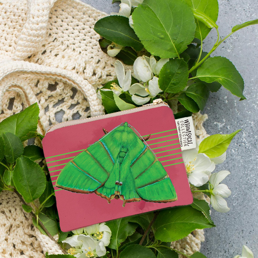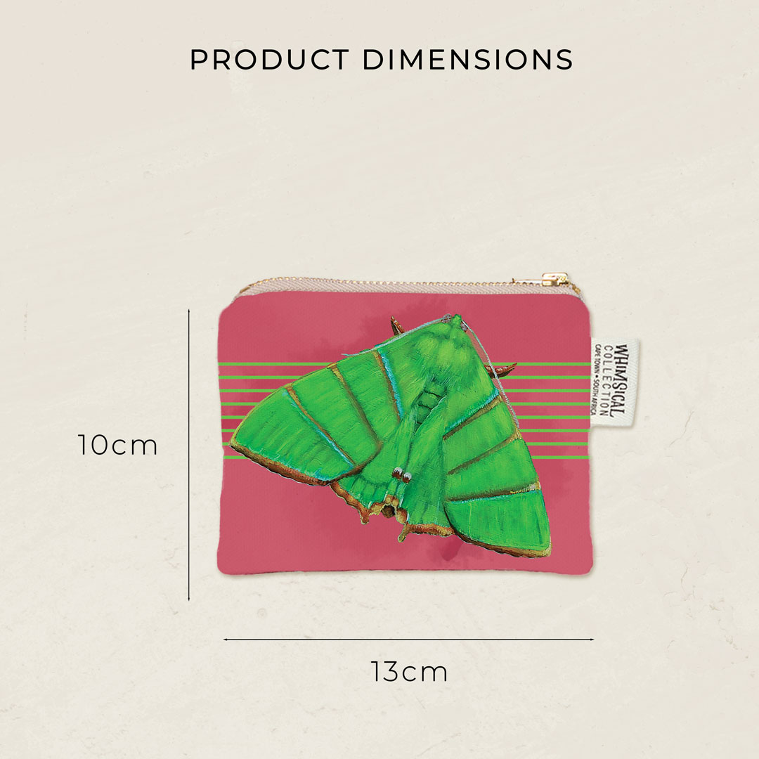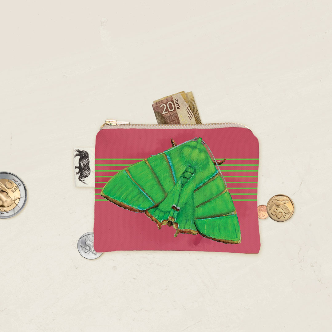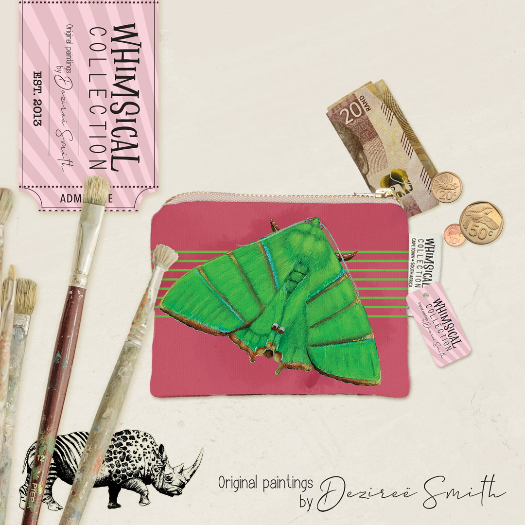 100% Cotton coin purse featuring a 'Green Tiger Moth' from Whimsical Collection's 'Moths & Butterflies' collection in the 'African Insects' range. Although not native to Africa we have included the Blue Butterfly in this range as the original painting was done by South African artist Dezireë Smith.