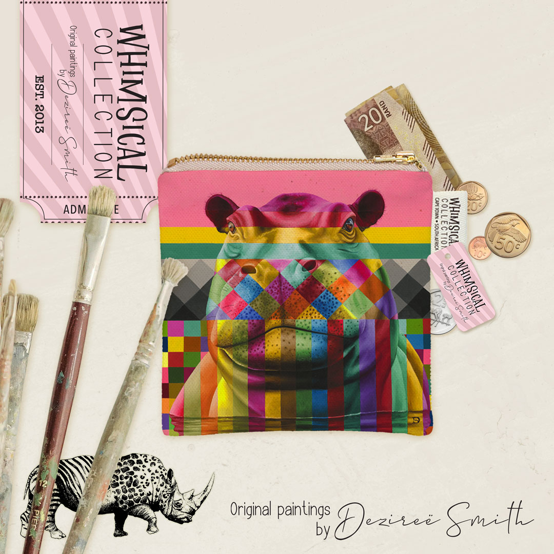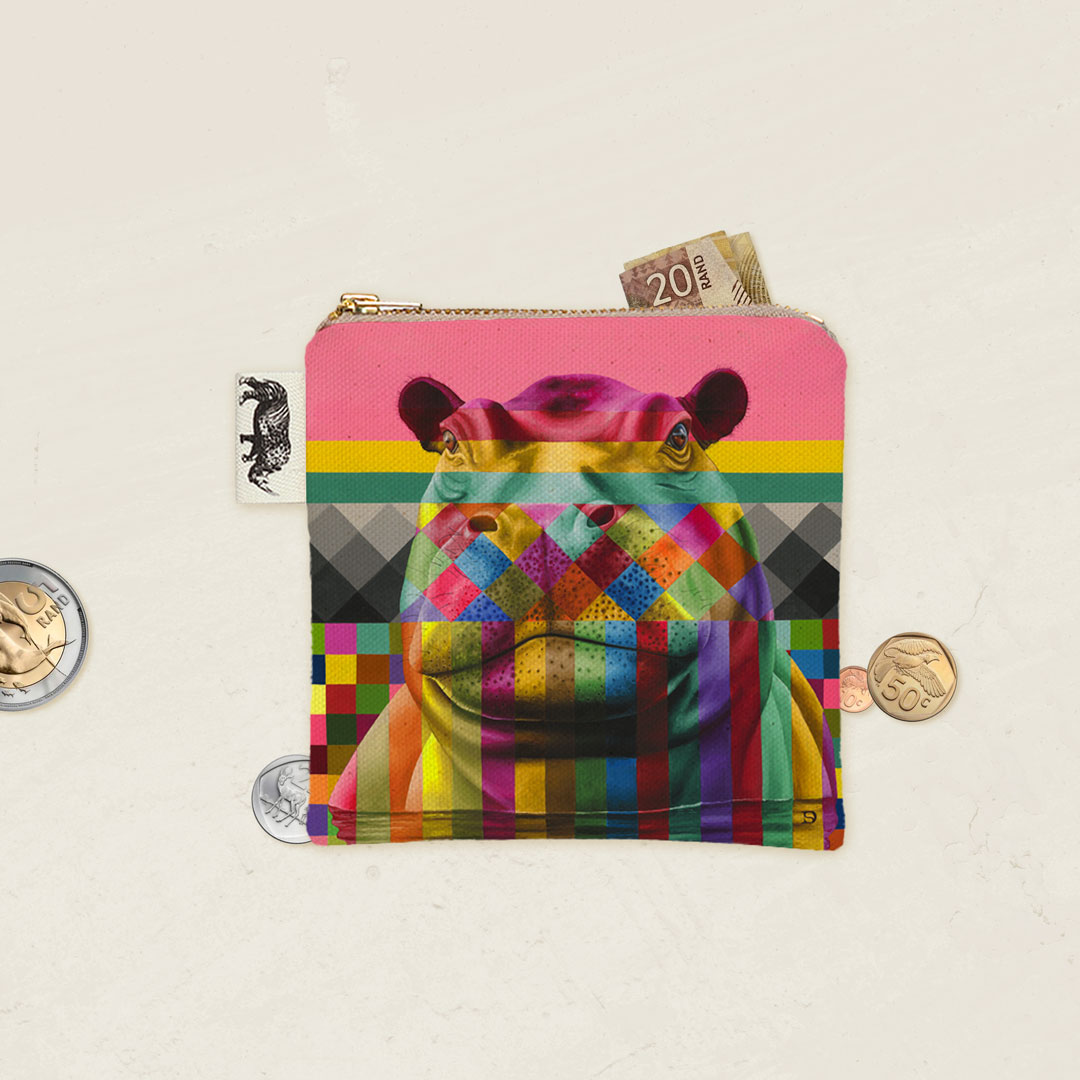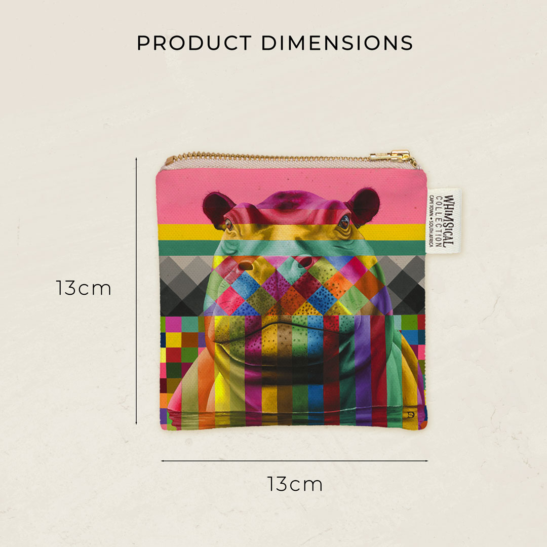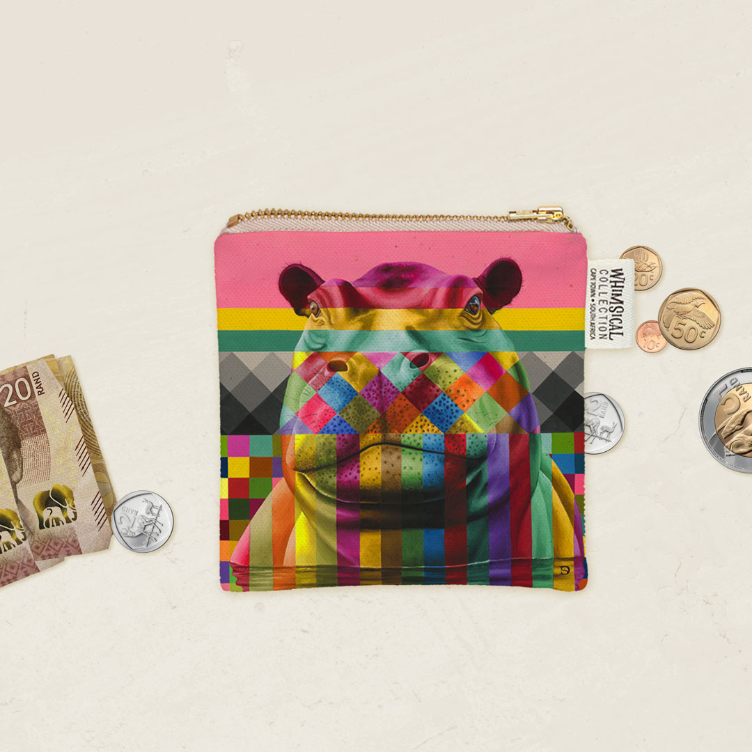 100% Cotton coin purse featuring 'Hippo in Colour' from Whimsical Collection's 'Wildlife in Colour' range. The original painting was done in oils on canvas by South African artist Dezireë Smith.