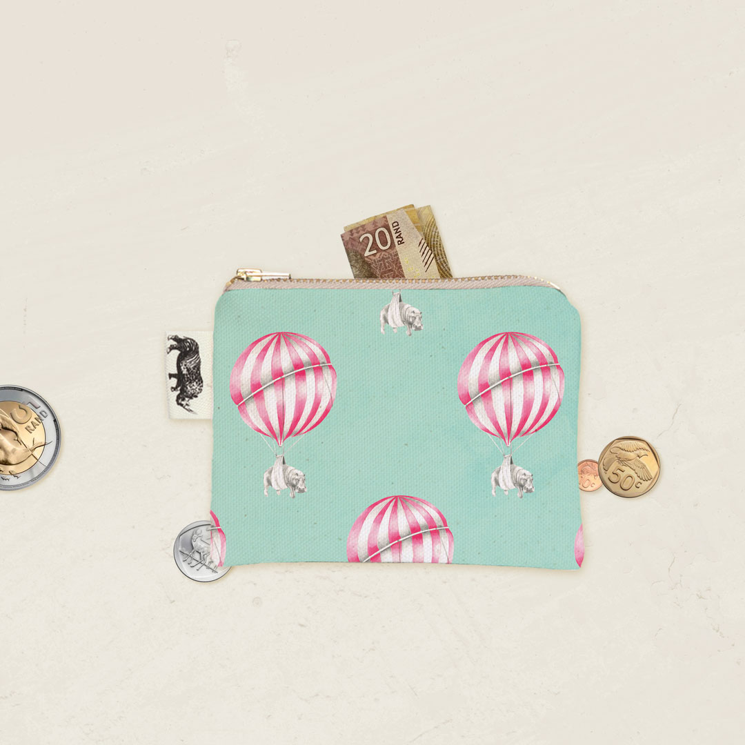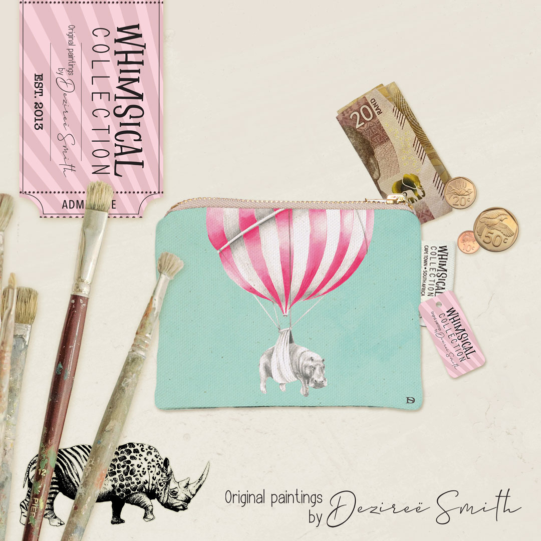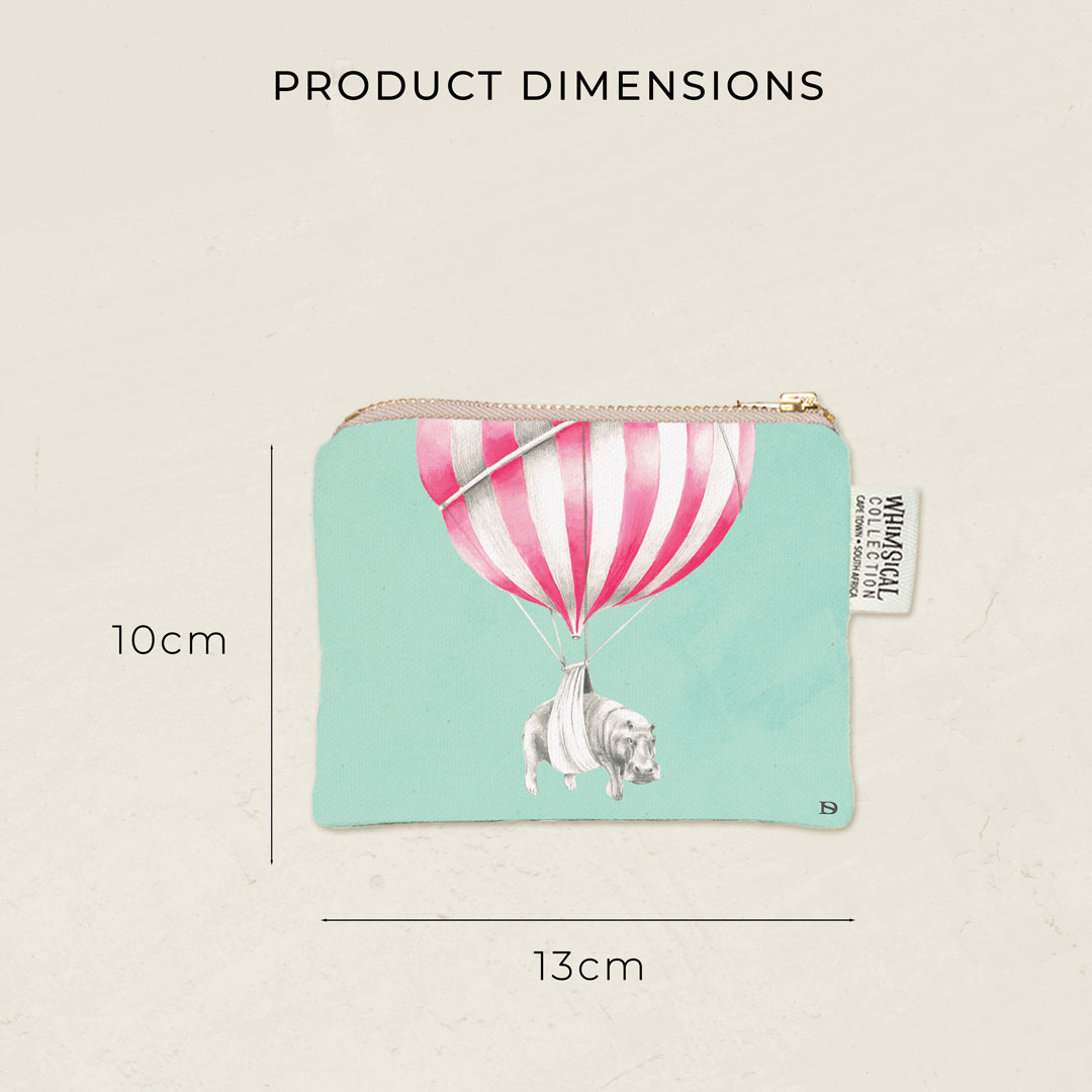 100% Cotton coin purse featuring 'Hippo in Flight' from Whimsical Collection's 'Wildlife in Flight' range. The original artwork was done in paint and pencil on paper by South African artist Dezireë Smith.