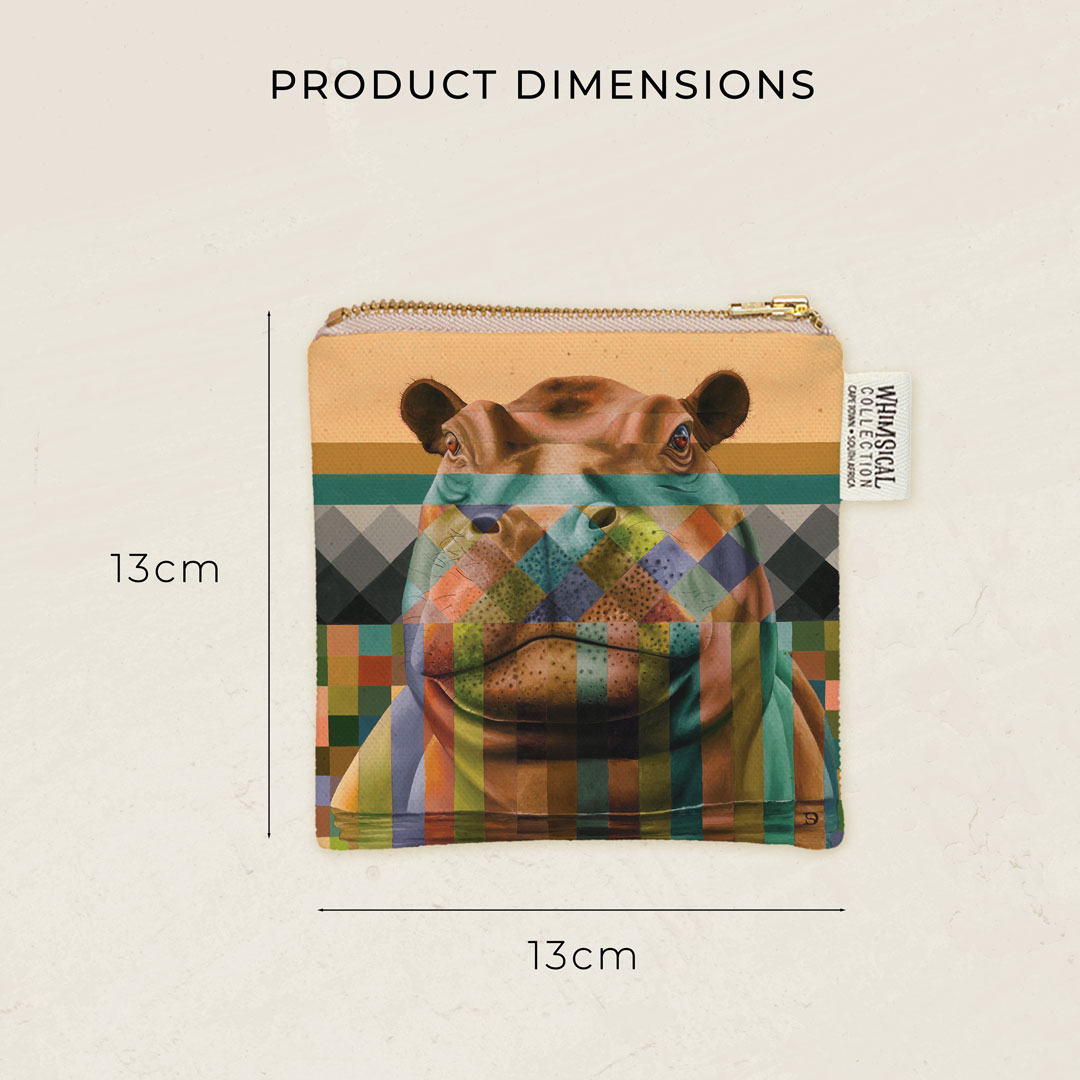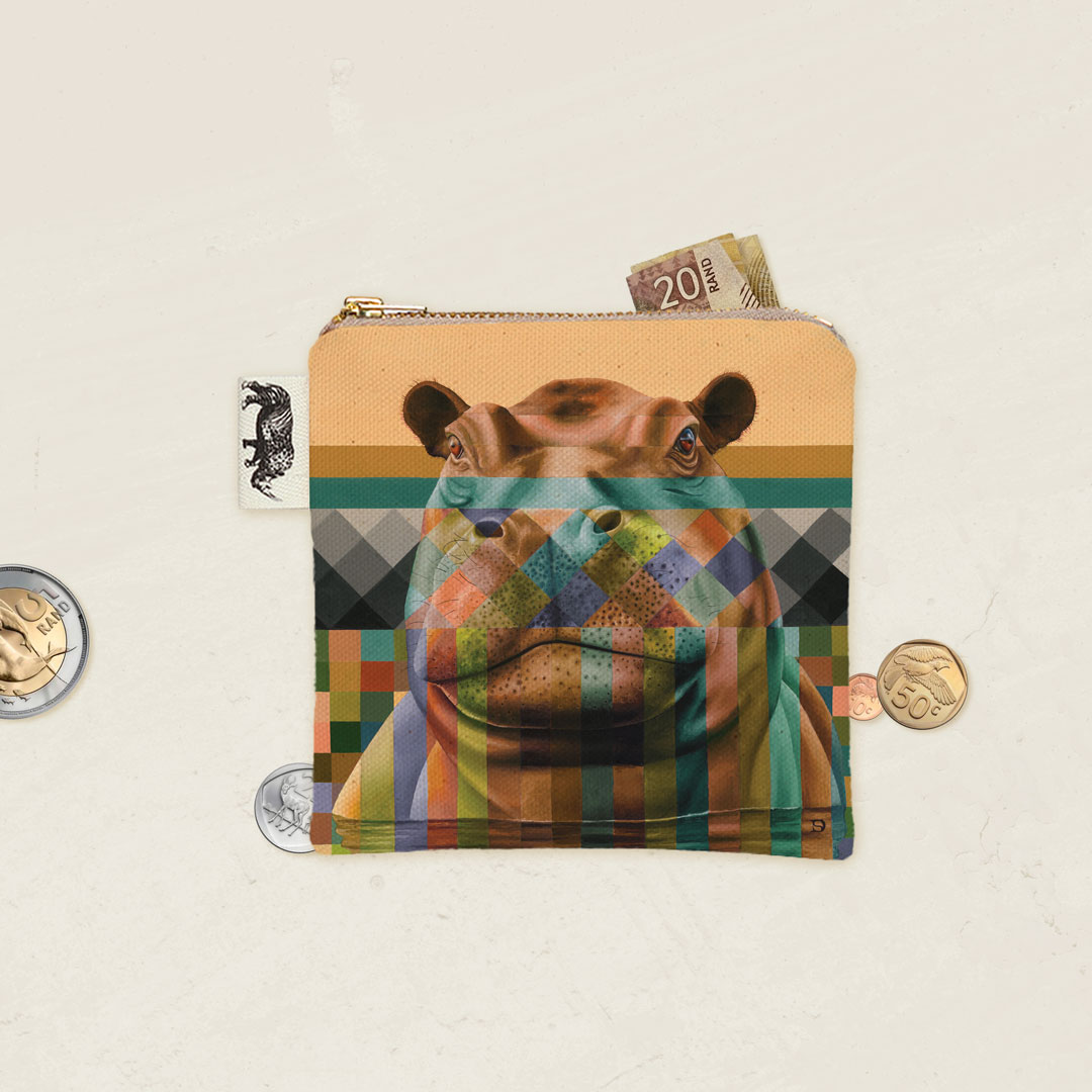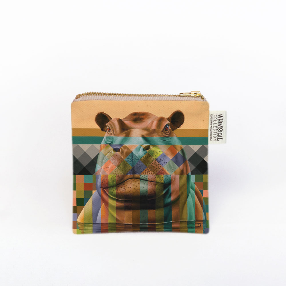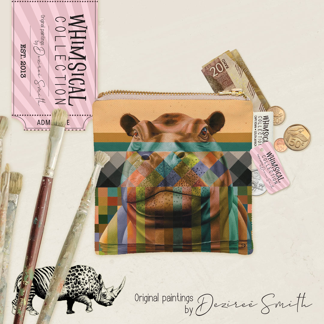 100% Cotton coin purse featuring 'Hippo in Shades of Africa' from Whimsical Collection's 'Shades of Africa' range. The Shades of Africa range is a colour adaptation of the original 'Wildlife in Colour' paintings done in oils on canvas by South African artist Dezireë Smith.