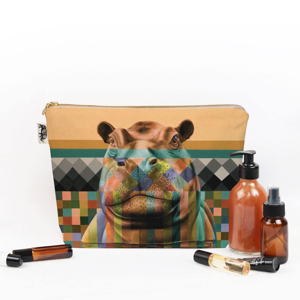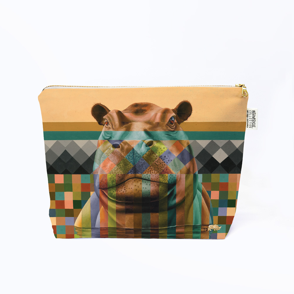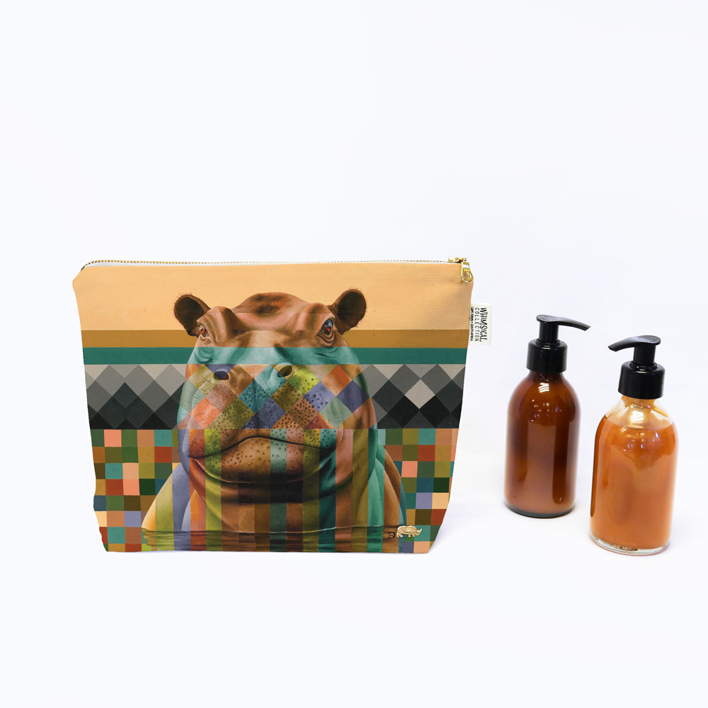 100% Cotton toiletry bag featuring 'Hippo in Shades of Africa' from Whimsical Collection's 'Wildlife in Shades of Africa' range. The Shades of Africa range is a colour adaptation of the original 'Wildlife in Colour' paintings done in oils on canvas by South African artist Dezireë Smith.
