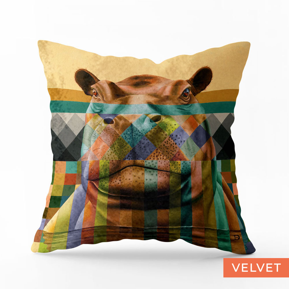 Velvet pillow cover featuring the hippo design from the 'Shades of Africa' range by Whimsical Collection. The Shades of Africa range is a colour adaptation of the original 'Wildlife in Colour' paintings done in oils on canvas by South African artist Dezireë Smith.