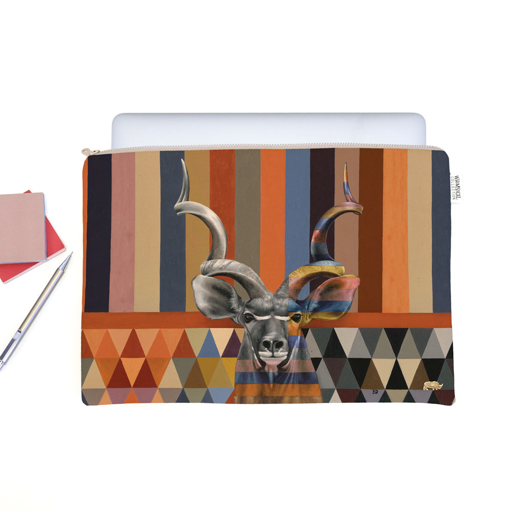 100% Cotton laptop sleeve featuring 'Kudu in Shades of Africa' from Whimsical Collection's 'Shades of Africa' range. The Shades of Africa range is a colour adaptation of the original 'Wildlife in Colour' paintings done in oils on canvas by South African artist Dezireë Smith.