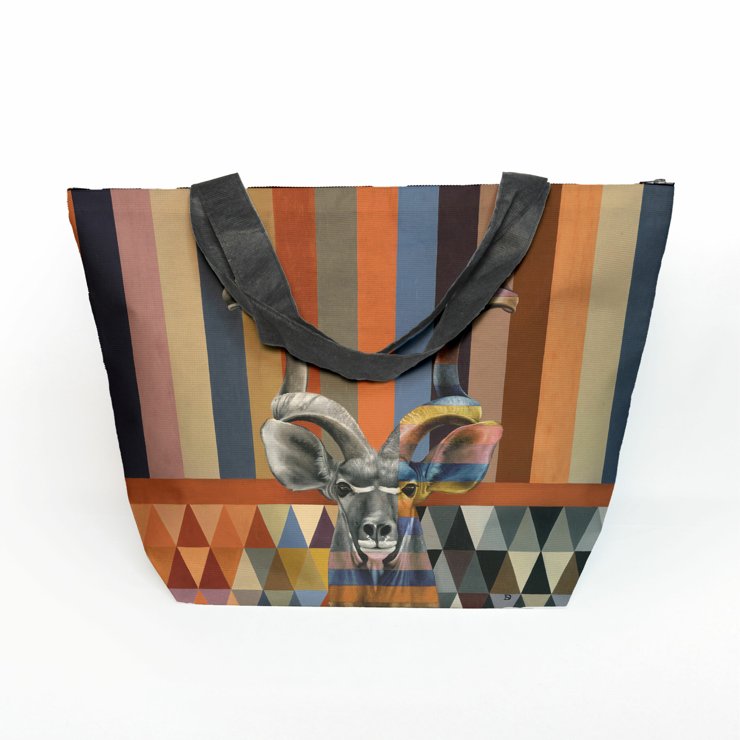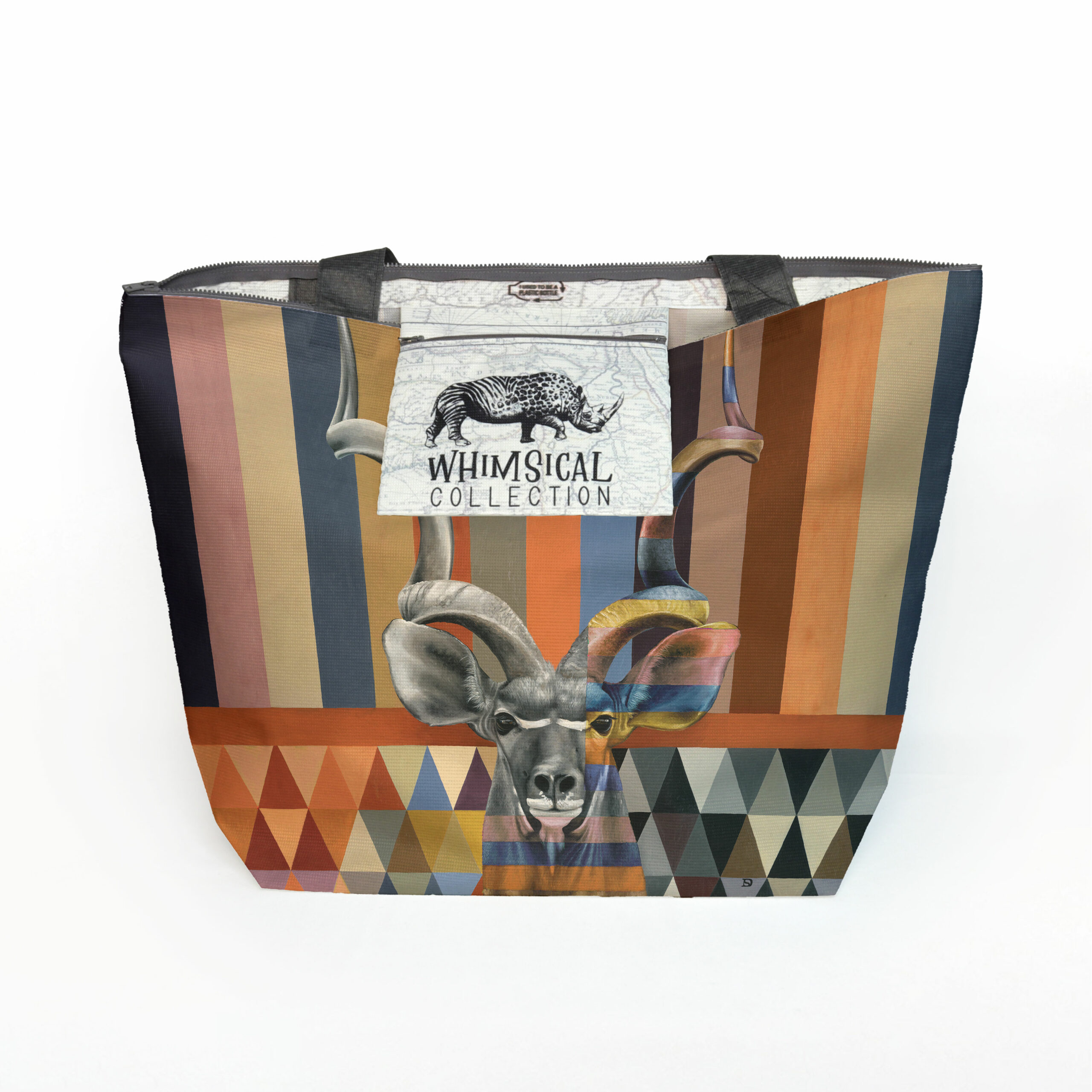 Maxi beach bag made from recycled fabric featuring 'Kudu in Shades of Africa' from Whimsical Collection's 'Wildlife in Colour' range. The Shades of Africa range is a colour adaptation of the original 'Wildlife in Colour' paintings done in oils on canvas by South African artist Dezireë Smith.