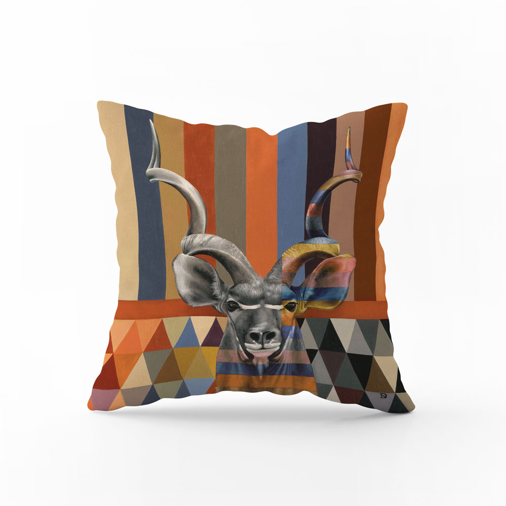 100% Cotton pillow cover featuring the kudu design from the 'Shades of Africa' range by Whimsical Collection. The Shades of Africa range is a colour adaptation of the original 'Wildlife in Colour' paintings done in oils on canvas by South African artist Dezireë Smith.