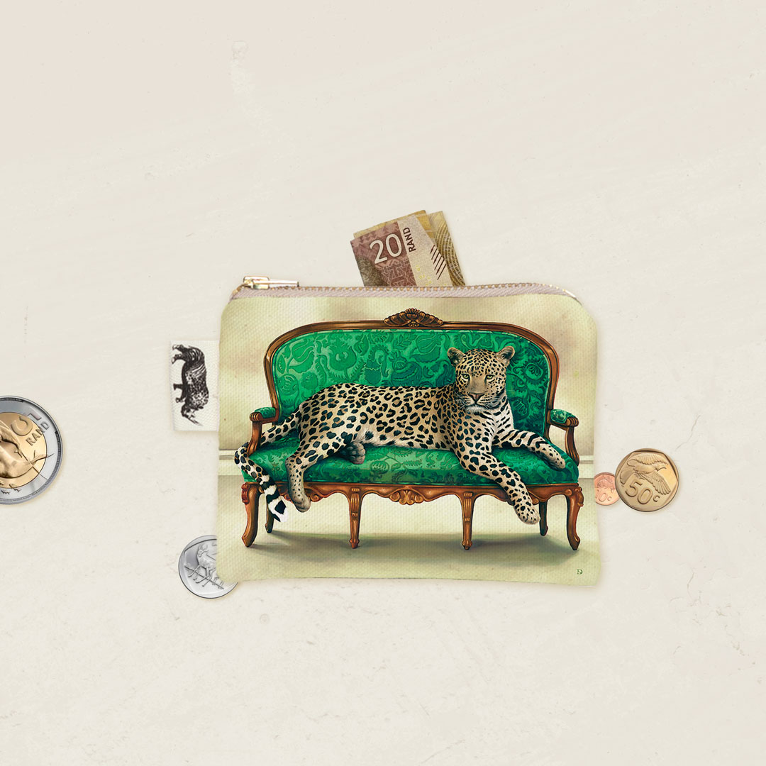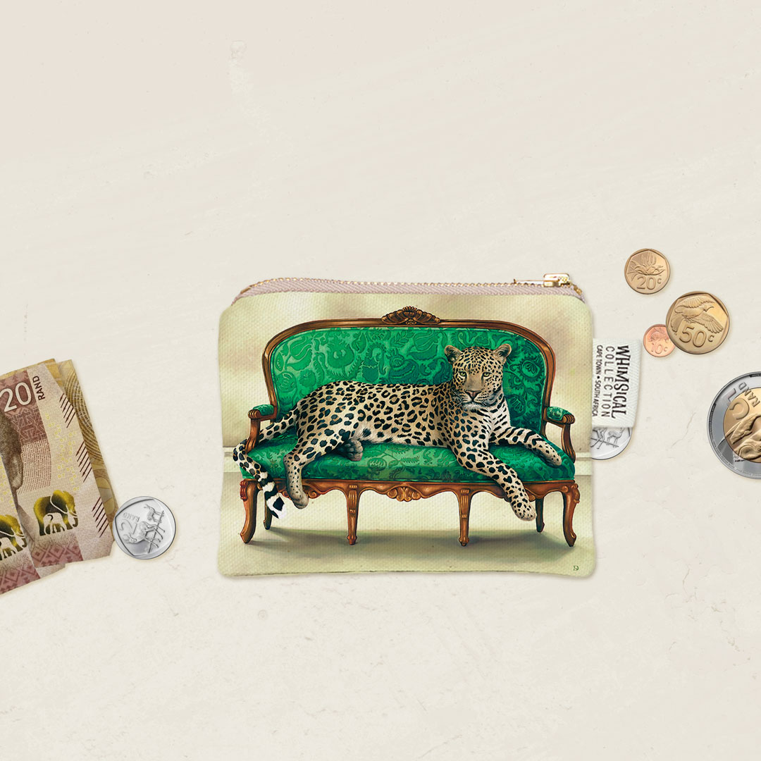 Design: Leopard at Leisure – an adult leopard on a green brocade sofa