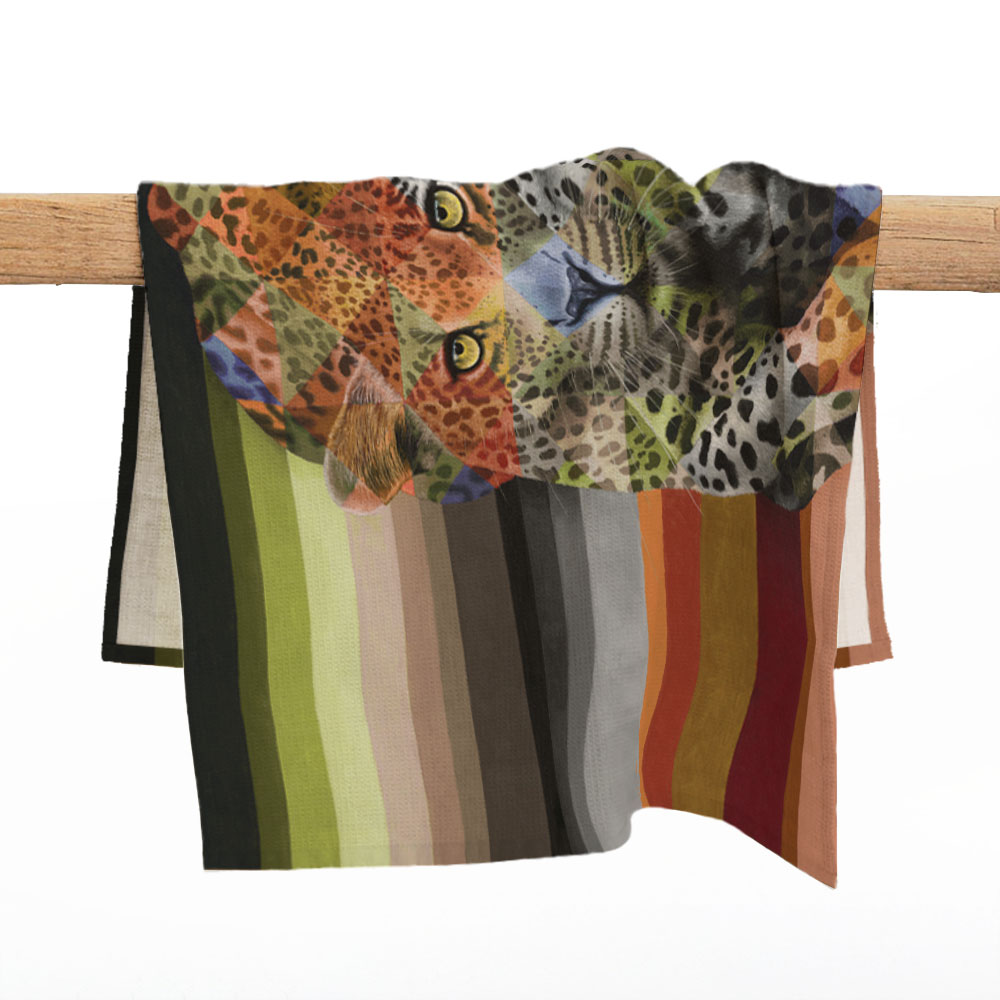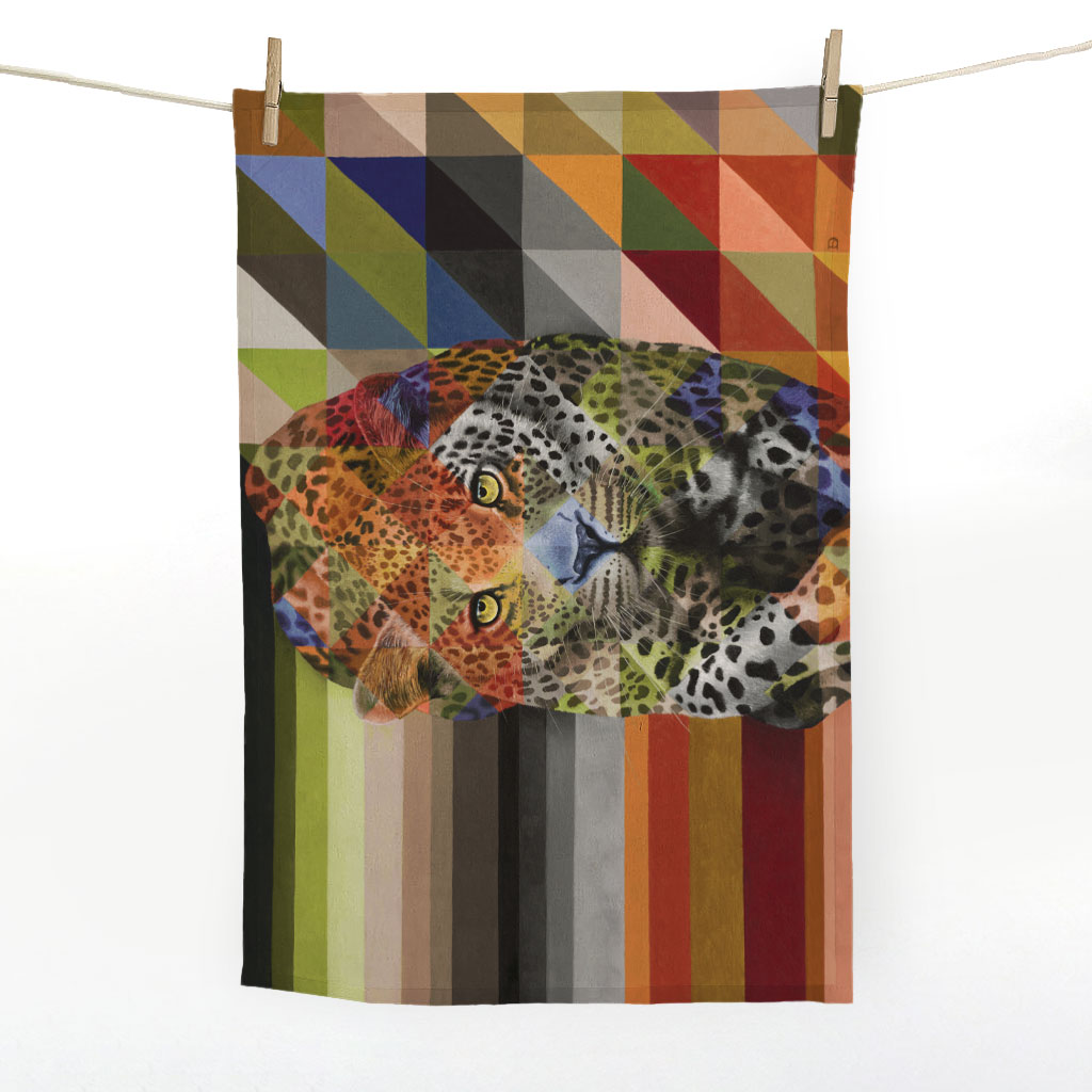 100% Cotton tea towel featuring 'Leopard in Shades of Africa' from the 'Shades of Africa' range by Whimsical Collection. The Shades of Africa range is a colour adaptation of the original 'Wildlife in Colour' paintings done in oils on canvas by South African artist Dezireë Smith.