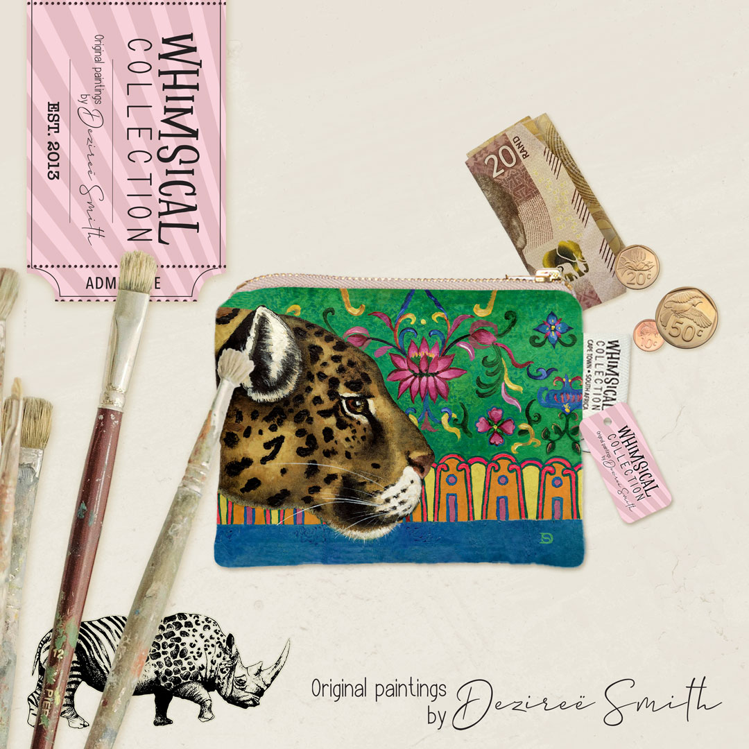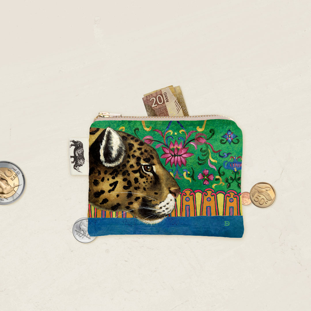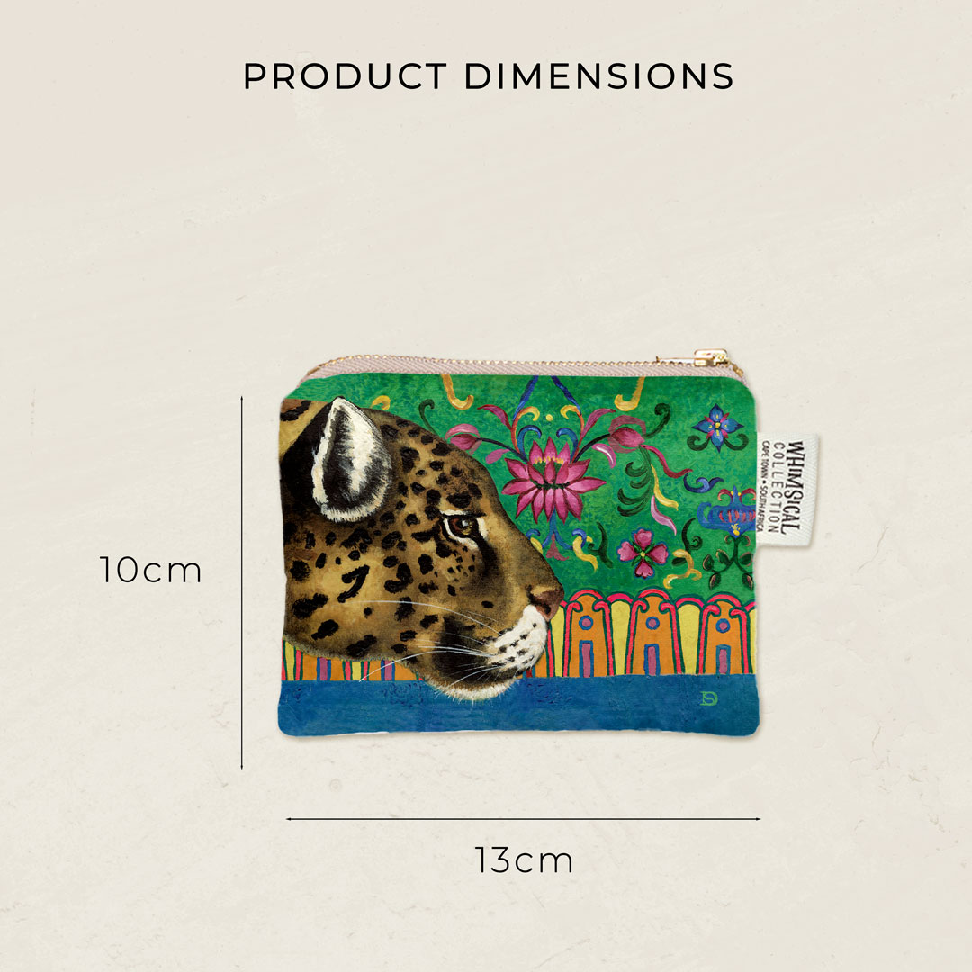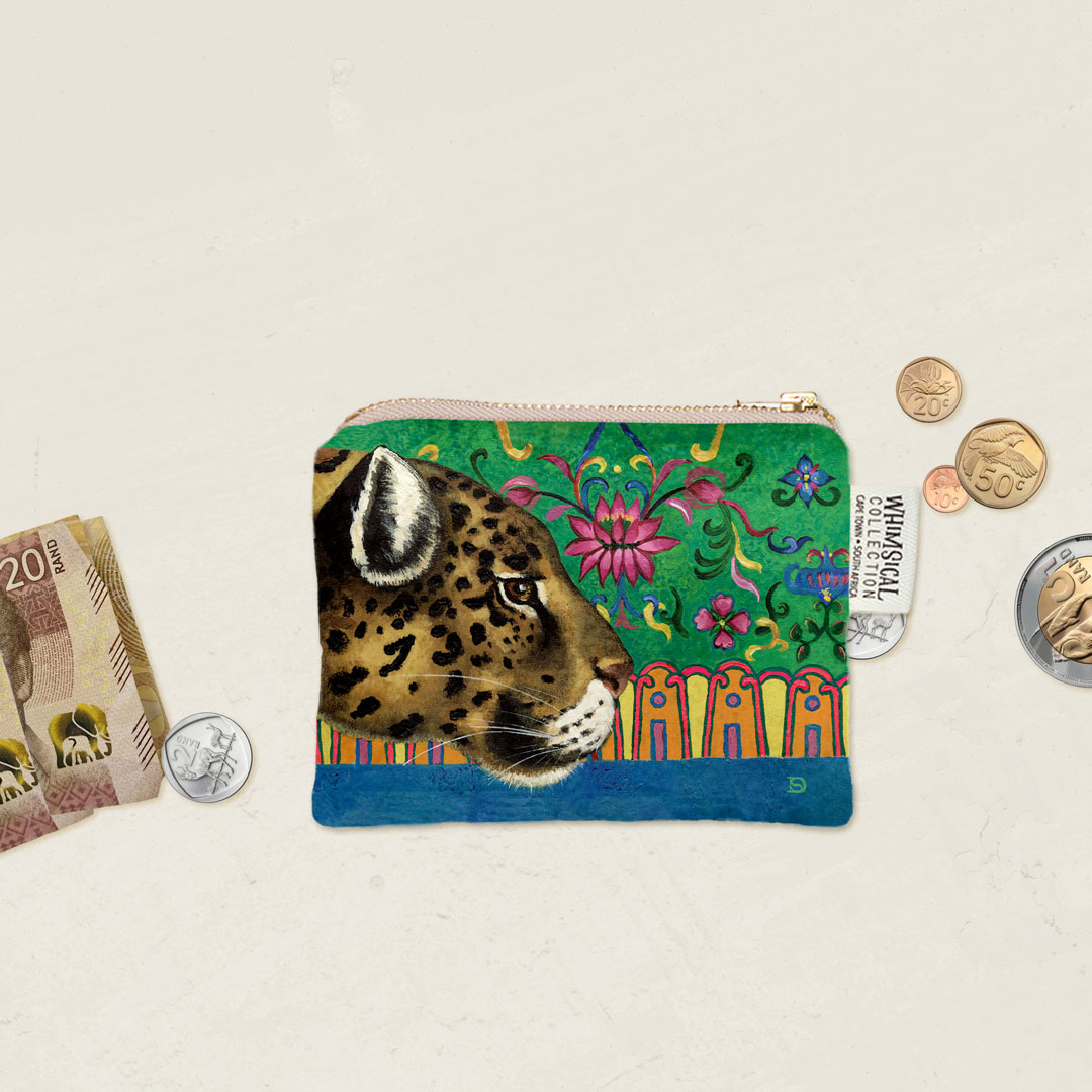 Velvet coin purse featuring 'Leopard Ornament' from Whimsical Collection's 'African Ornaments' range. The original painting was done in oils on canvas by South African artist Dezireë Smith.