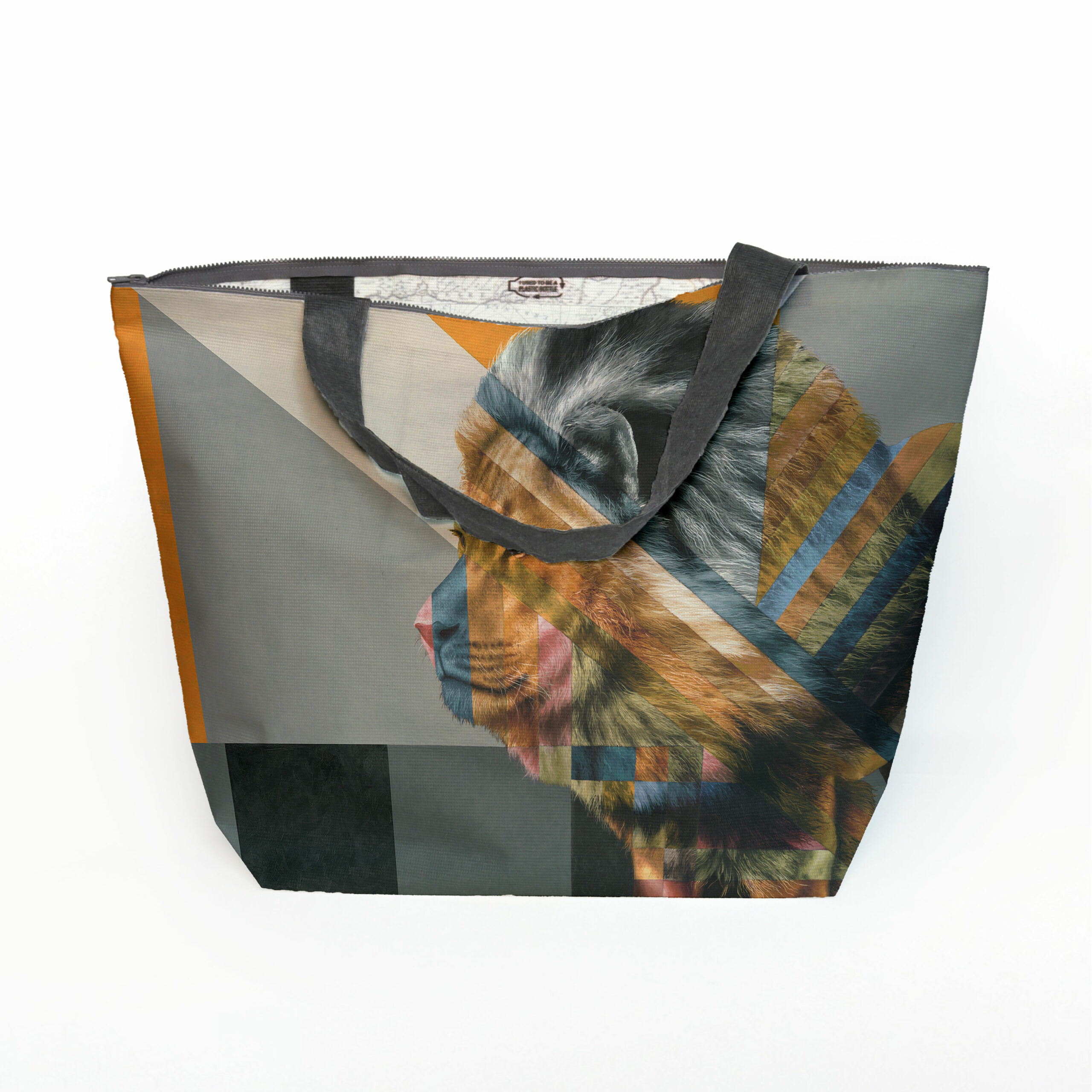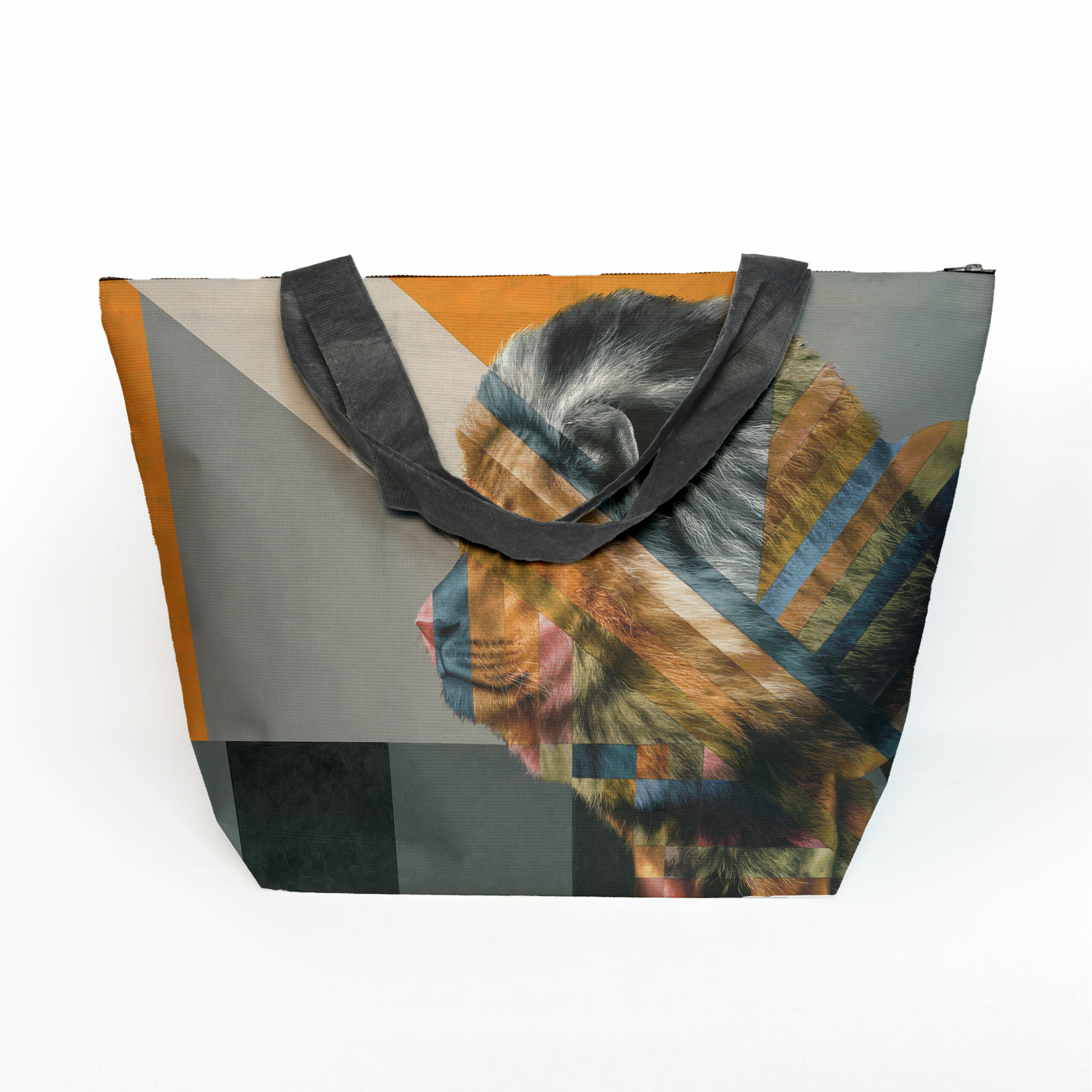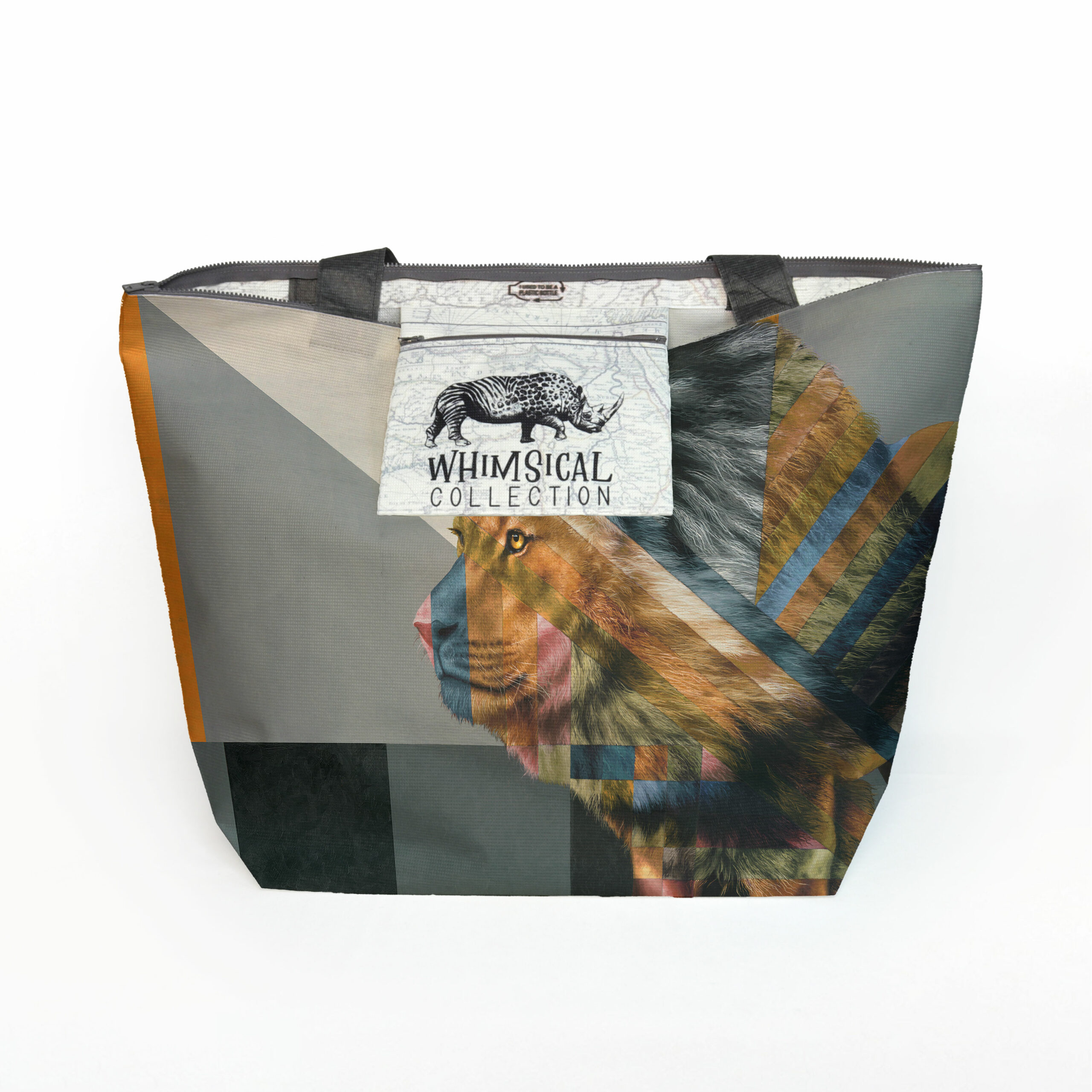 Maxi beach bag made from recycled fabric featuring 'Lion in Shades of Africa' from Whimsical Collection's 'Wildlife in Colour' range. The Shades of Africa range is a colour adaptation of the original 'Wildlife in Colour' paintings done in oils on canvas by South African artist Dezireë Smith.